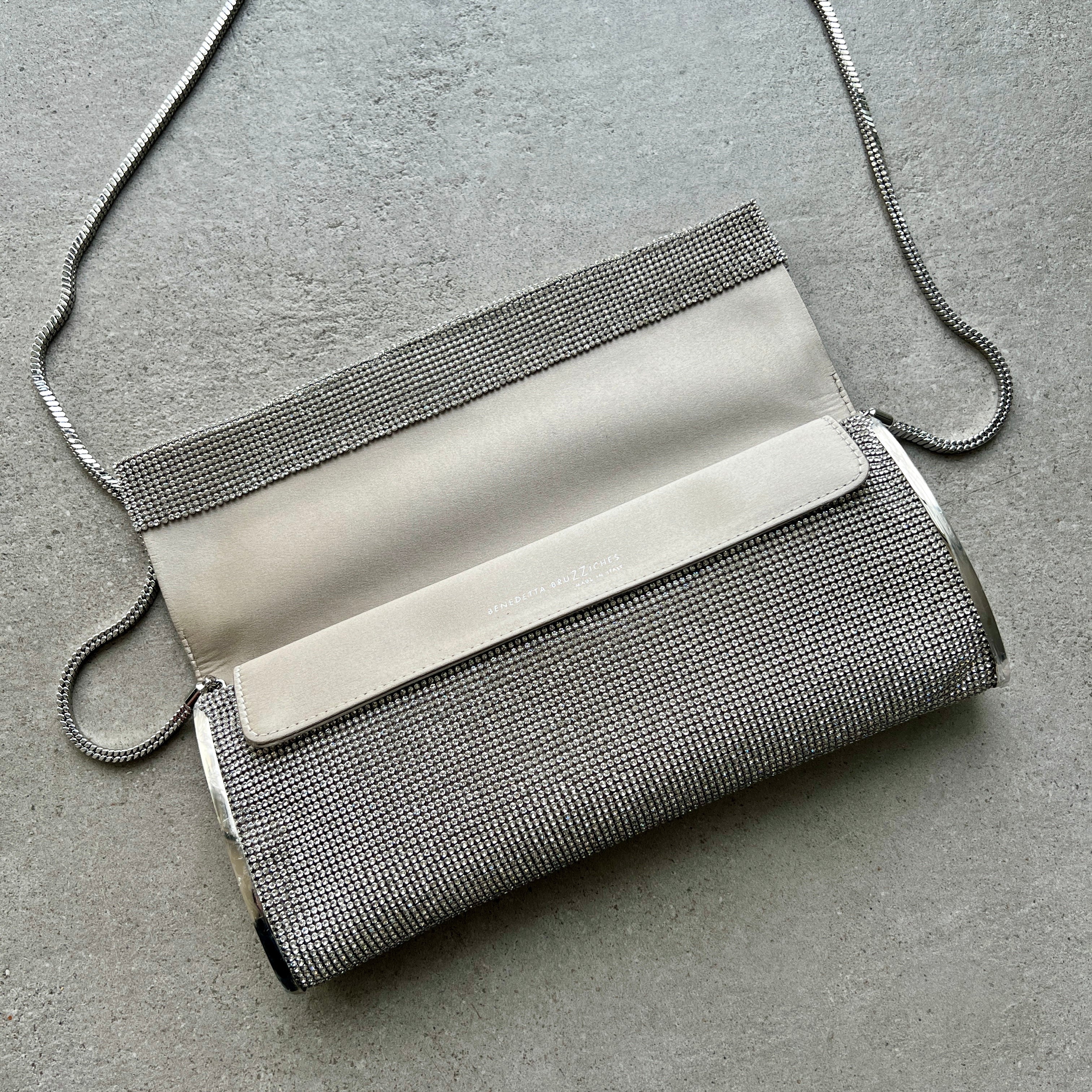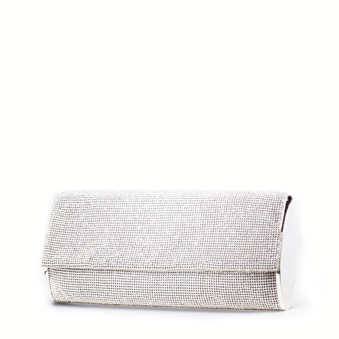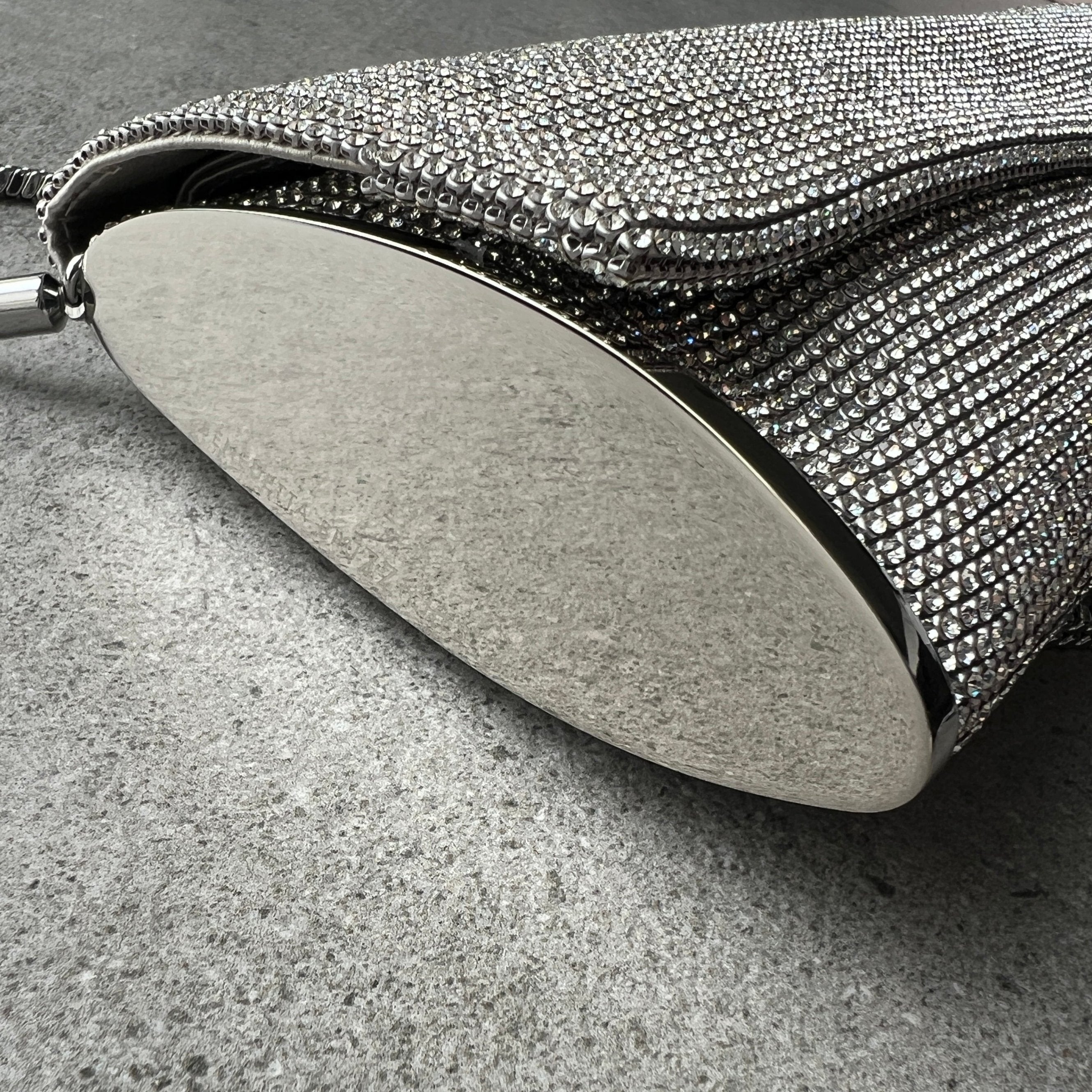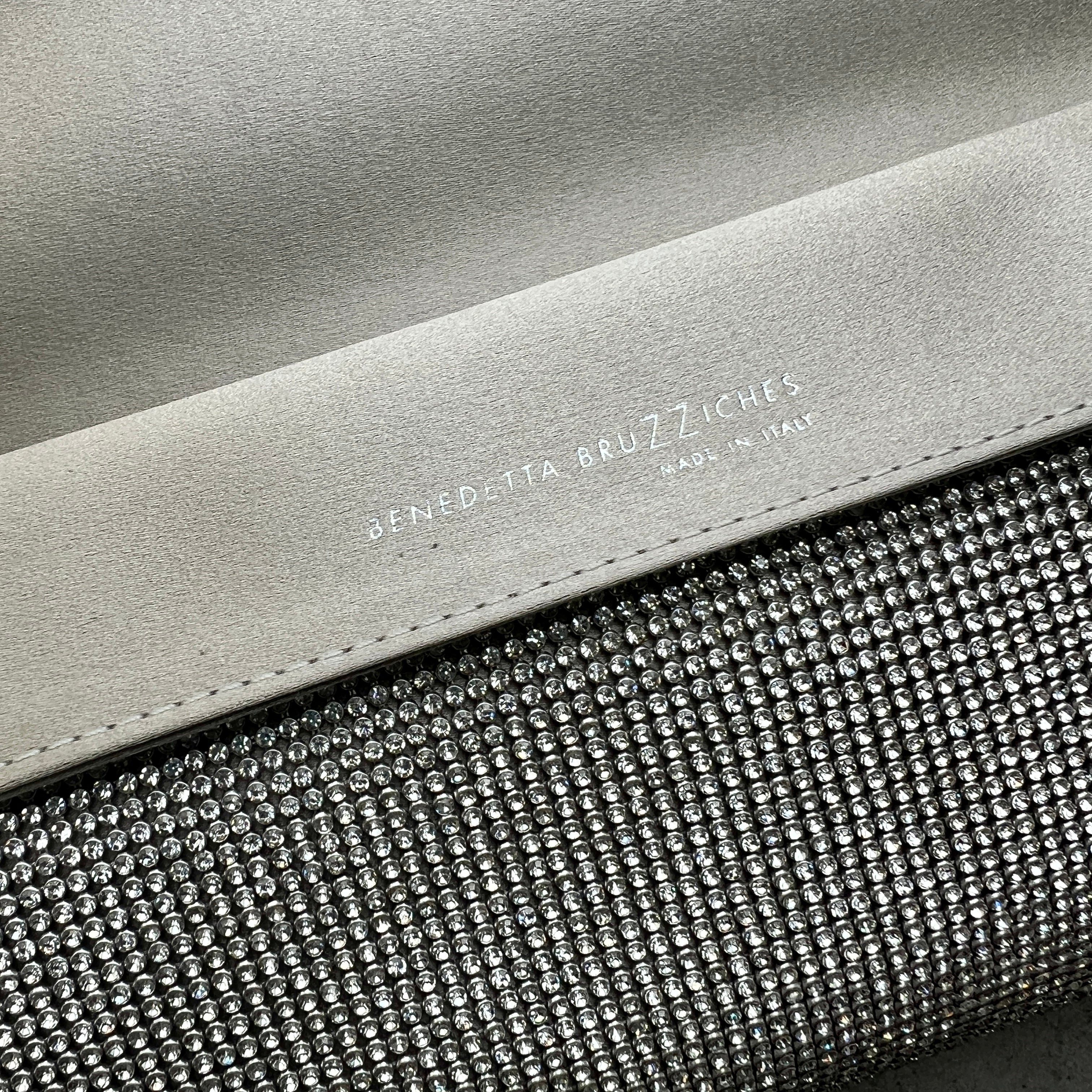 Adorned with two metal oval metal plates and made of pure silk satin and crystal mesh, the Kate features and adjustable shoulder strap that allows for versitile styling and can be worn over the shoulder or cross body in addition to being worn as a clutch bag.