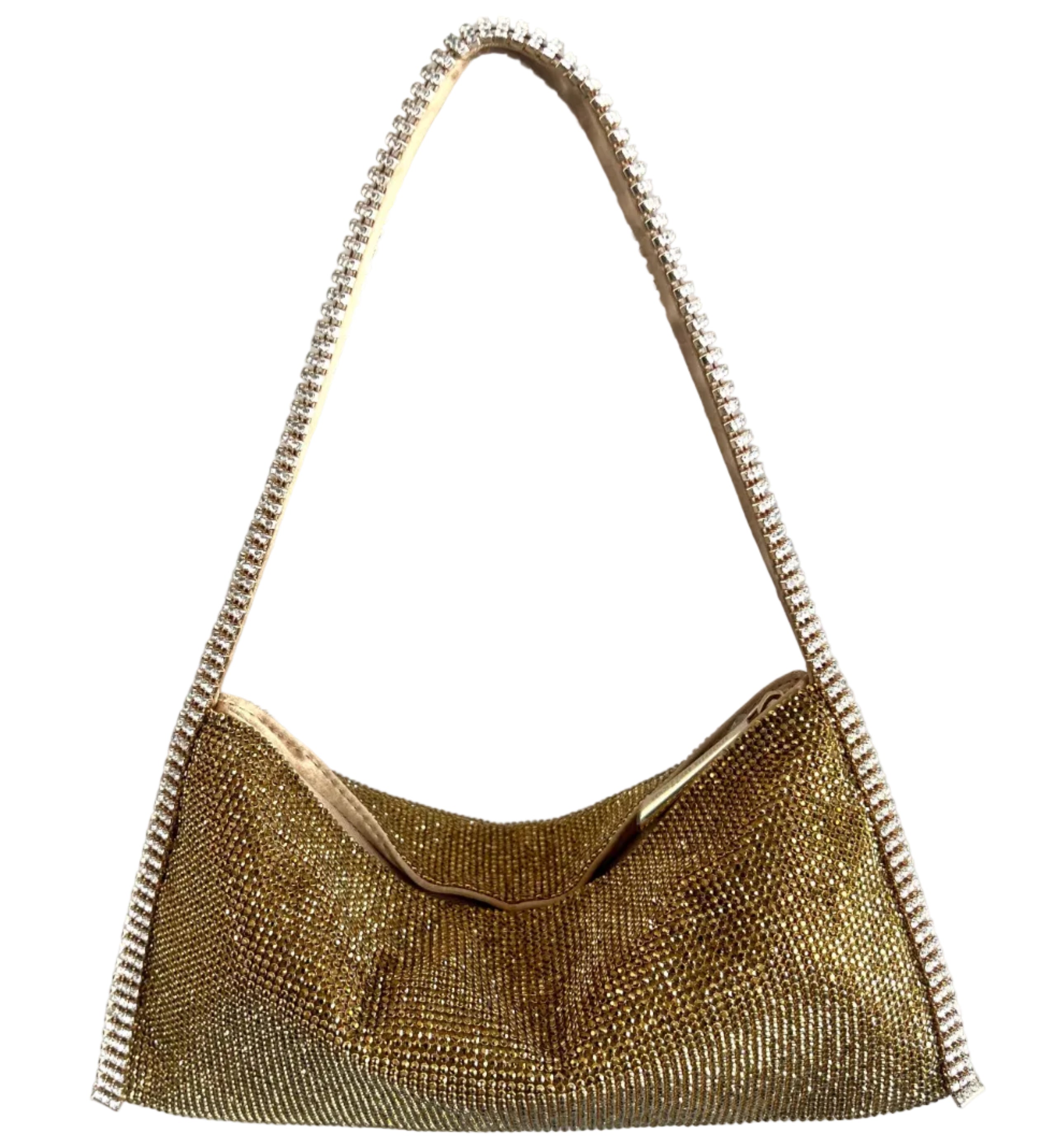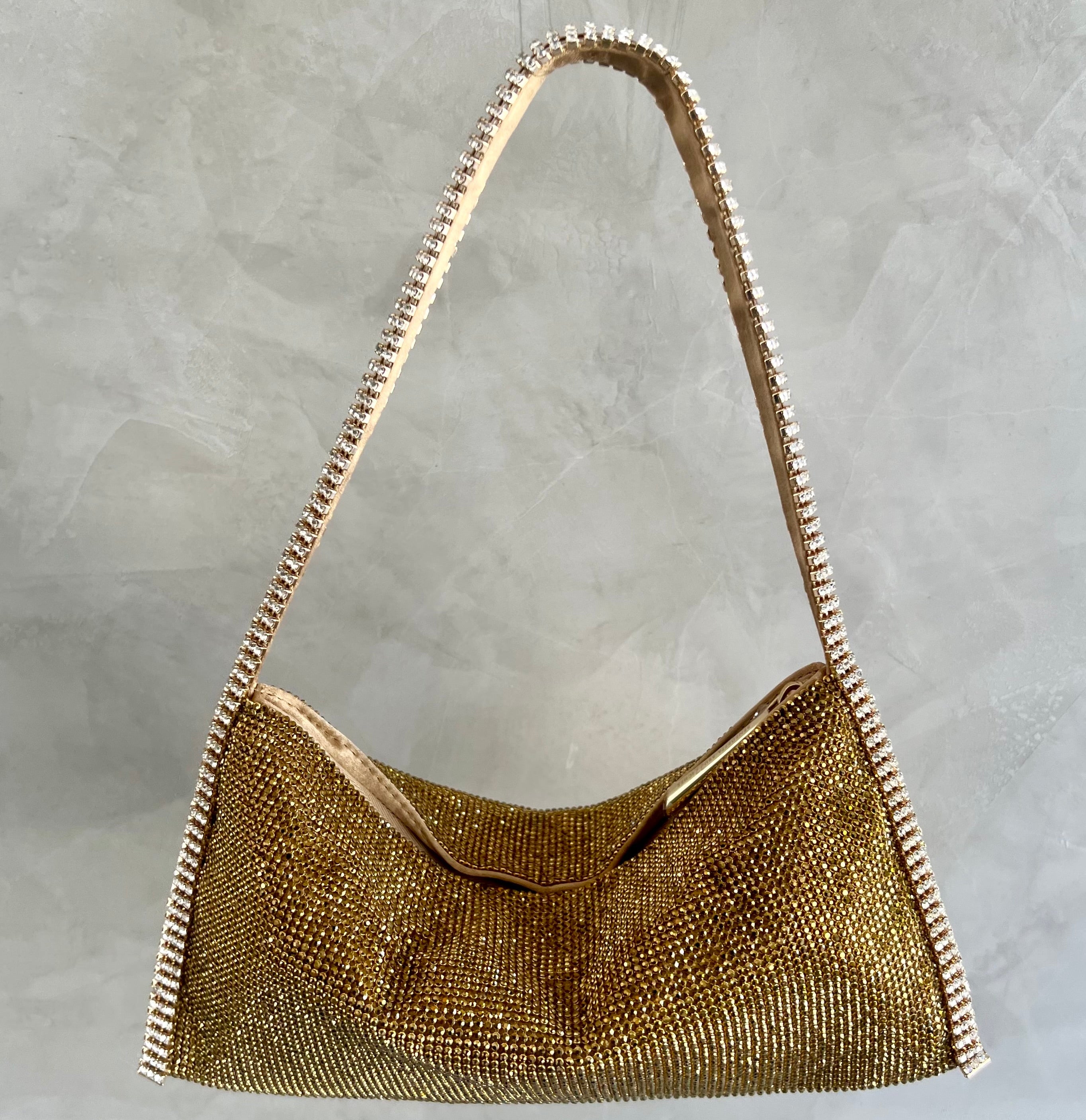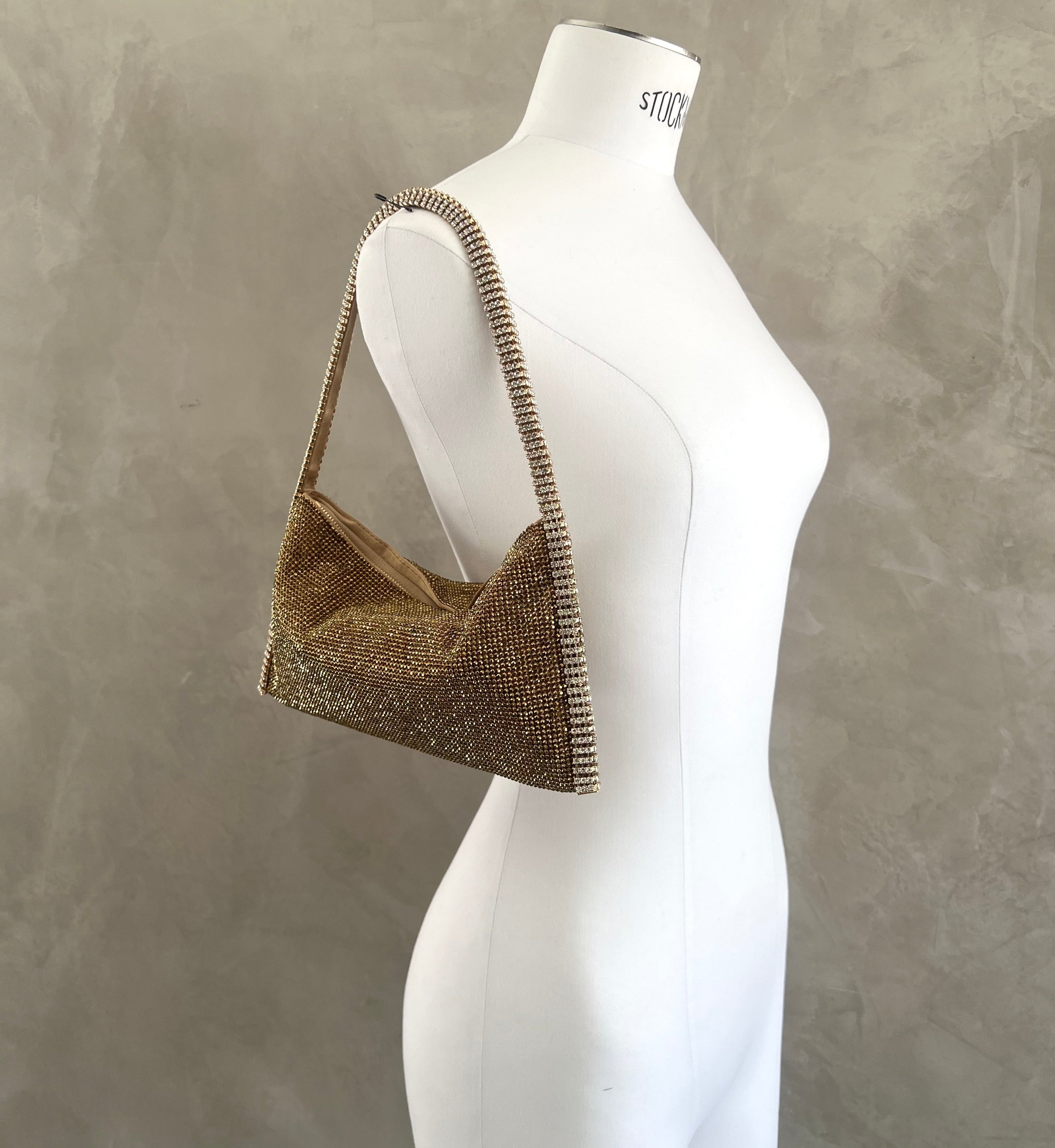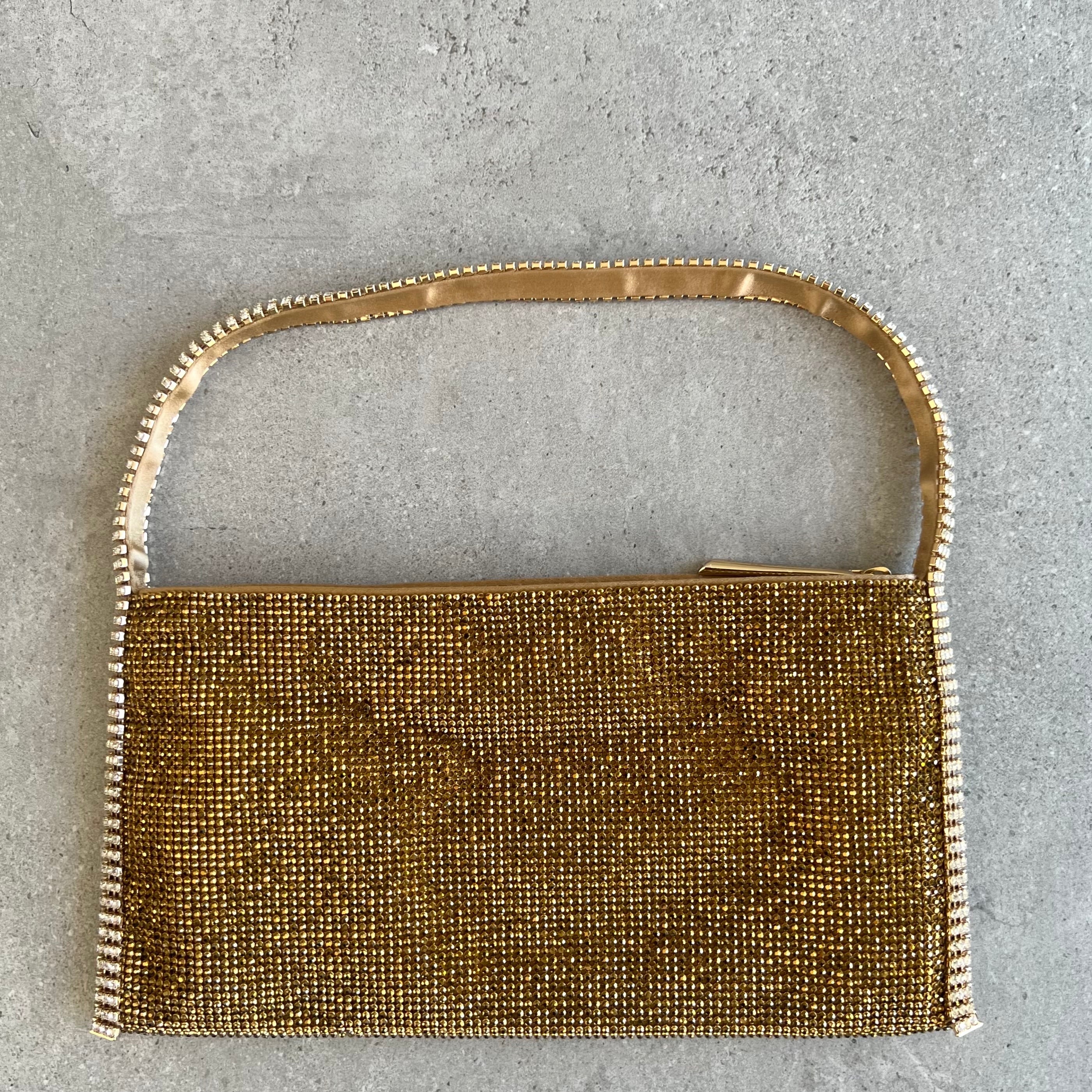 Aluminium mesh studded with crystal rhinestones on organic silk satin pouch.