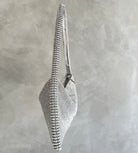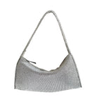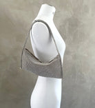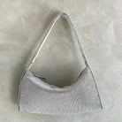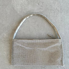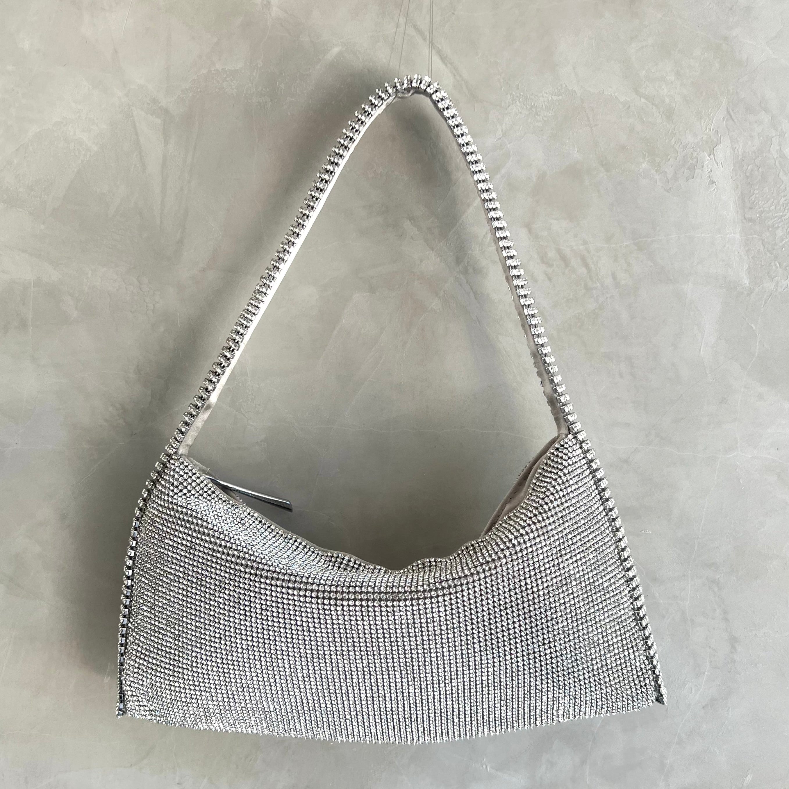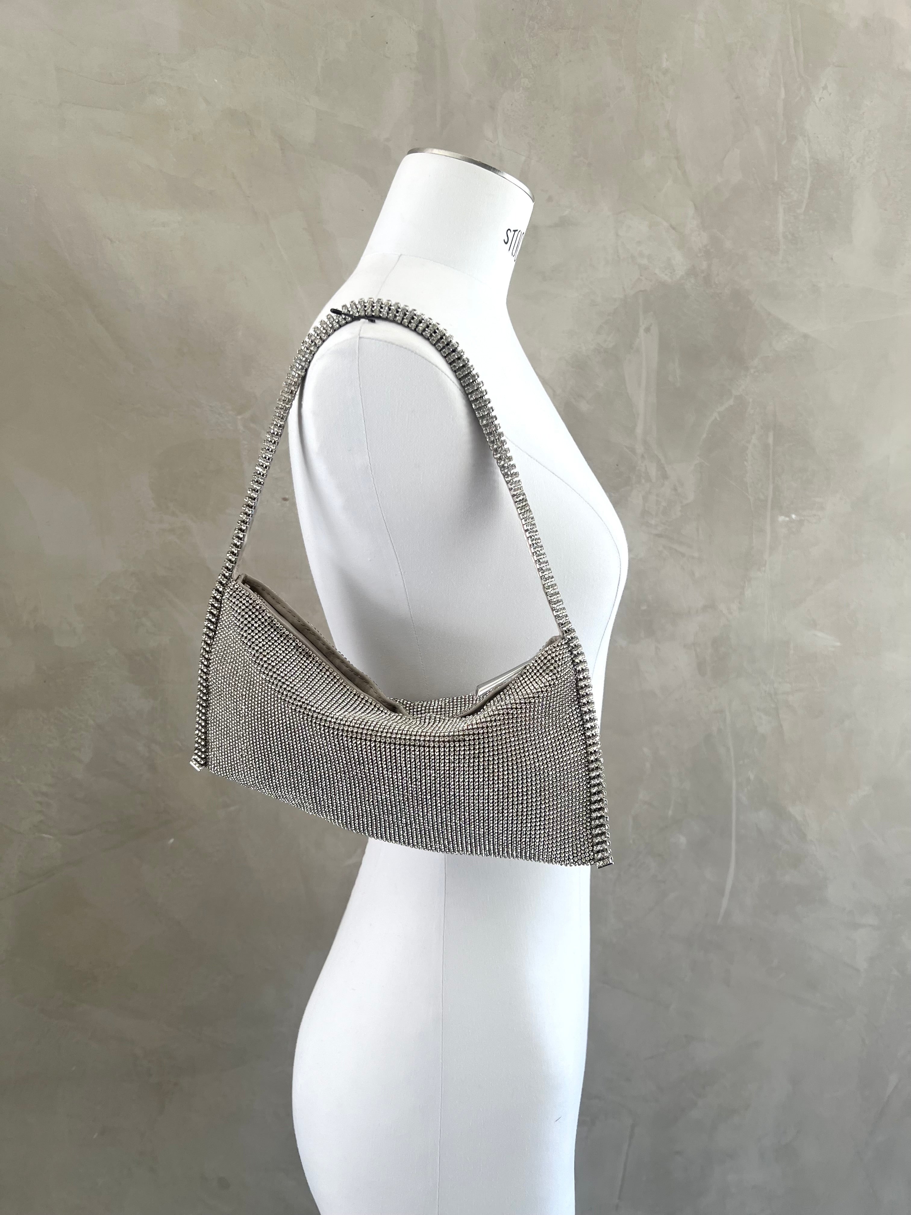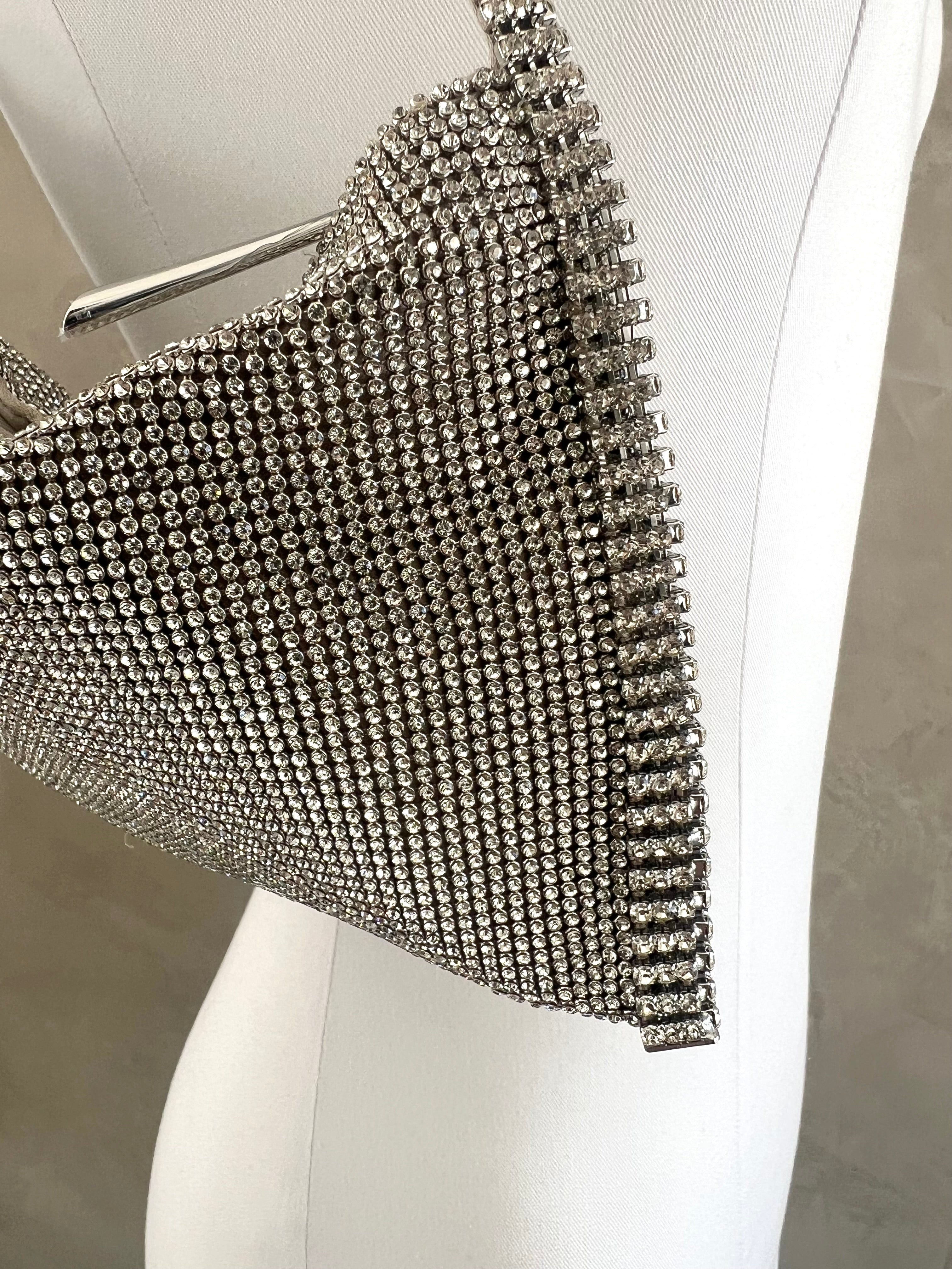 Aluminium mesh studded with crystal rhinestones on organic silk satin pouch.