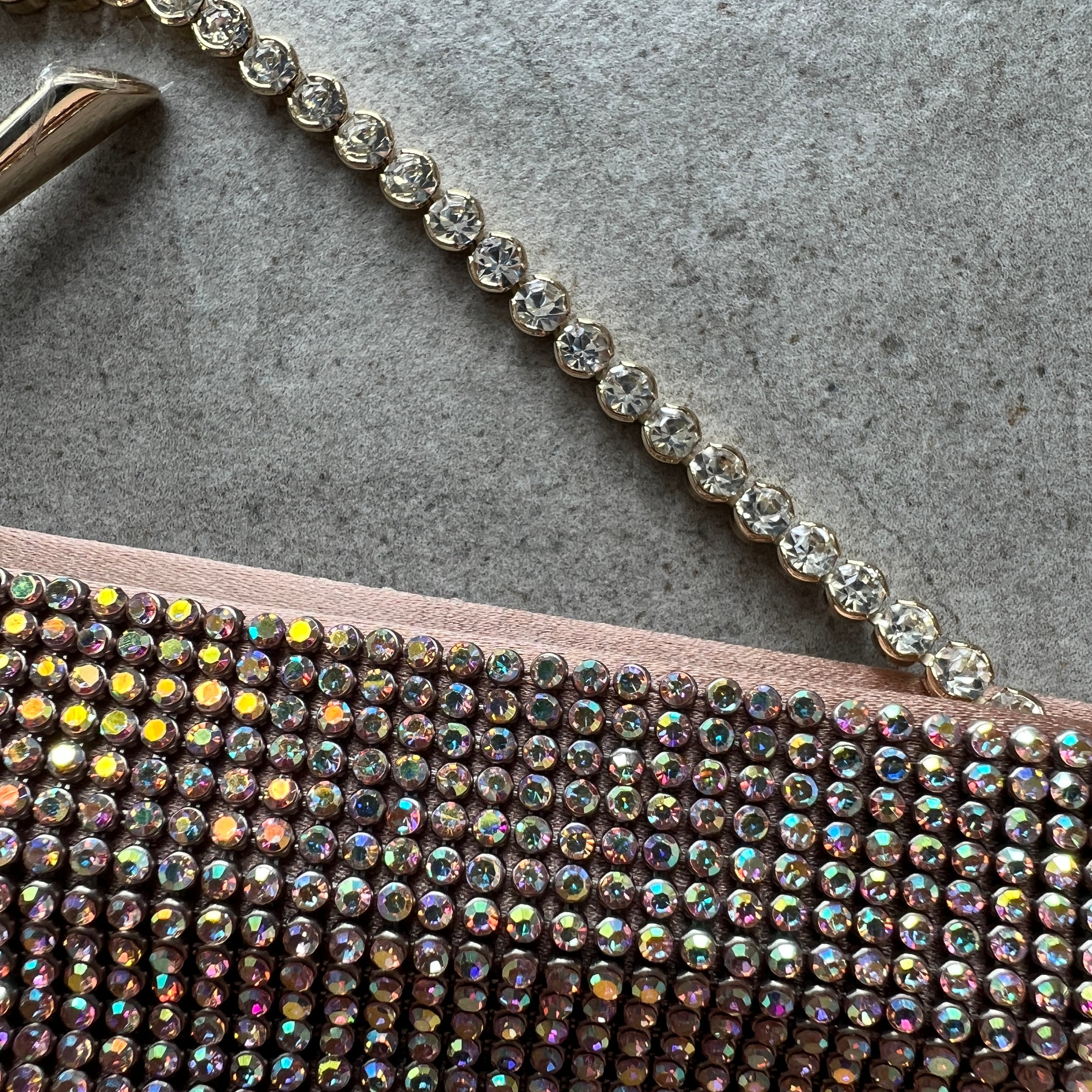 Designed to keep only what is really important, it is a mini clutch made with a soft net of crystals lined with denim, entirely hand-sewn. An elegant crystal shoulder strap allows you to wear it on the shoulder.