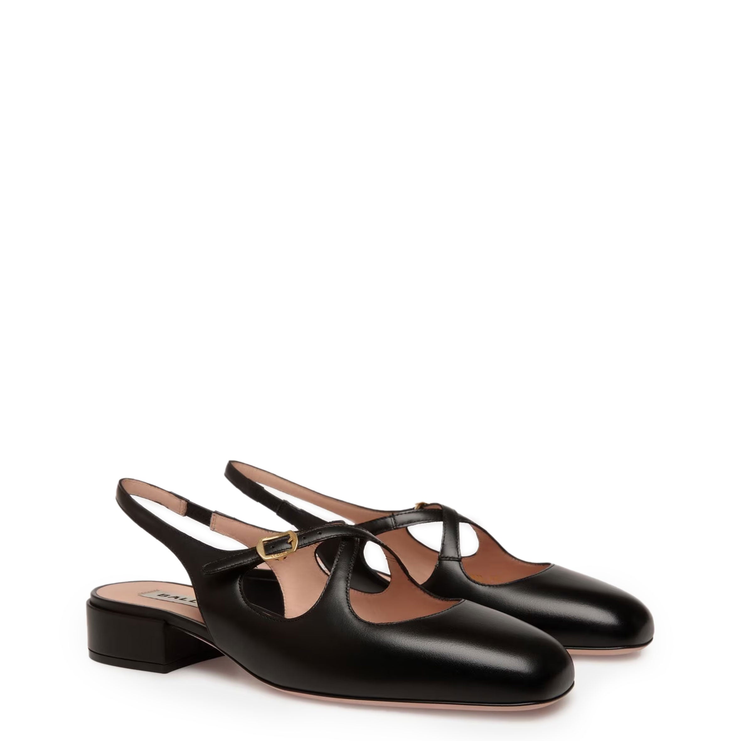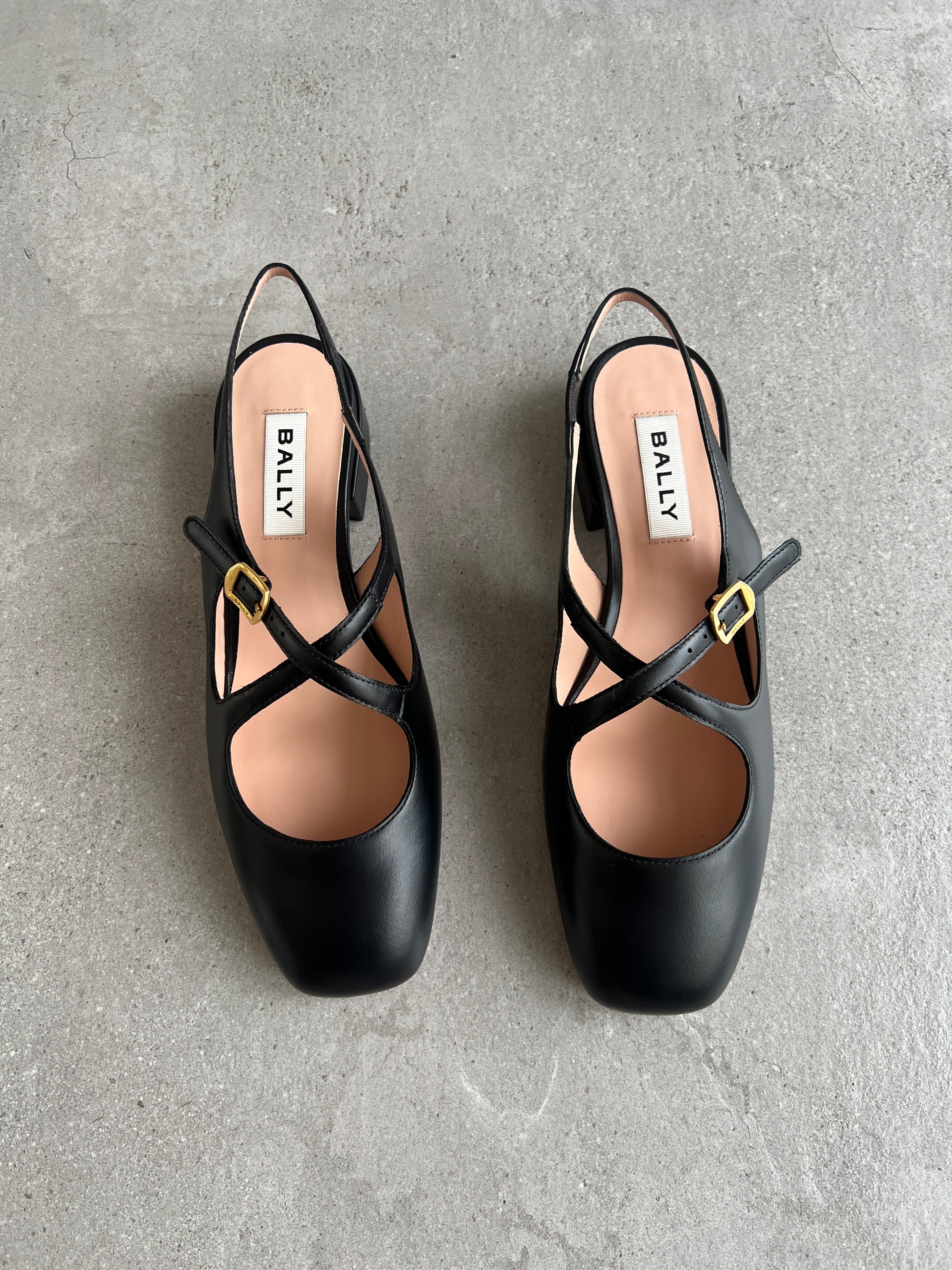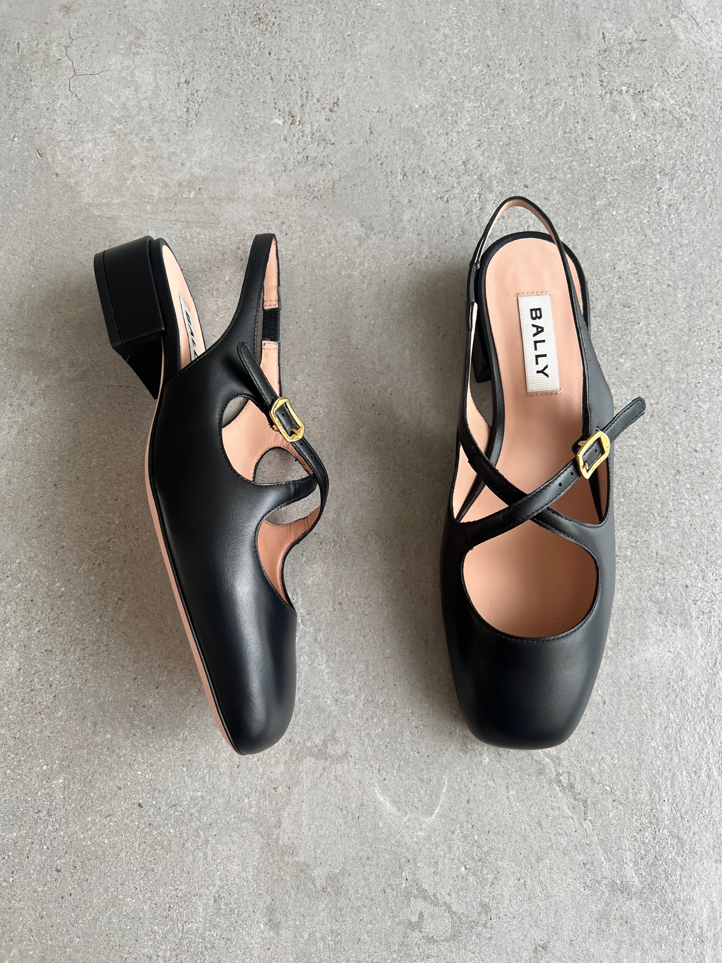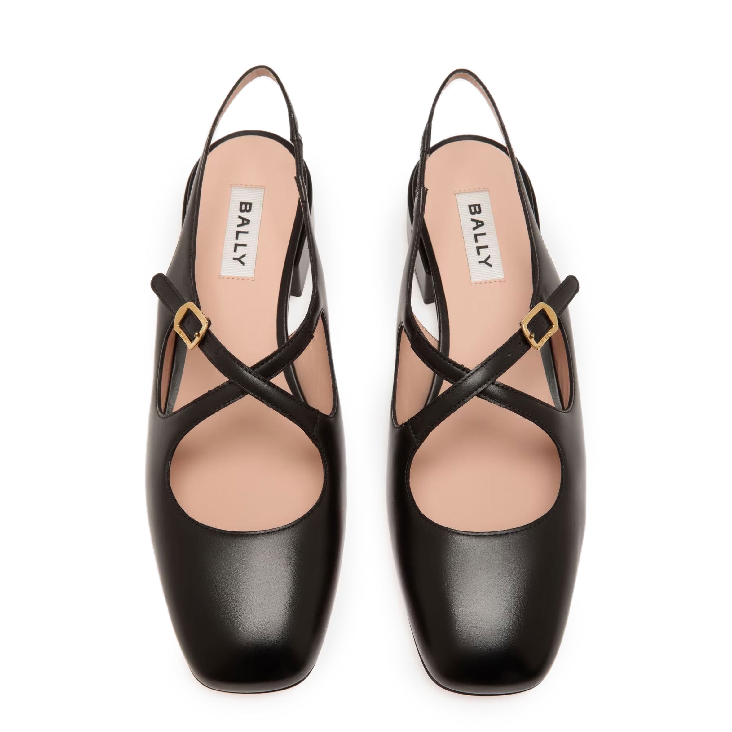 Inspired by an archival design, the Bally Ballyrina slingback pump reimagines classic ballet elegance with a modern twist. Crafted in smooth black leather, this sophisticated style blends the delicate lines of a strappy ballet shoe with the structure of a 40mm stacked heel. A discreet elastic section on the inner side ensures easy pull-on wear, enhancing comfort and convenience. The gold-tone metal buckle, engraved with the iconic Bally logo, adds a refined finishing touch. Reminiscent of pointe shoes, the cross-strap ribbon detailing brings graceful femininity to every step.