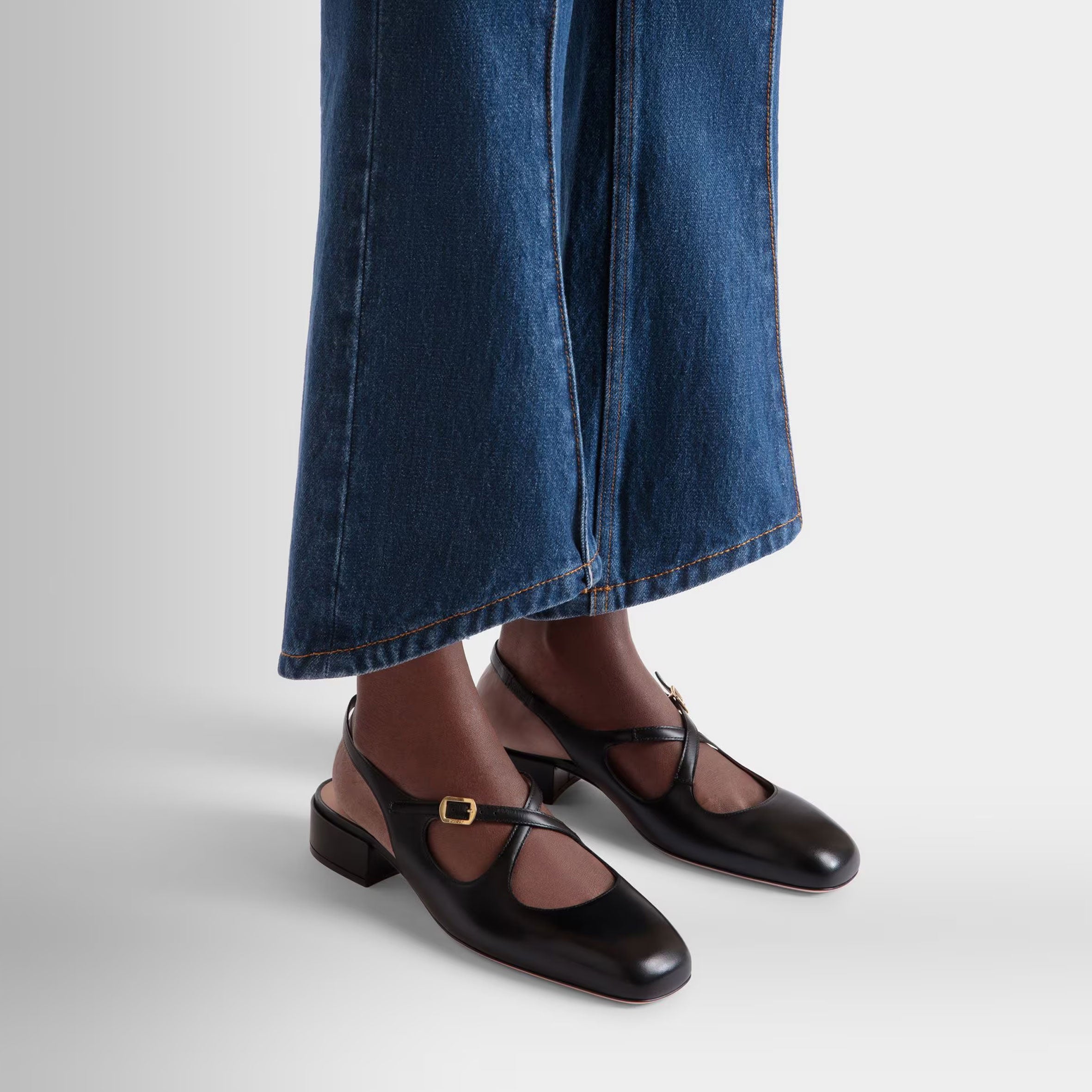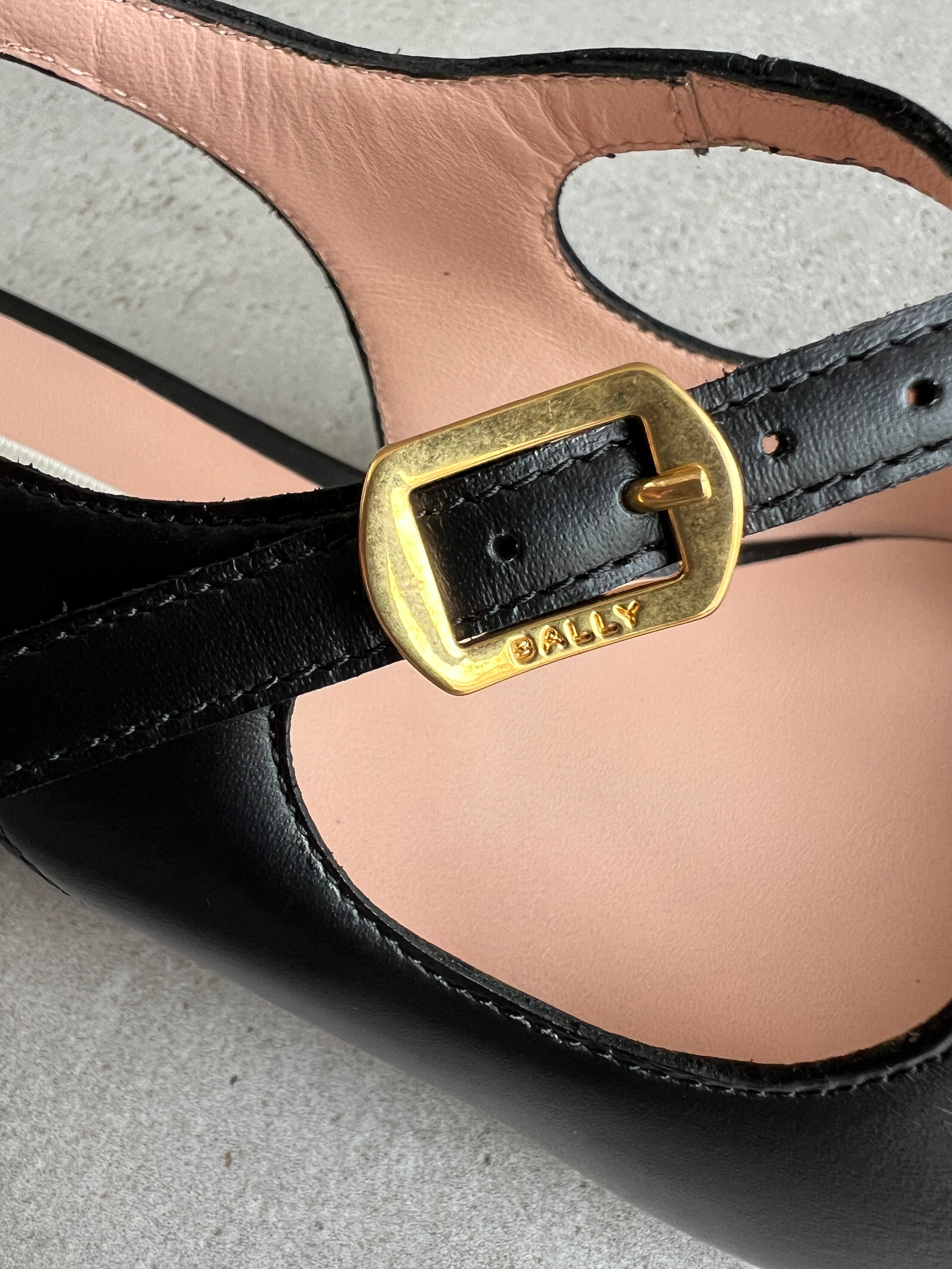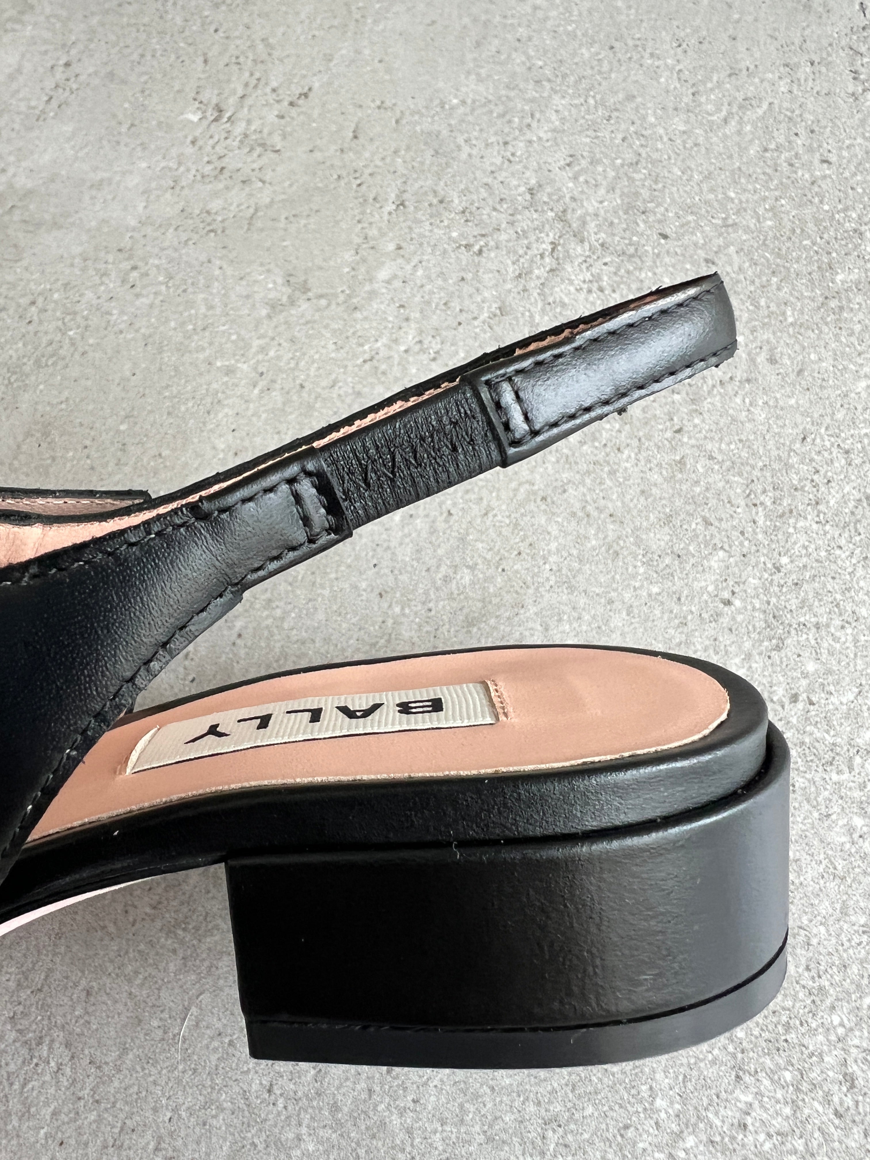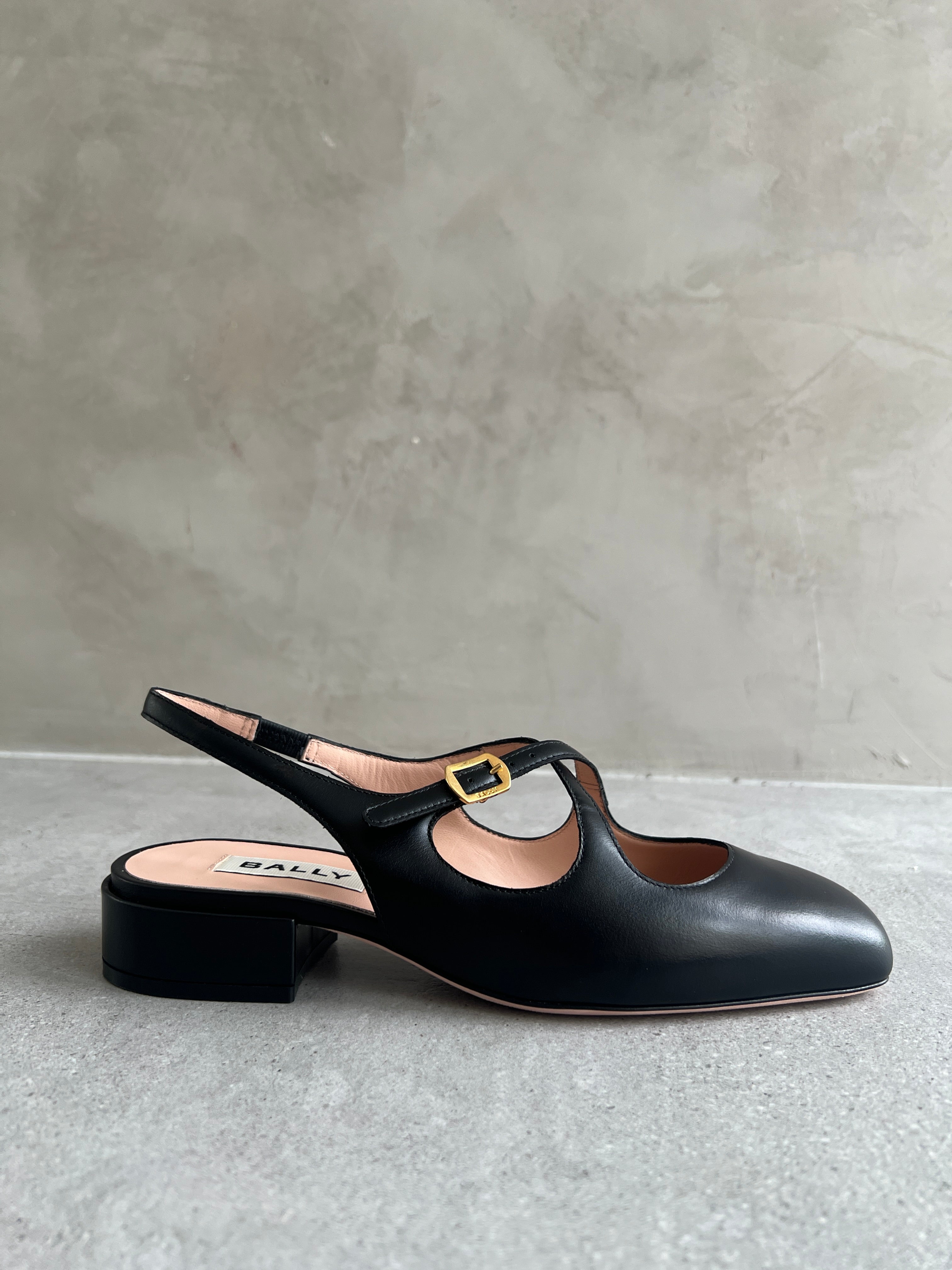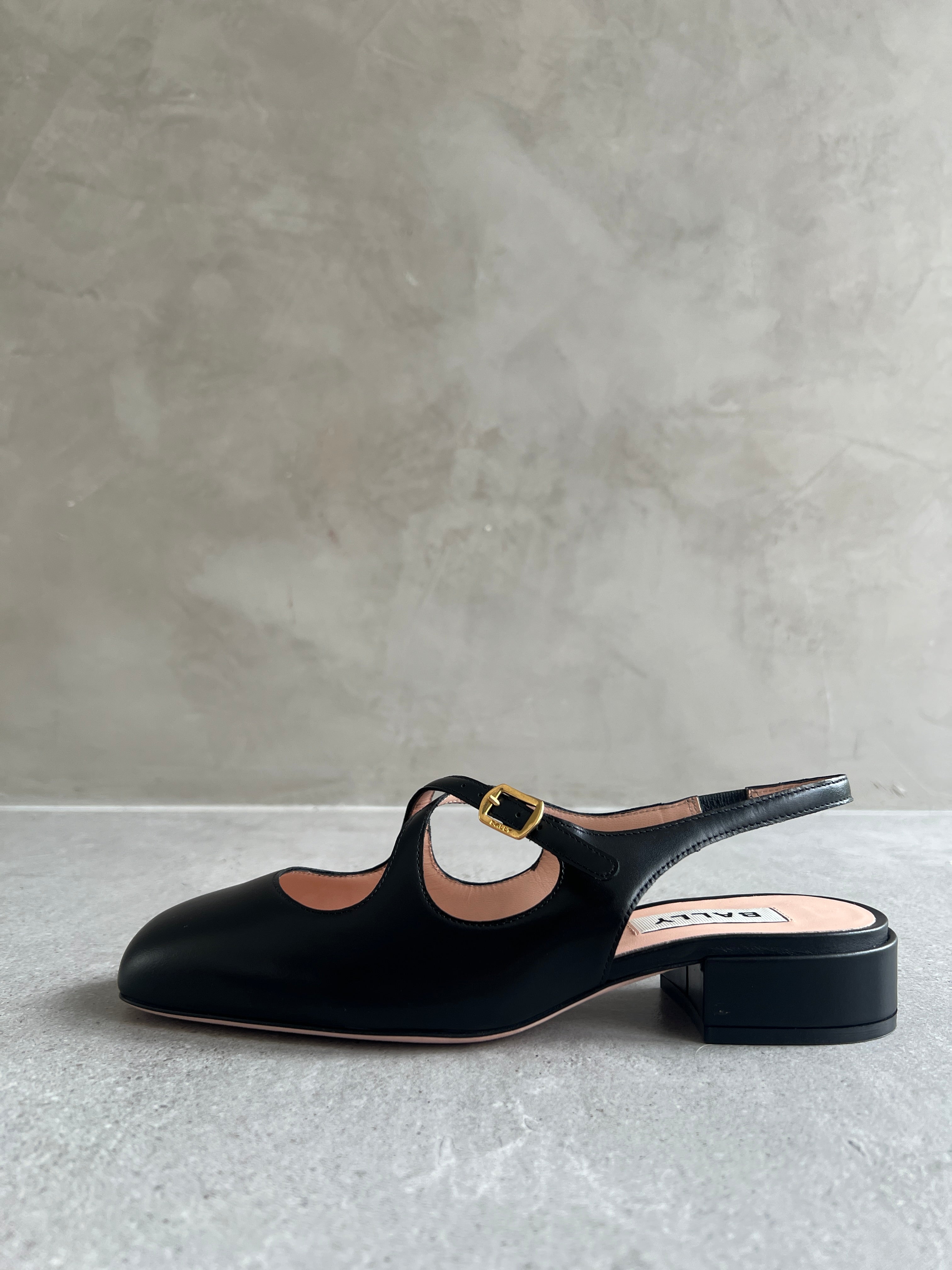 Inspired by an archival design, the Bally Ballyrina slingback pump reimagines classic ballet elegance with a modern twist. Crafted in smooth black leather, this sophisticated style blends the delicate lines of a strappy ballet shoe with the structure of a 40mm stacked heel. A discreet elastic section on the inner side ensures easy pull-on wear, enhancing comfort and convenience. The gold-tone metal buckle, engraved with the iconic Bally logo, adds a refined finishing touch. Reminiscent of pointe shoes, the cross-strap ribbon detailing brings graceful femininity to every step.