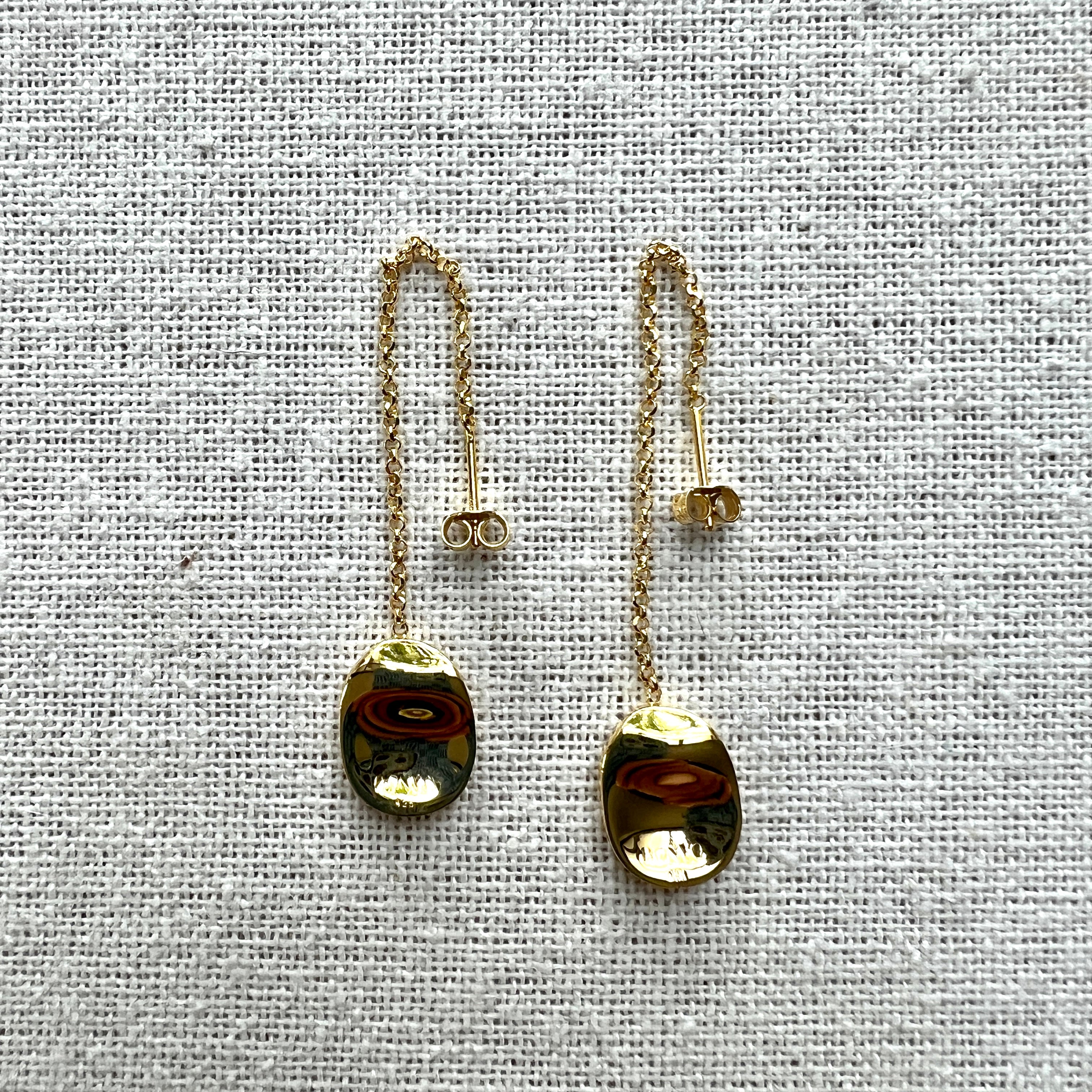 Chain thread earrings, ended Into an oval, curvy disk. Weight: 6.20gm