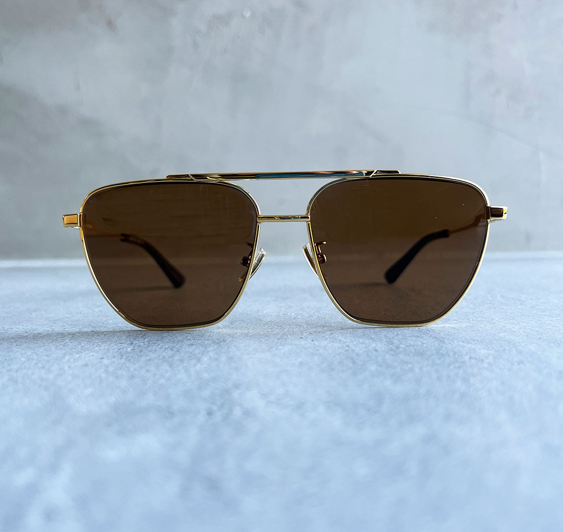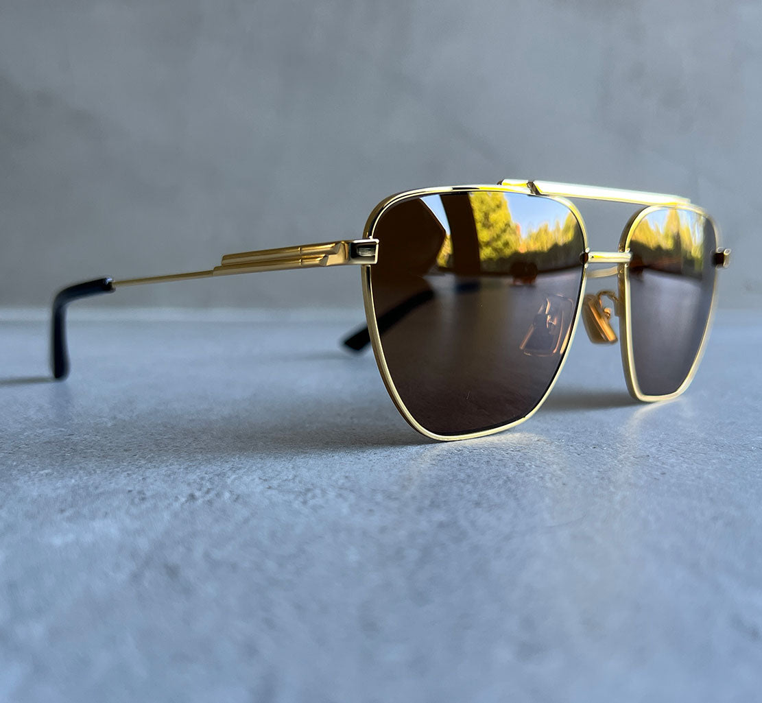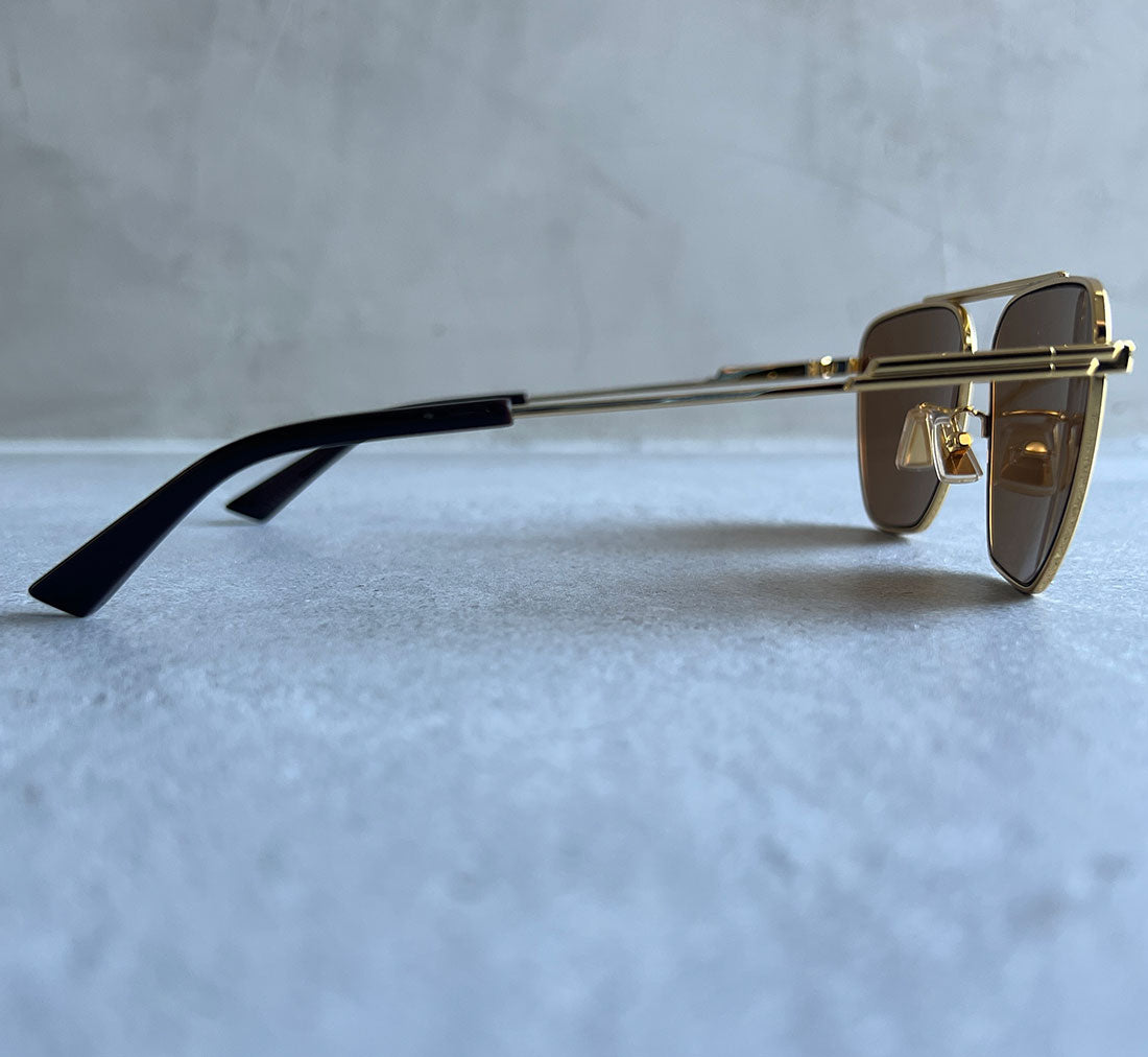 Bottega Veneta Minimalist Aviator sunglasses collection model BV1236S in shiny gold featuring solid brown lens. Inspired by Italian culture with a global outlook. Featuring faceted effects, sculptural contours, geometric profiles on acetate and the iconic three-dimensional ribbons.