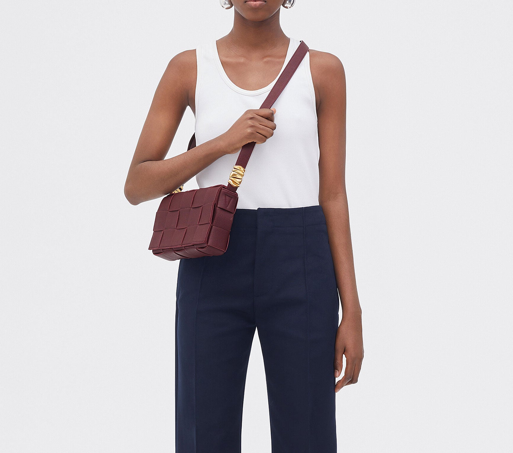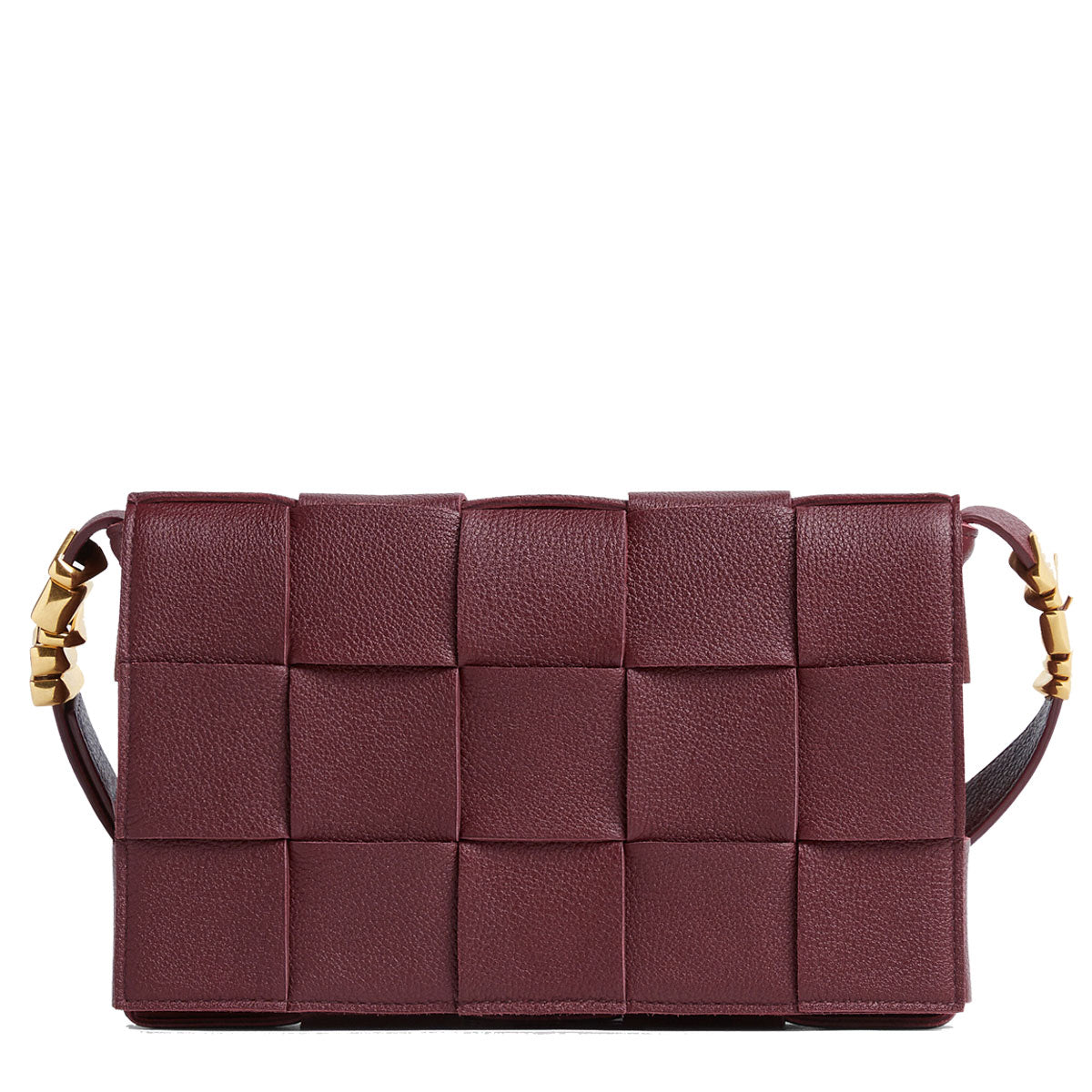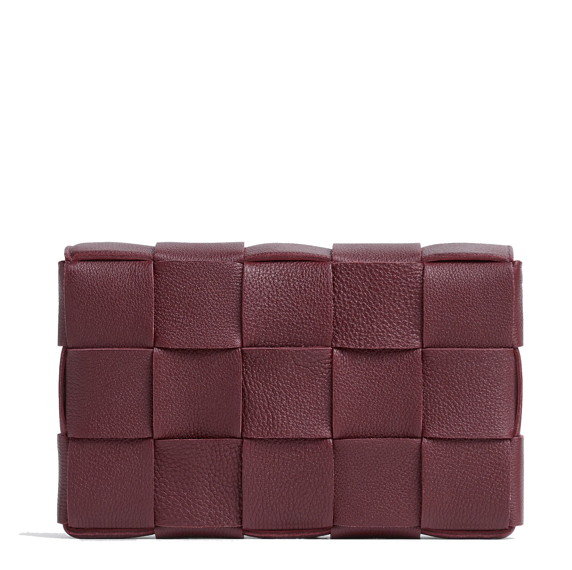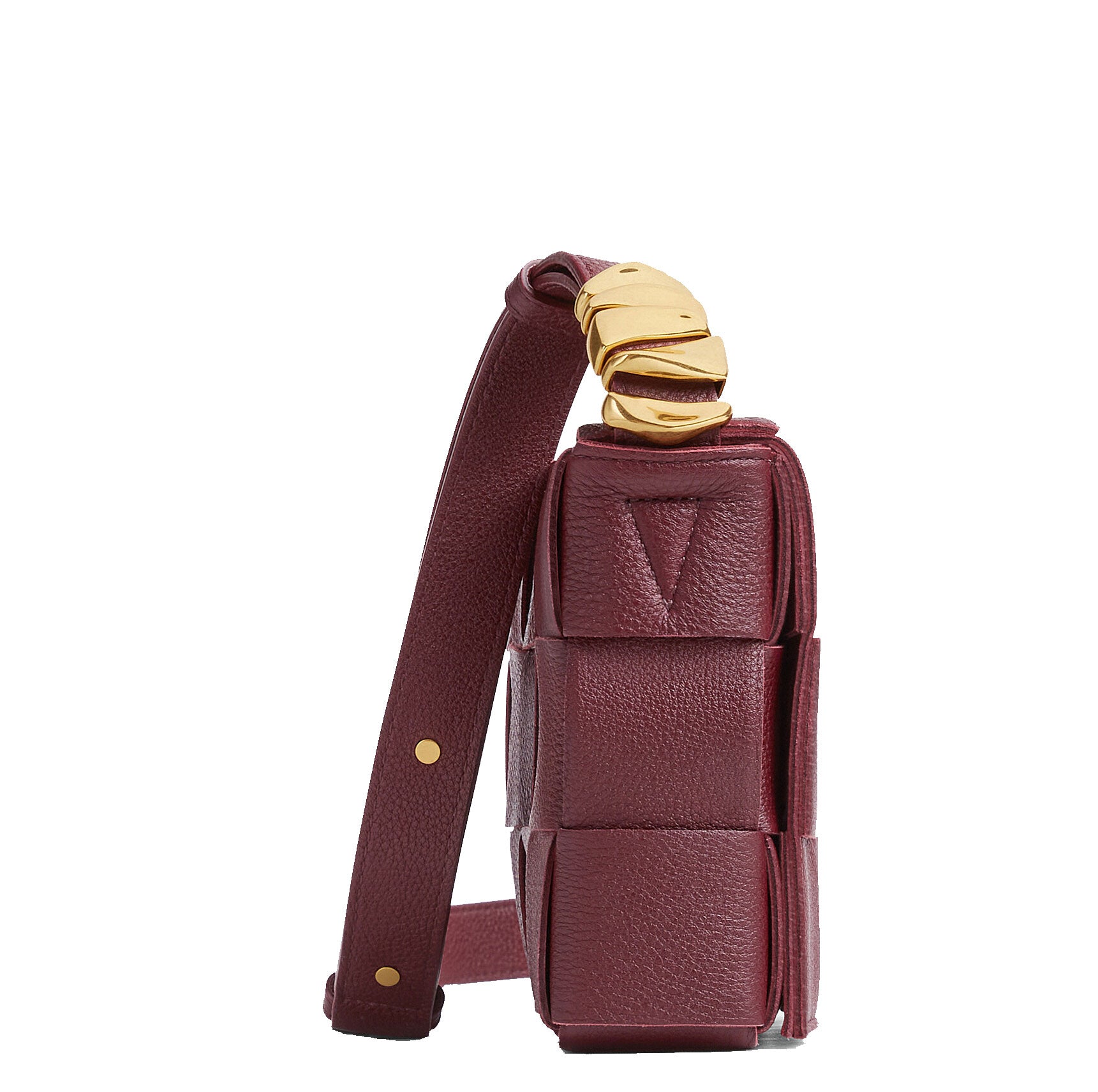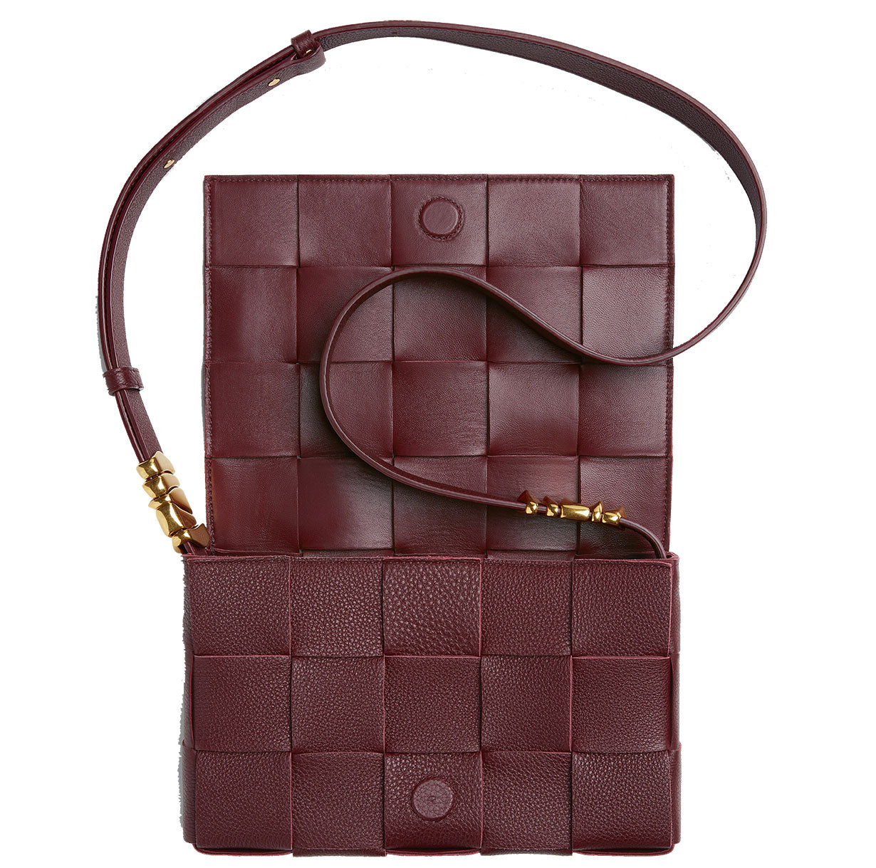 Crossbody bag in a double-face maxi weave with opulent gold hardware on shoulder strap. Made with wide double-face nappa strips in an orthogonal weave. Interior is identical to exterior; fitted with a zipped pocket and magnetic closure. Strap folds inside bag to carry as a clutch. Slim, adjustable shoulder strap.