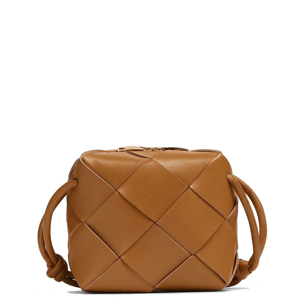 Bottega Veneta's signature Loop Mini bag is now available in their cassette weave. This crossbody bag has a soft edge boxy shape crafted from lamb leather and features double knotted side details on the strap, zip top closure and bonded lambskin lining.