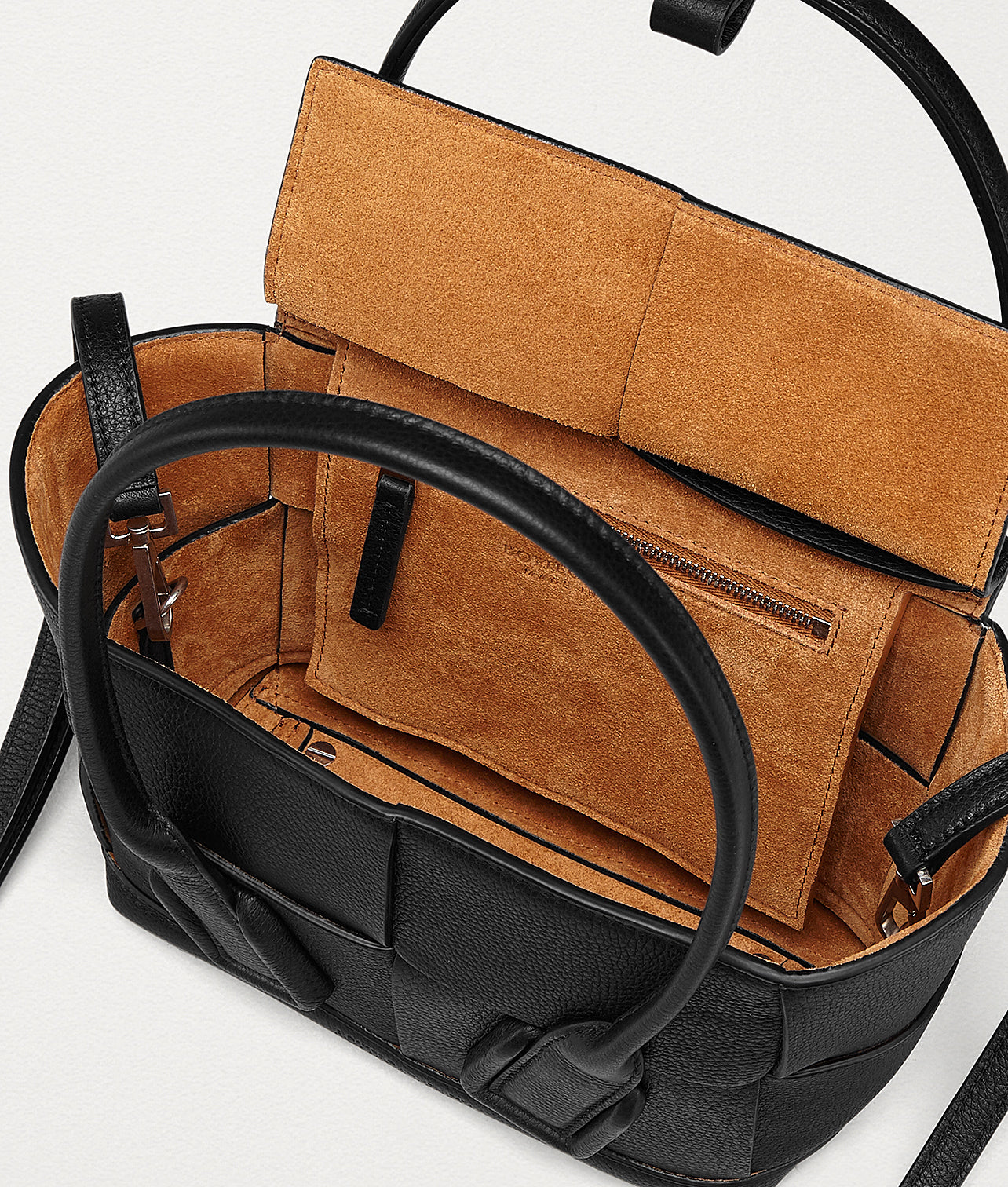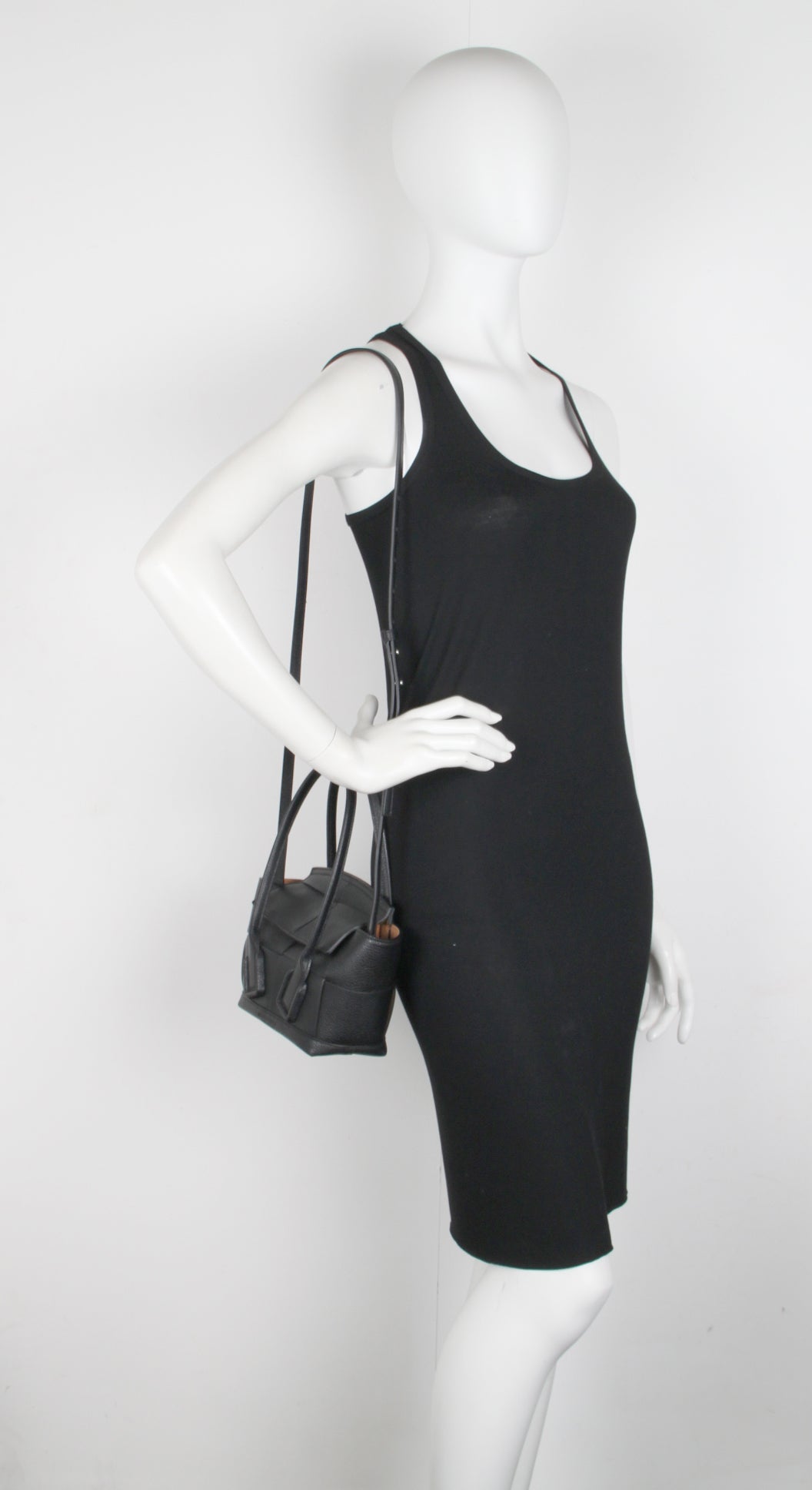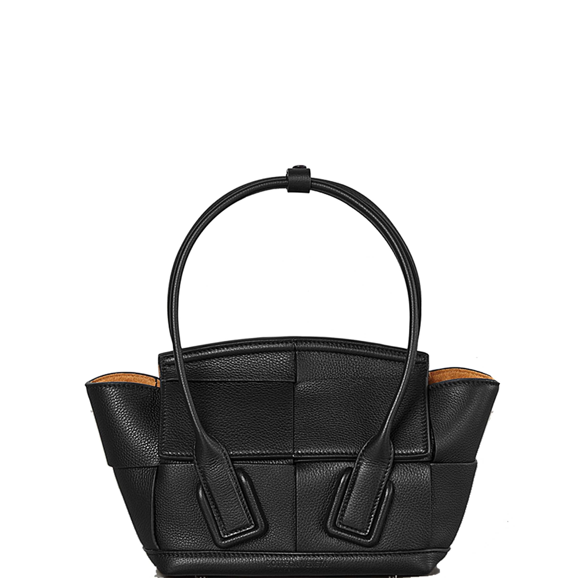 Bottega Veneta Mini Acro. Top-handle mini bag in an orthogonal maxi weave. Made from grained leather with a natural finish. Arc-shaped top panel with curved handles. Rolled leather handles secured with a snap-button leather loop. Finished with a fine contrast saddle stitch. Bonded suede interior with one zipped pocket and two open pockets
