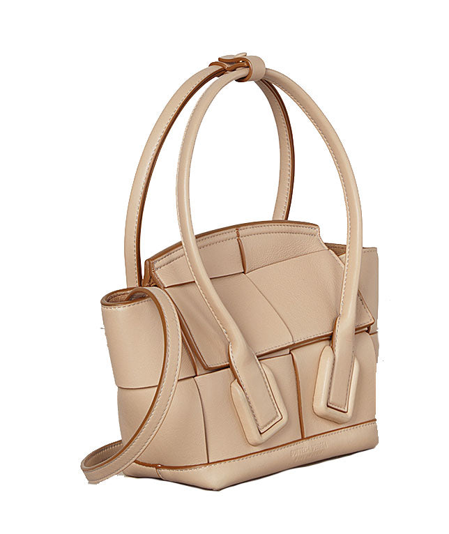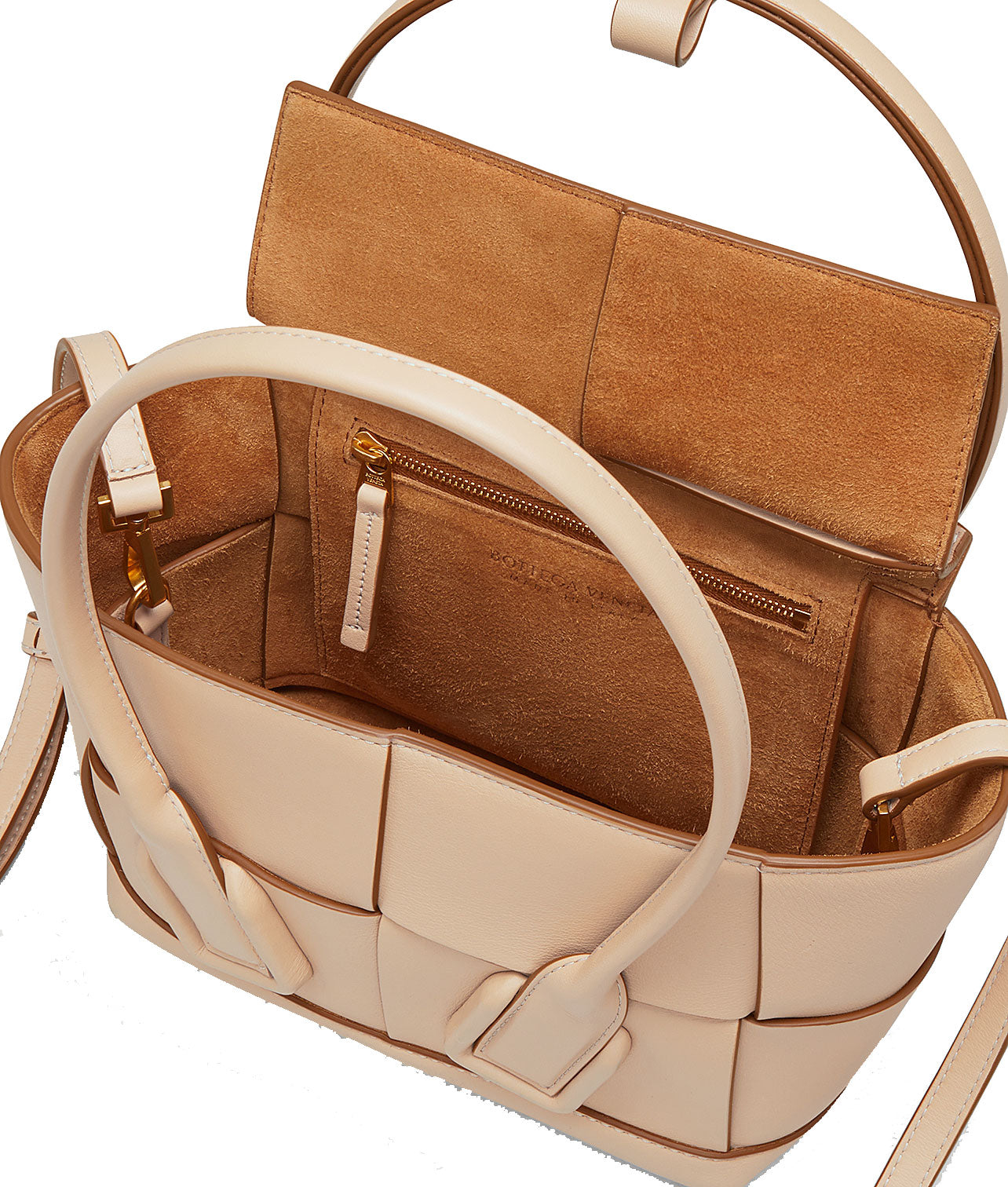 Bottega Veneta Mini Arco. Top-handle mini bag in an orthogonal maxi weave. Made from French Calf with a natural finish. Arc-shaped top panel with curved handles. Rolled leather handles secured with a snap-button leather loop. Finished with a fine contrast saddle stitch. Bonded suede interior with one zipped pocket and two open pockets.