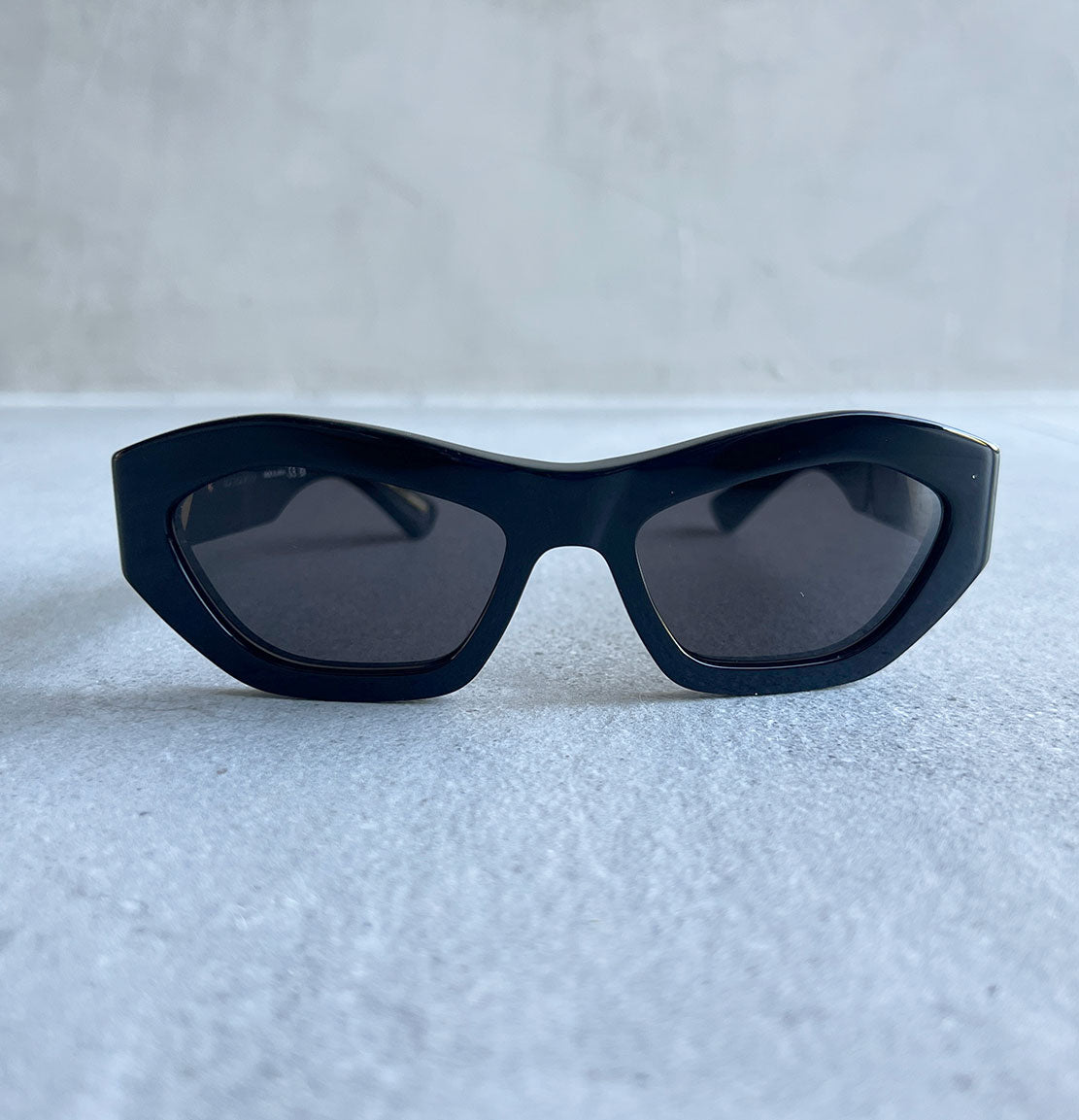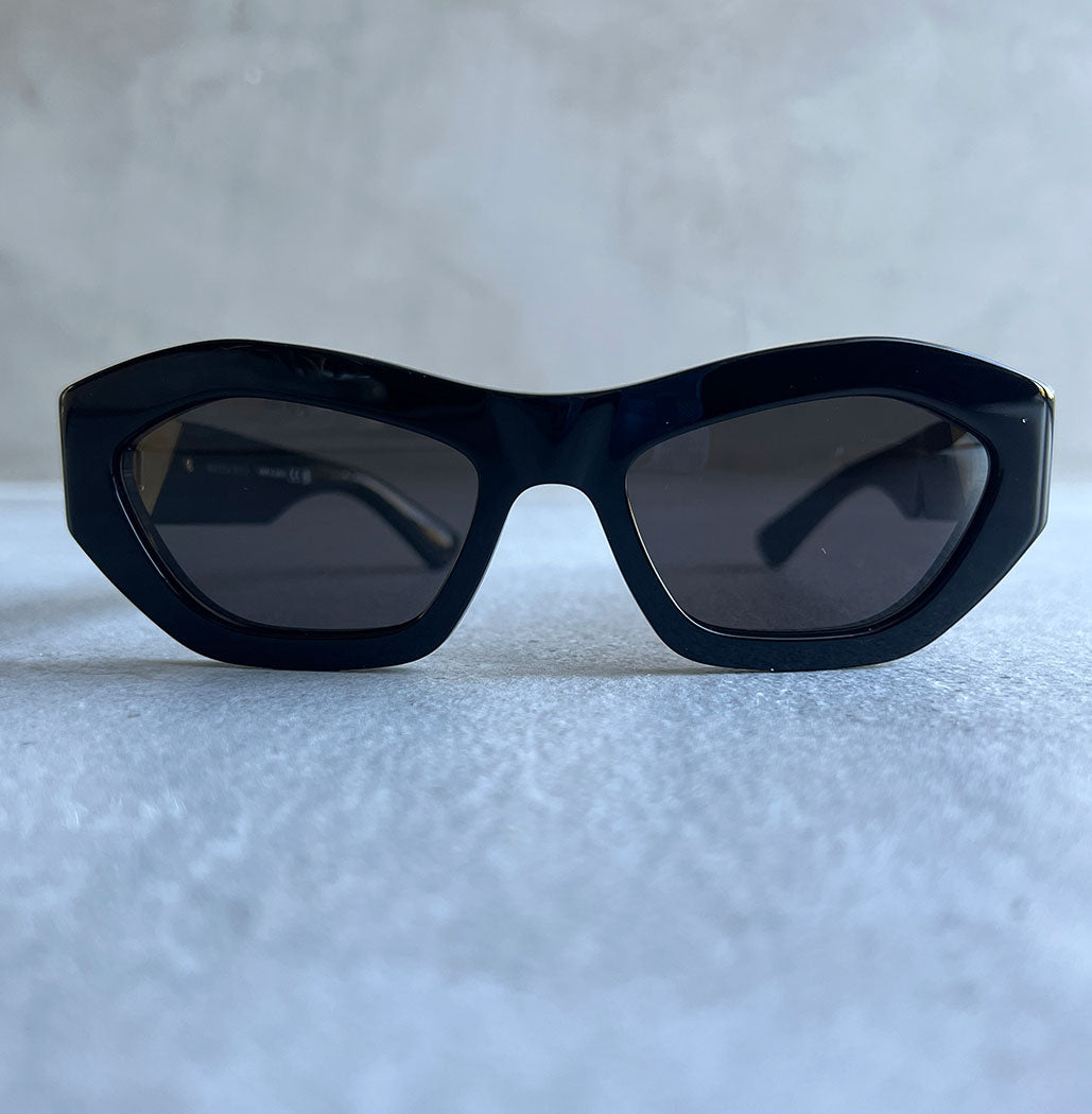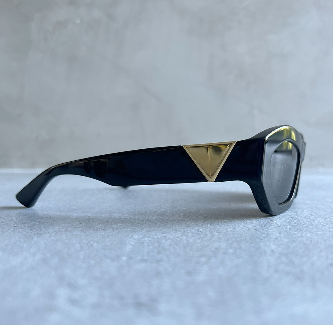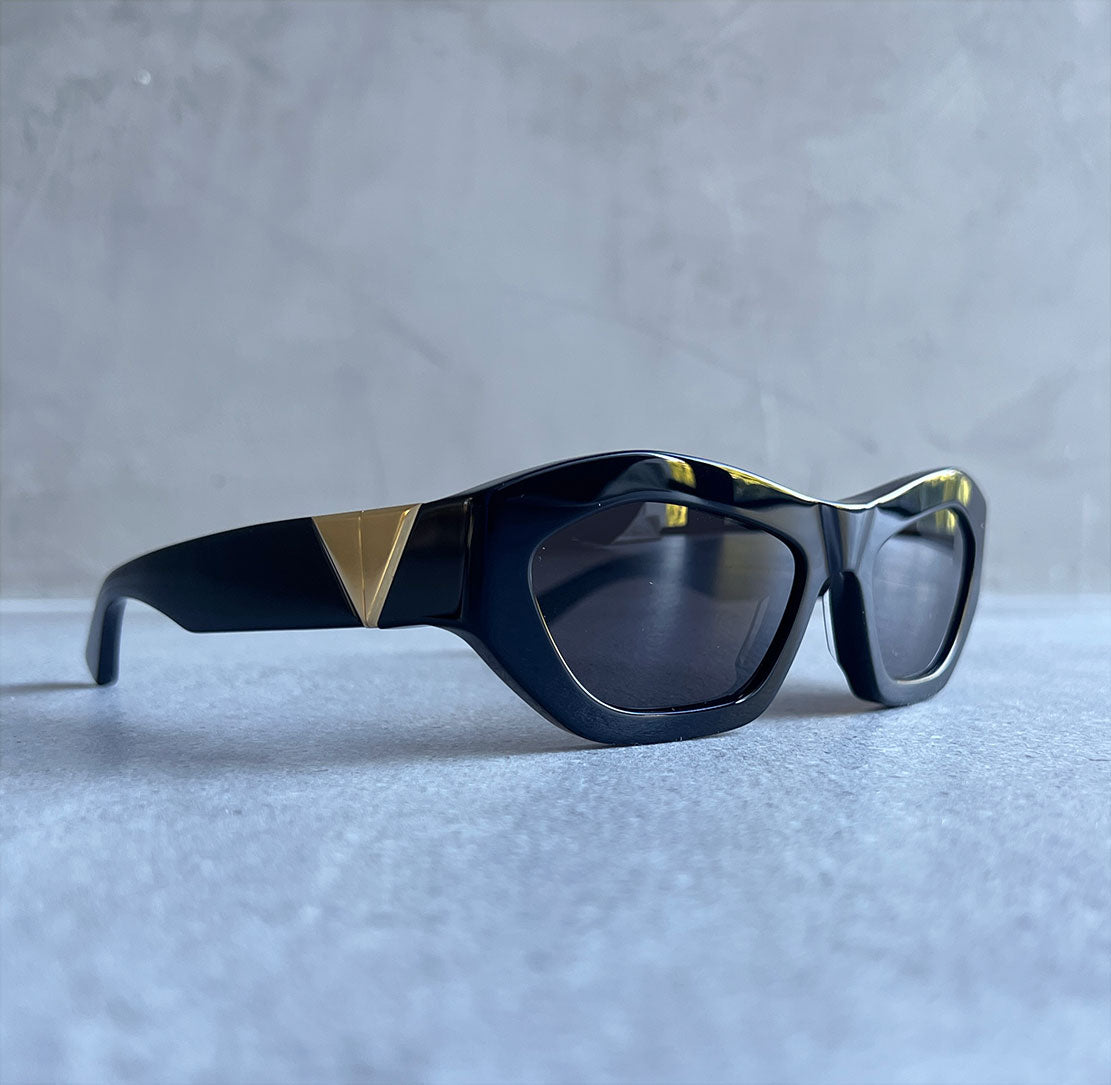 Full acetate feminine geometrical narrow style characterized by sharp and bold volumes. New triangular dedicated hinge in metal. Bottega Veneta logo on the top of the hinge.