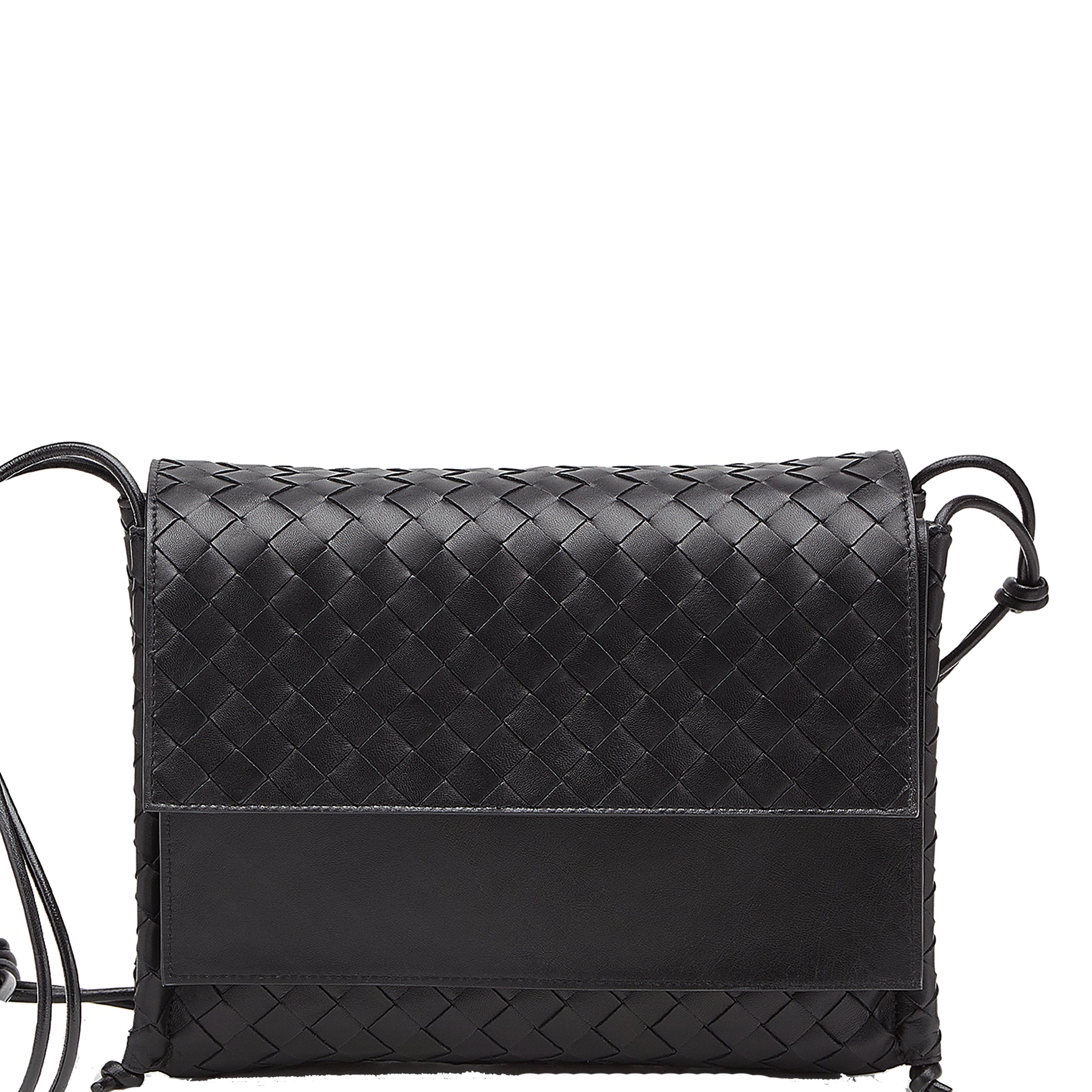 A soft crossbody bag with a double flap closure which can fold over the exterior or inside for a boxy shape. Finished with a knotted adjustable leather strap and lined with calfskin leather.