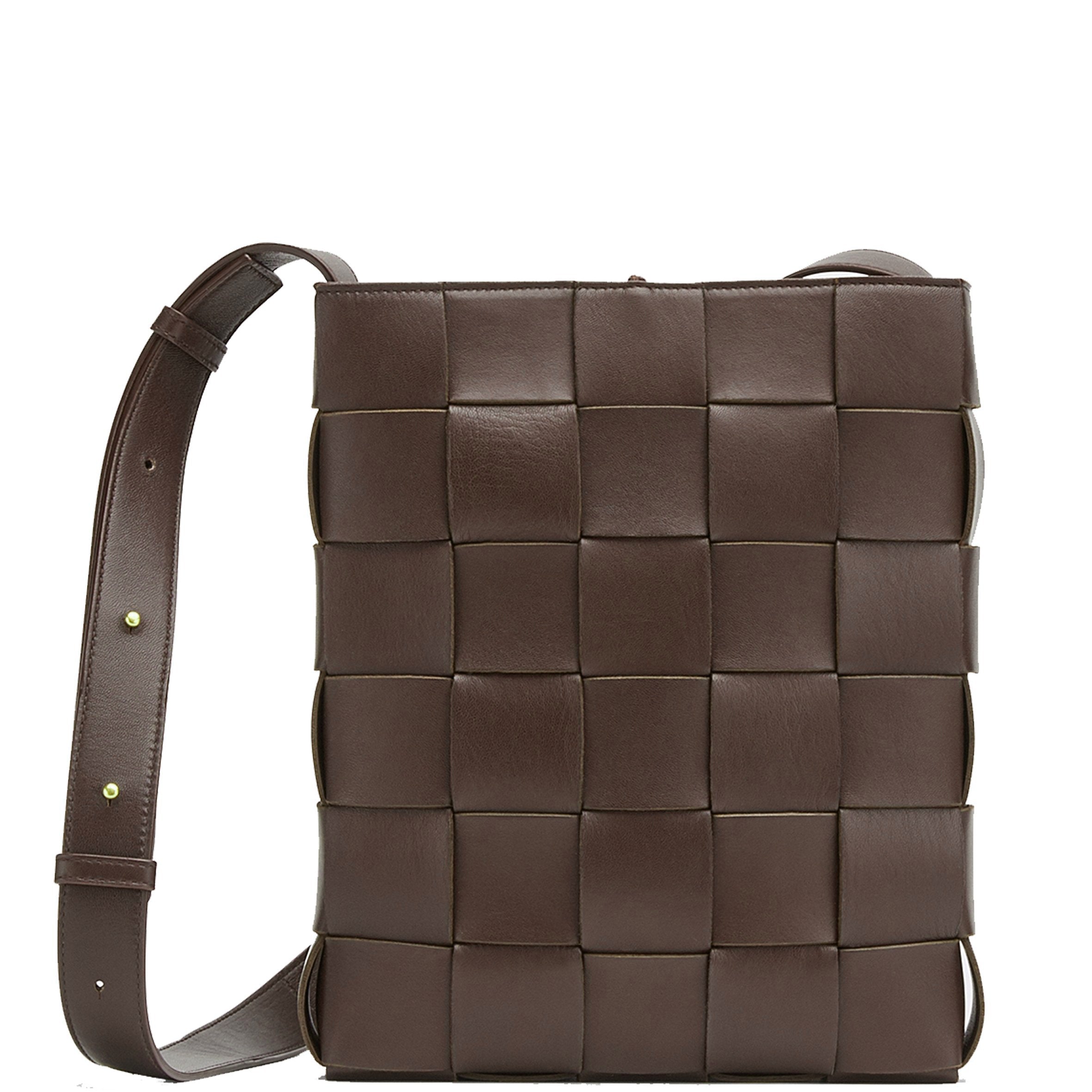 Messenger bag in Intrecciato Nappa leather. Features an interior zipped pocket, an adjustable shoulder strap which can be worn crossbody or over the shoulder, unpainted edges for a natural finish, and leather string fastening. Interior is unlined.