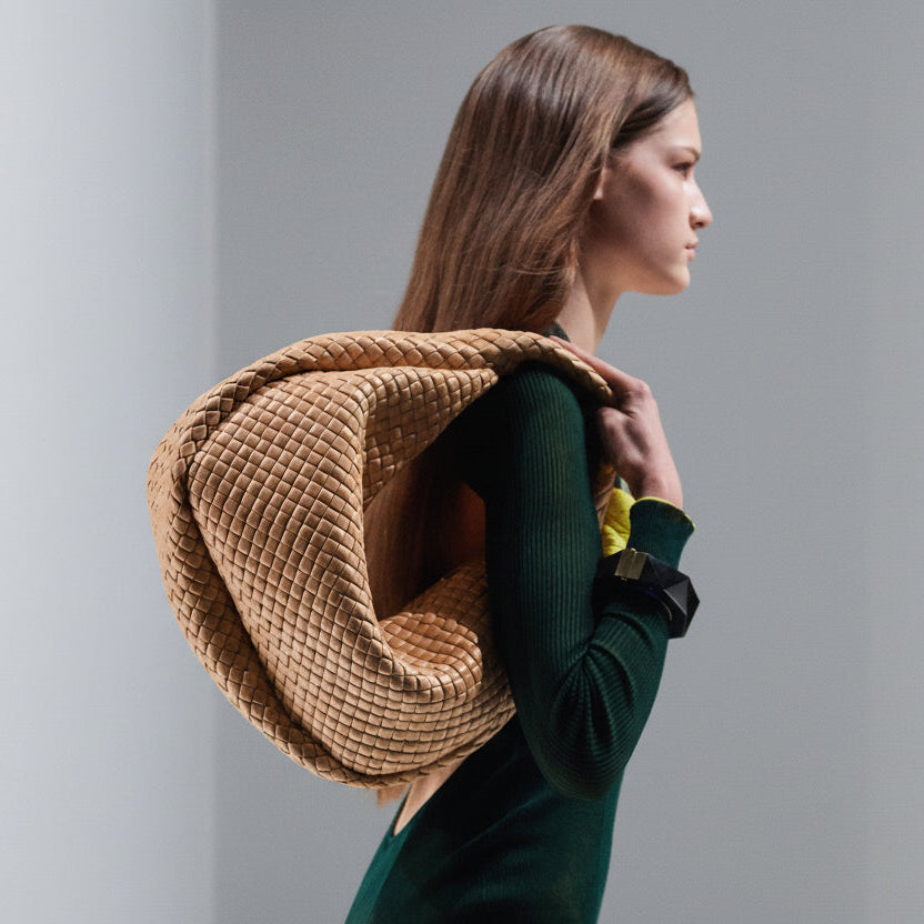 Rounded hobo bag crafted in padded intreccio nappa leather. Hand-woven with a softly curved silhouette, it features an unlined interior and gold-tone hardware. The structured basket-weave construction mimics the form of a woven basket.