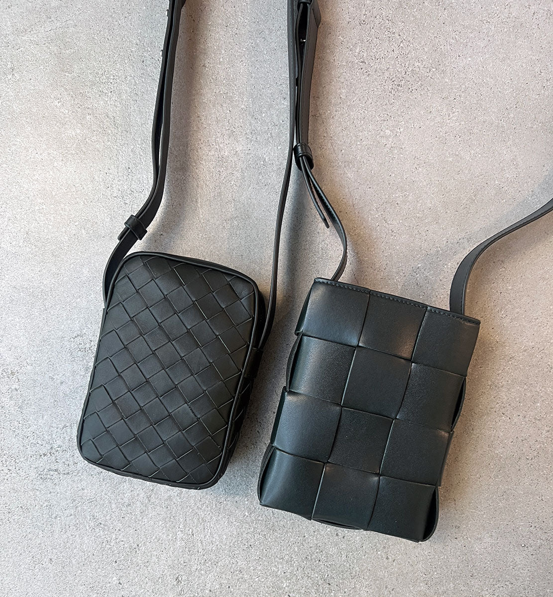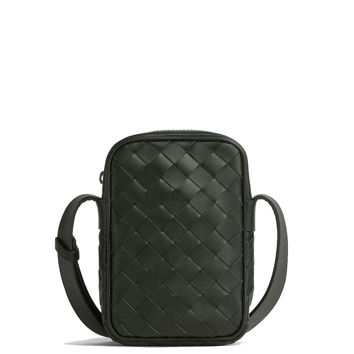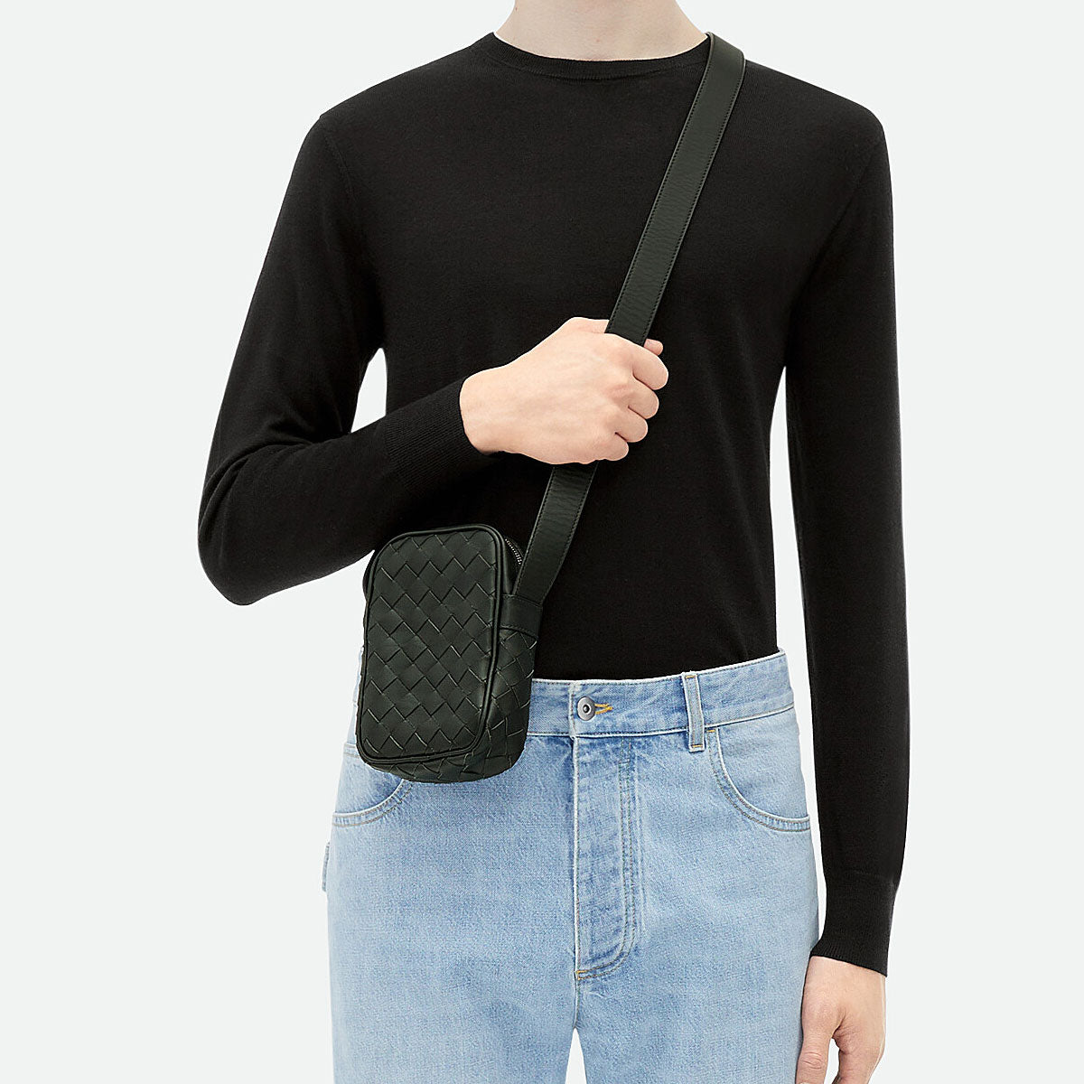 A crossbody intercciato leather pouch featuring three interior card slots and a zip closure.