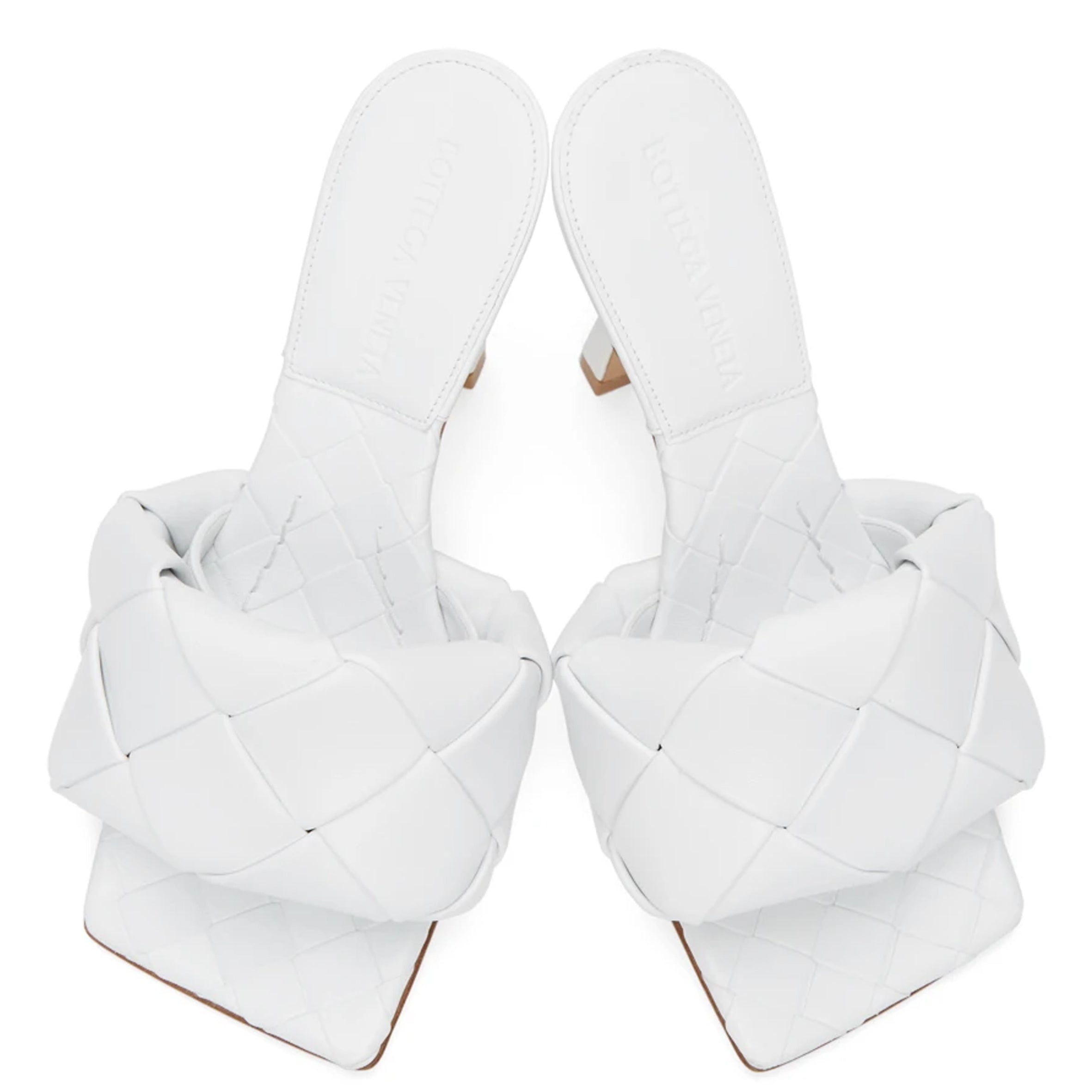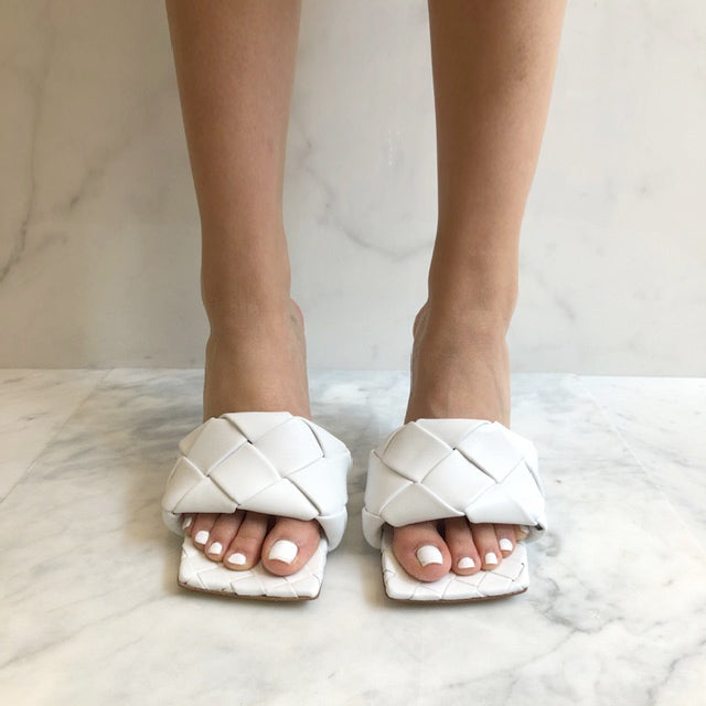 Woven leather mules with a squared sole. Signature woven intrecciato nappa amplified for a new dimension. Exceptionally soft nappa leather. Squared sole designed to extend beyond the foot. Woven insole