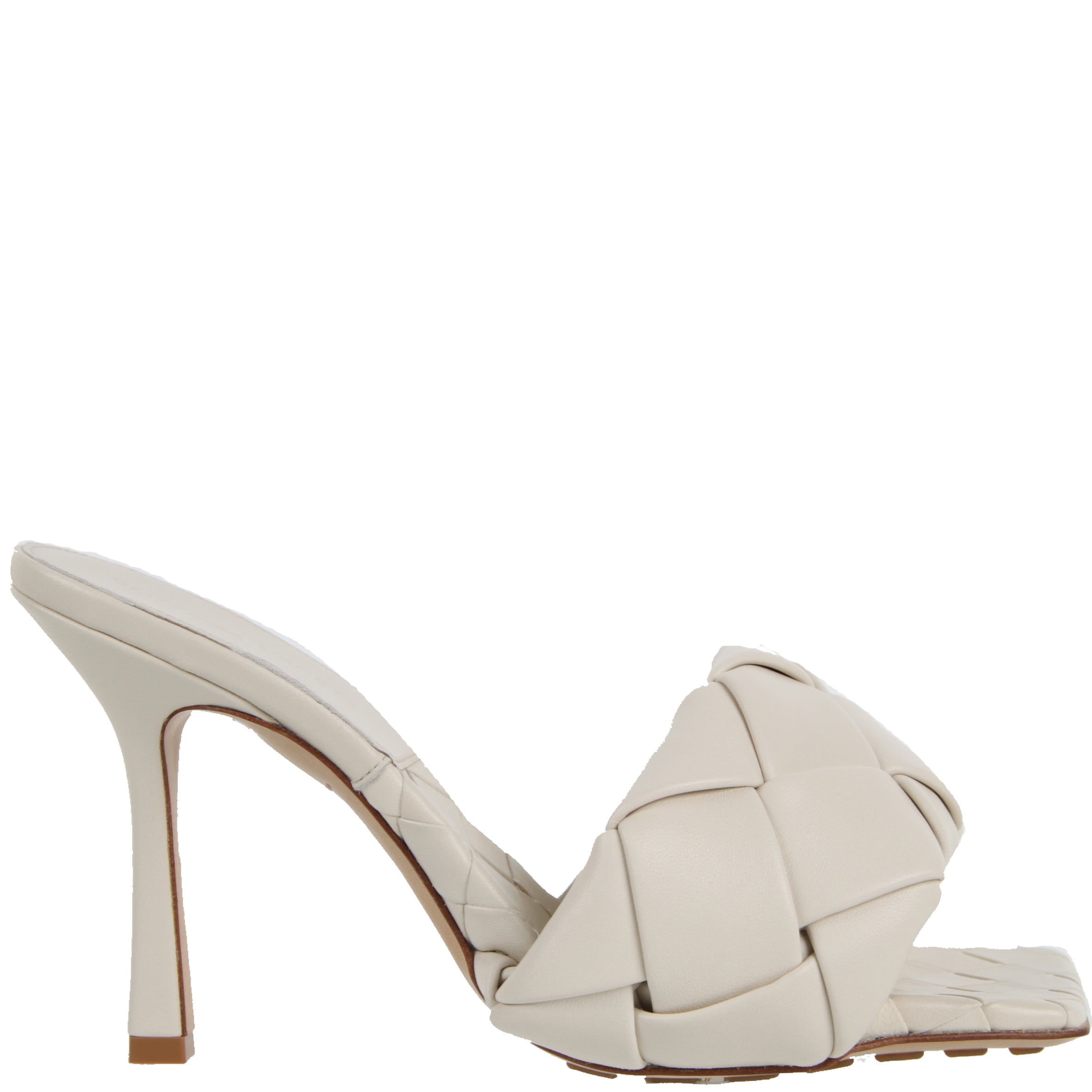 Woven leather mules with a squared sole. Signature woven intrecciato nappa amplified for a new dimension. Exceptionally soft nappa leather. Squared sole designed to extend beyond the foot. Woven insole