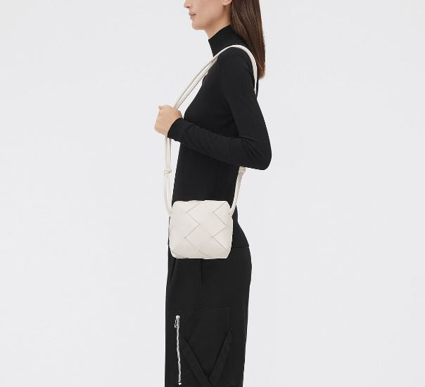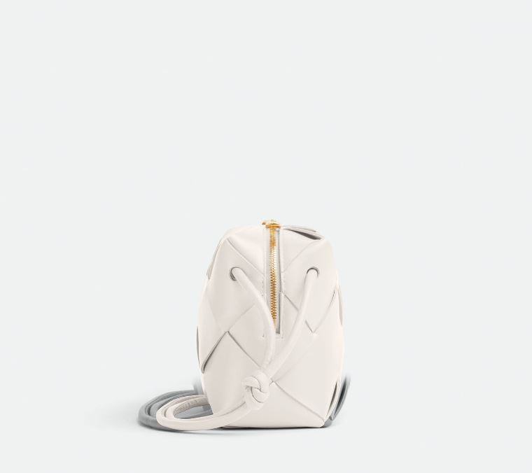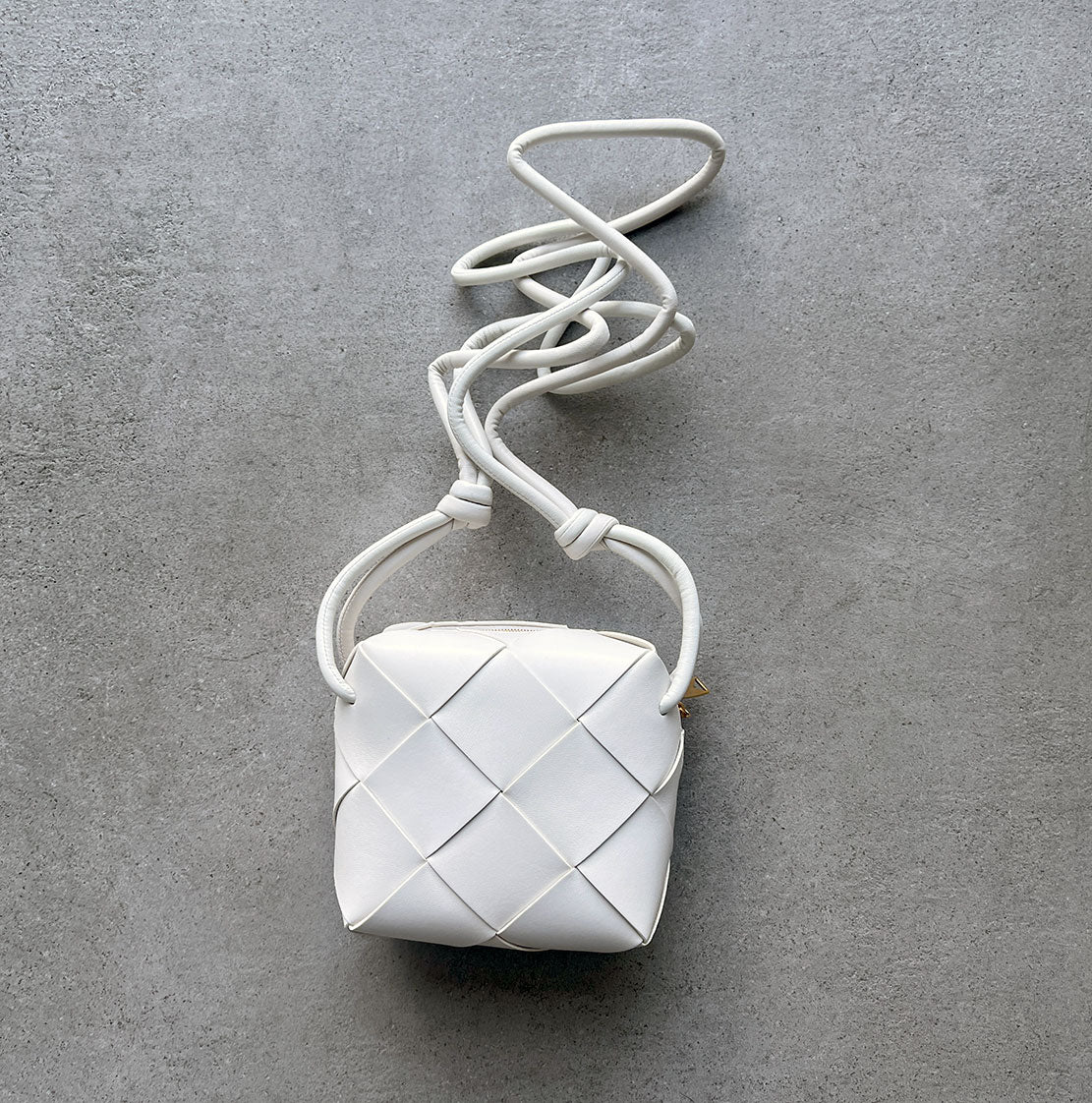 Bottega Veneta's signature Loop Mini bag is now available in their cassette weave. This crossbody bag has a soft edge boxy shape crafted from lamb leather and features double knotted side details on the strap, zip top closure and bonded lambskin lining.