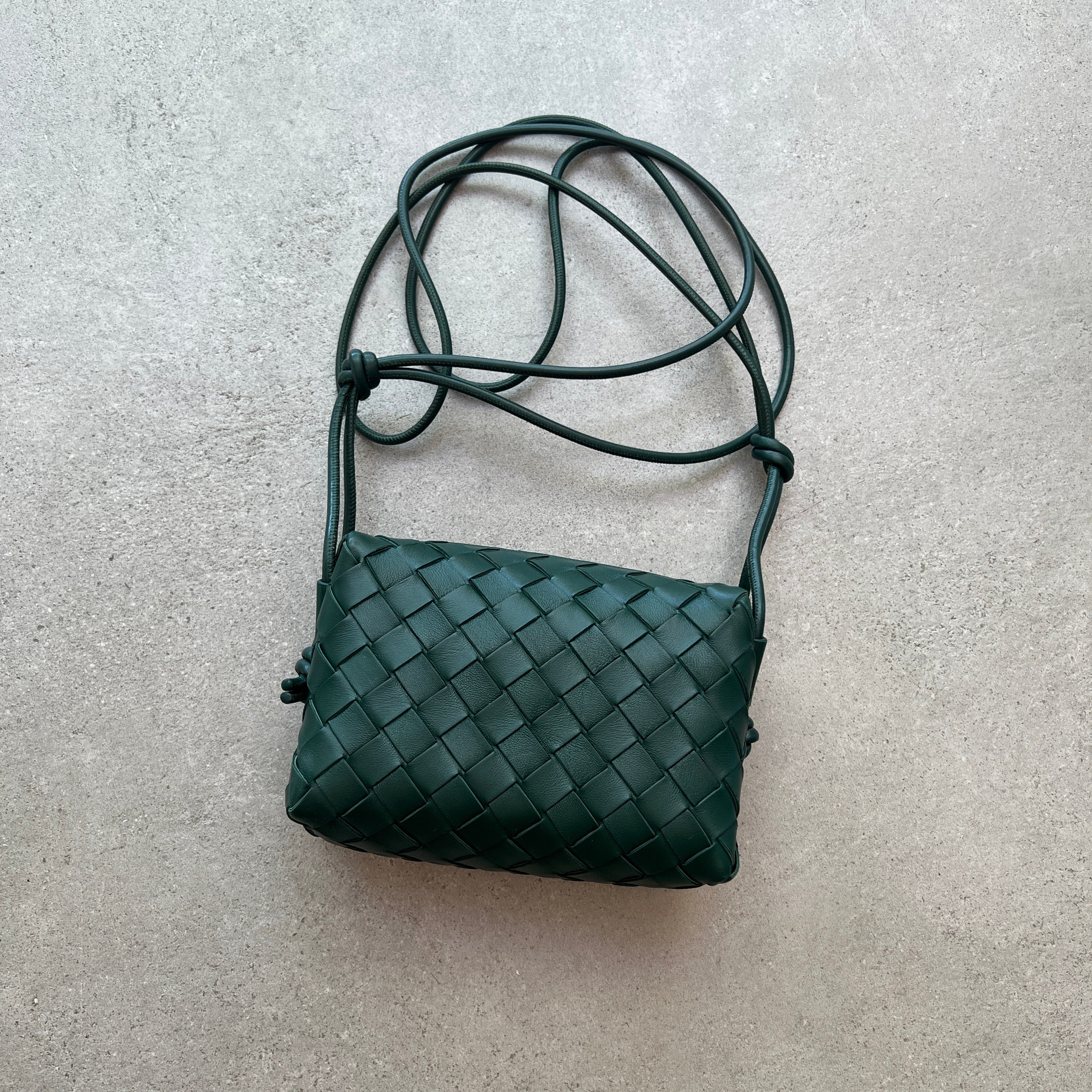 Bottega Veneta's Loop Mini bag is woven in the designers distinguishable intrecciato weave. This crossbody bag has a soft edge boxy shape crafted from lamb leather and features double knotted side details on the strap and zip top closure.