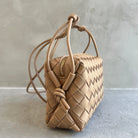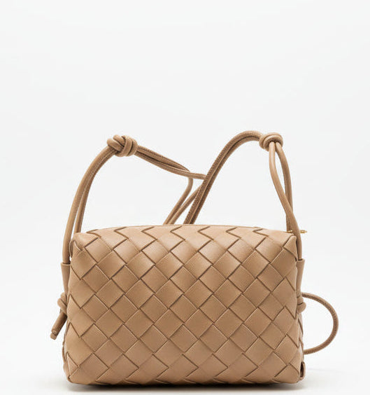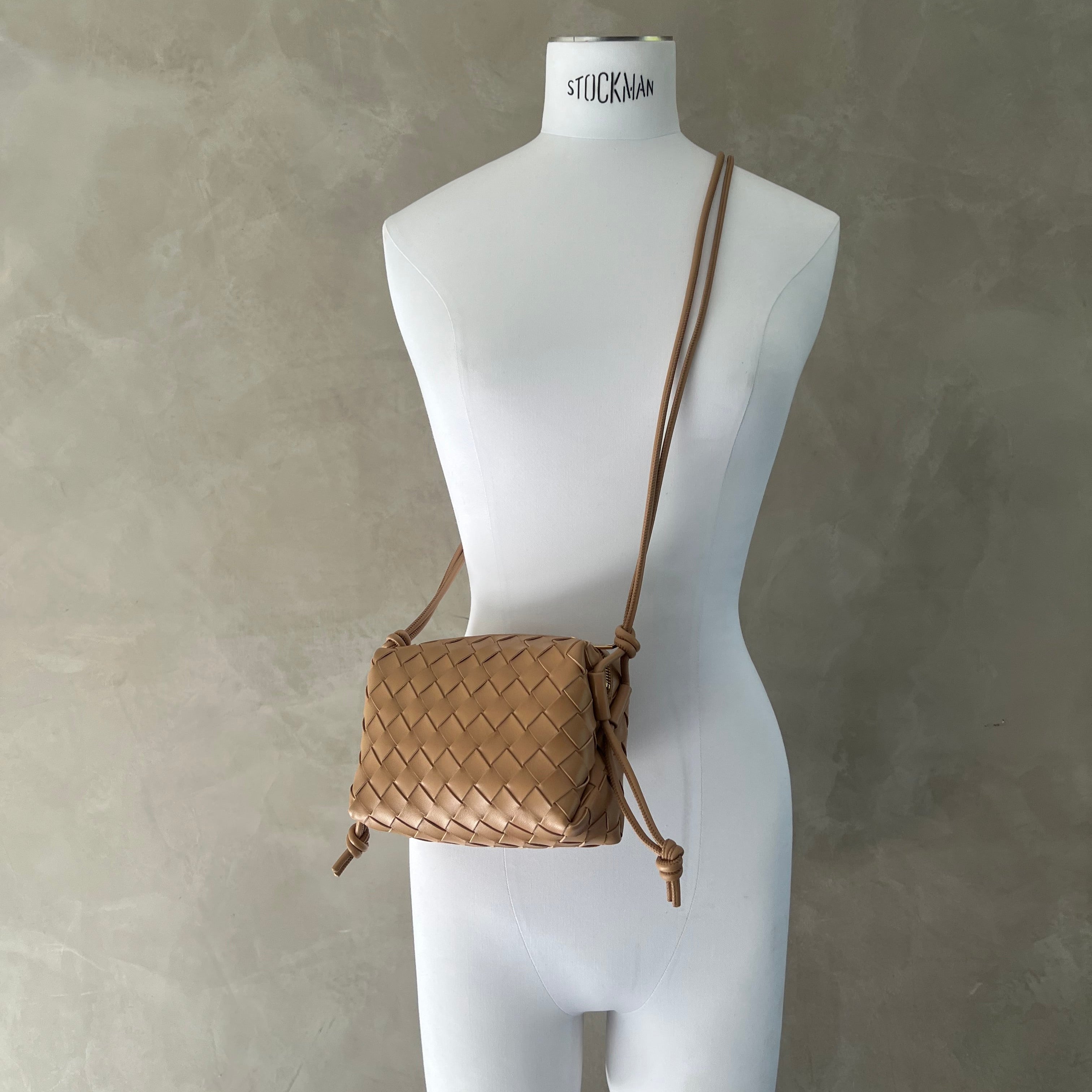 Bottega Veneta's Loop Mini bag is woven in the designers distinguishable intrecciato weave. This crossbody bag has a soft edge boxy shape crafted from lamb leather and features double knotted side details on the strap, zip top closure and internal leather lining with one slot pocket.