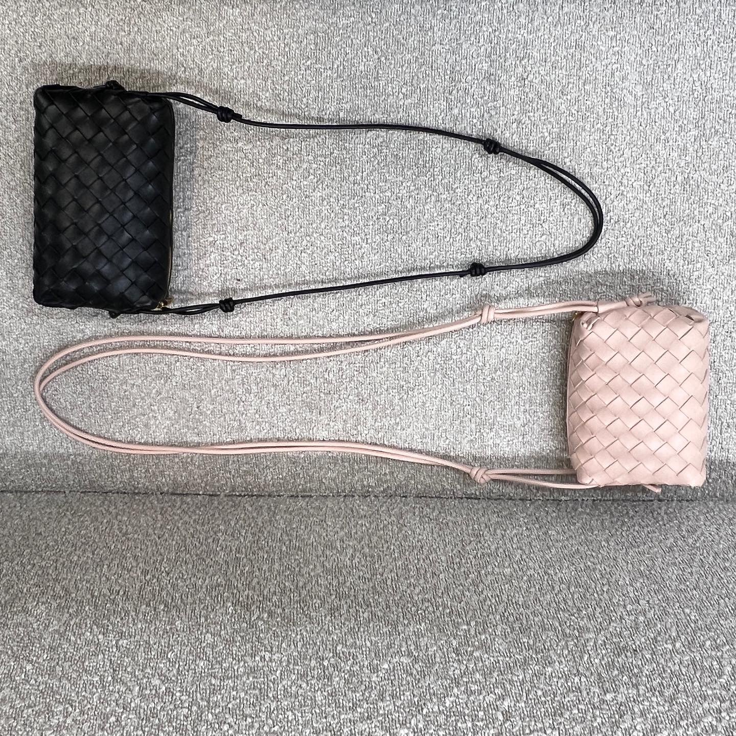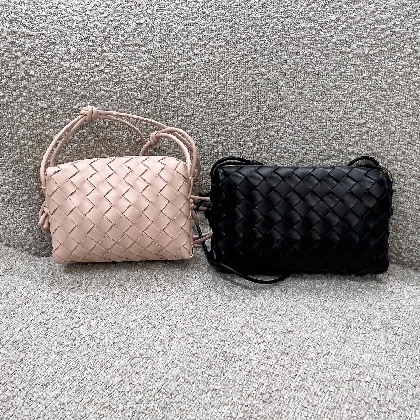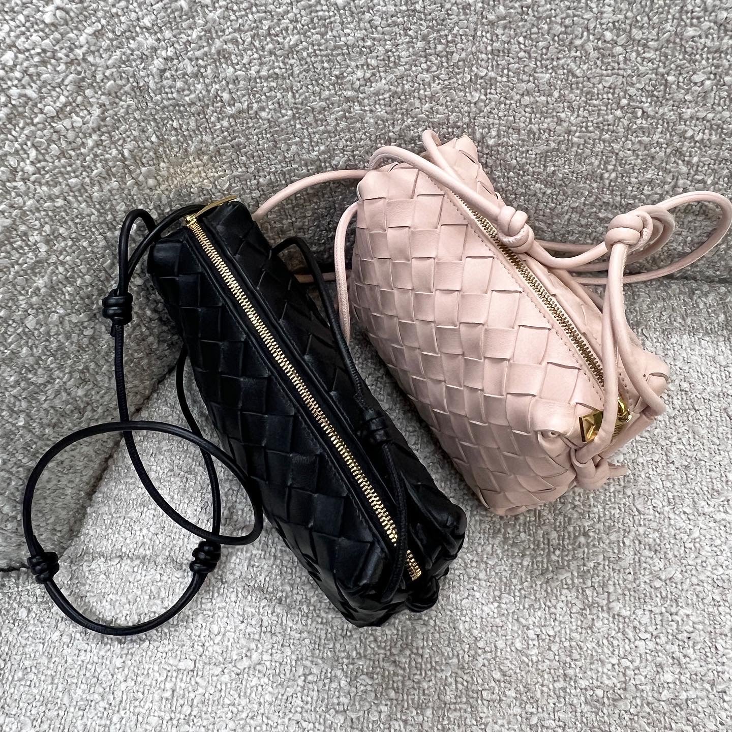 Bottega Veneta's Loop Mini bag is woven in the designers distinguishable intrecciato weave. This crossbody bag has a soft edge boxy shape crafted from lamb leather and features double knotted side details on the strap and zip top closure. Shown in photos next to the Black East West Loop
