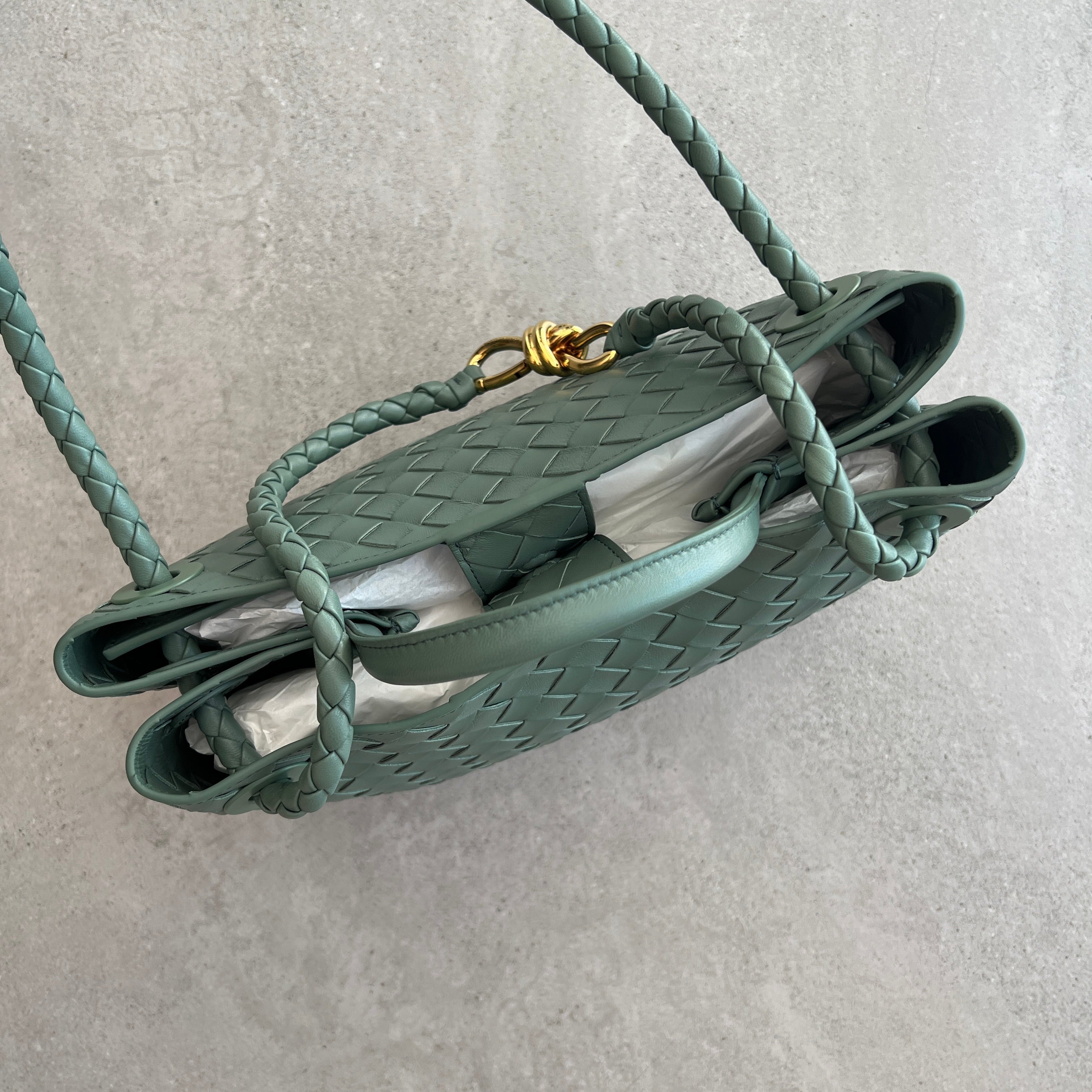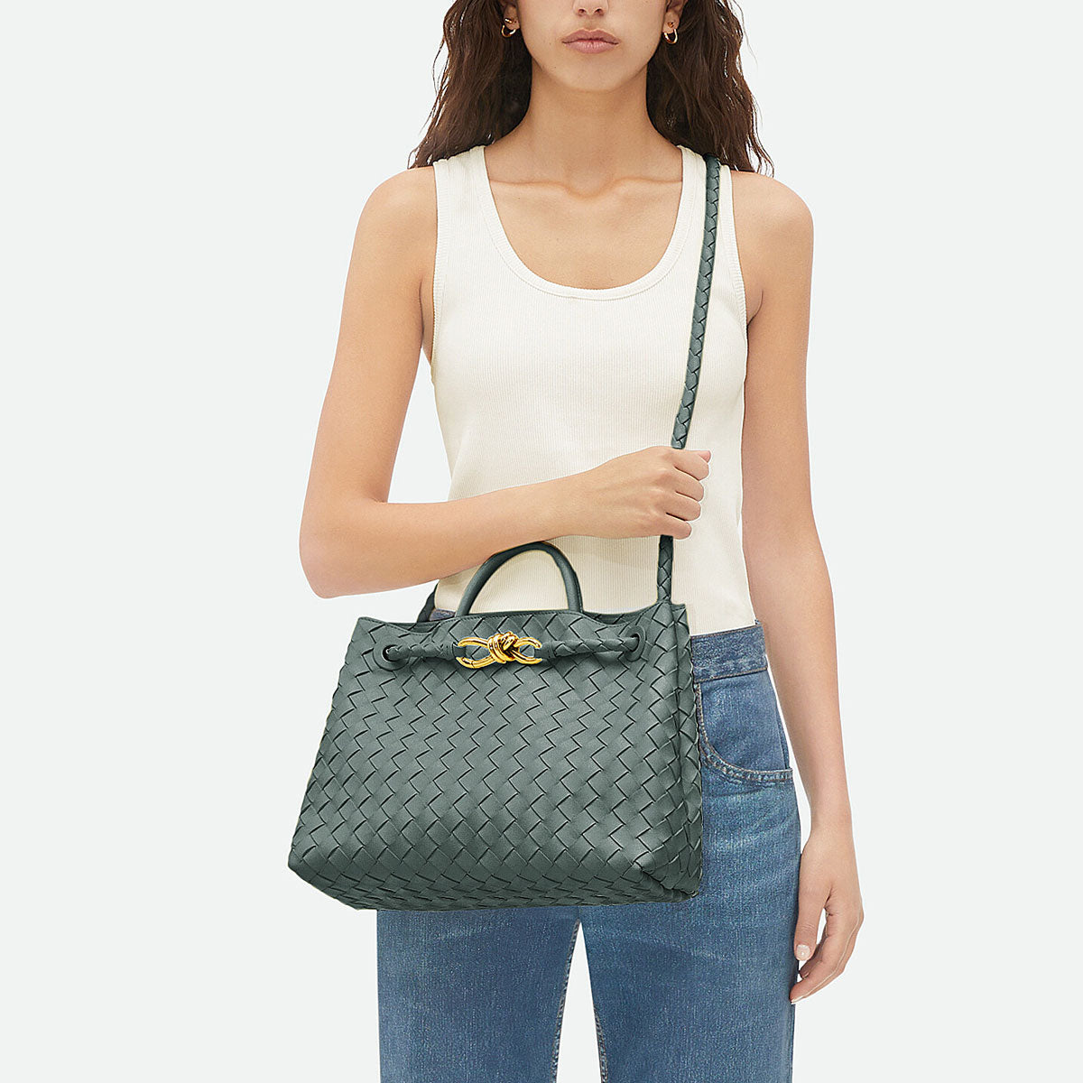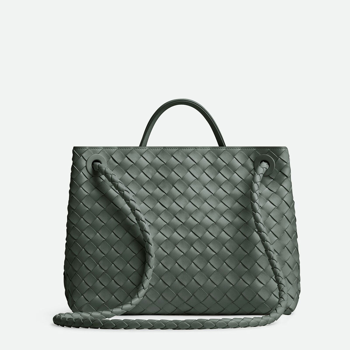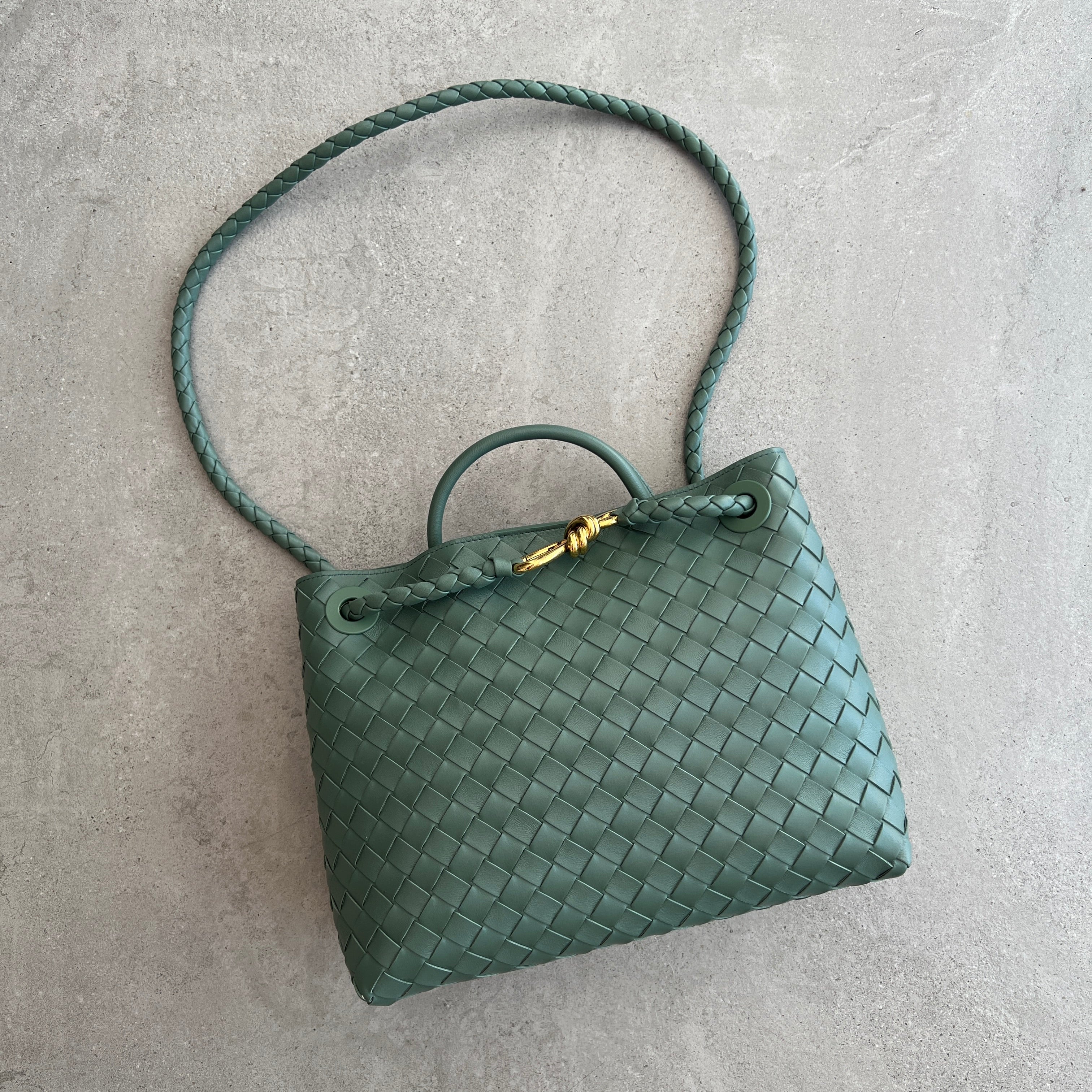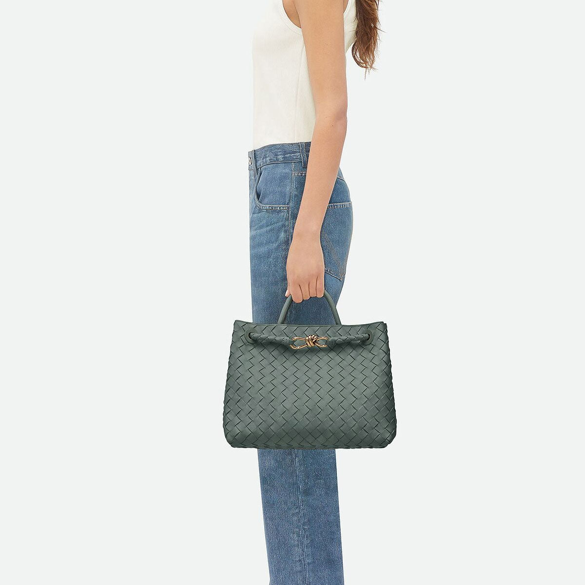 Andiamo is a new expression of the signature Intrecciato weave realised by the expert craftsmanship of artisans in the house’s atelier. Its name, Andiamo, “Let’s go” in Italian, embodies the spirit of the bag, a tribute to going places and the concept of craft in motion. The bag features a timeless Intrecciato silhouette woven by hand. A metal knot adorns and fastens its sliding braided straps, allowing it to be adjusted over the shoulder or across the body, giving the bag a soft tapered volume.