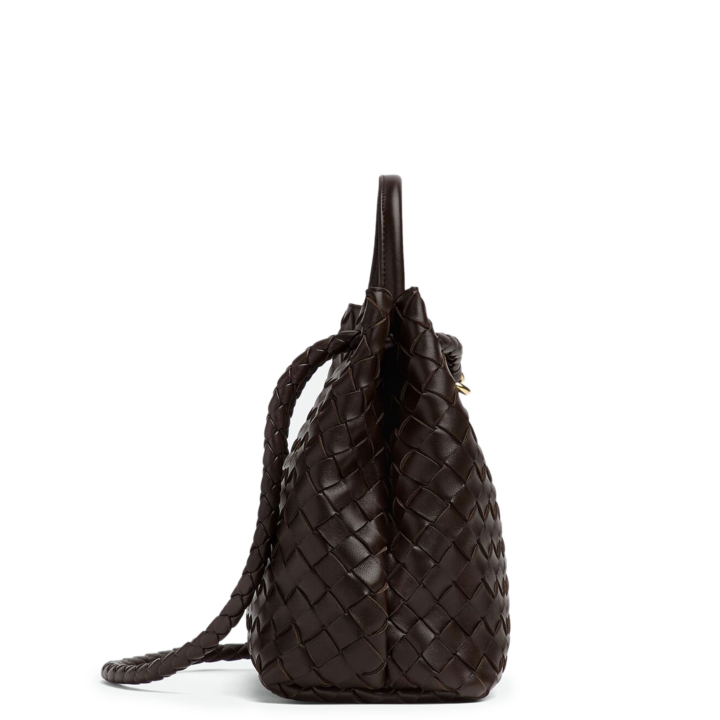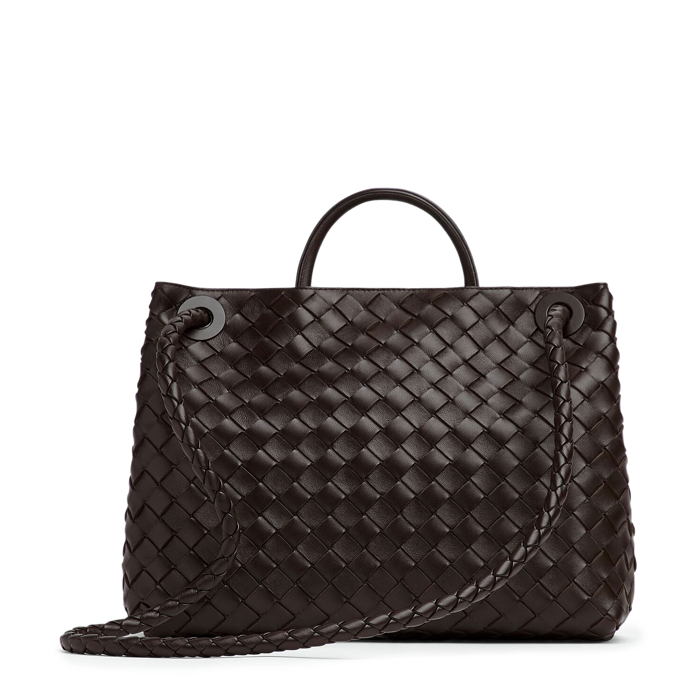 Medium Intrecciato leather top handle bag with sliding cross-body strap • Compartmented interior with one zipped pocket, two open pockets • Magnetic closure