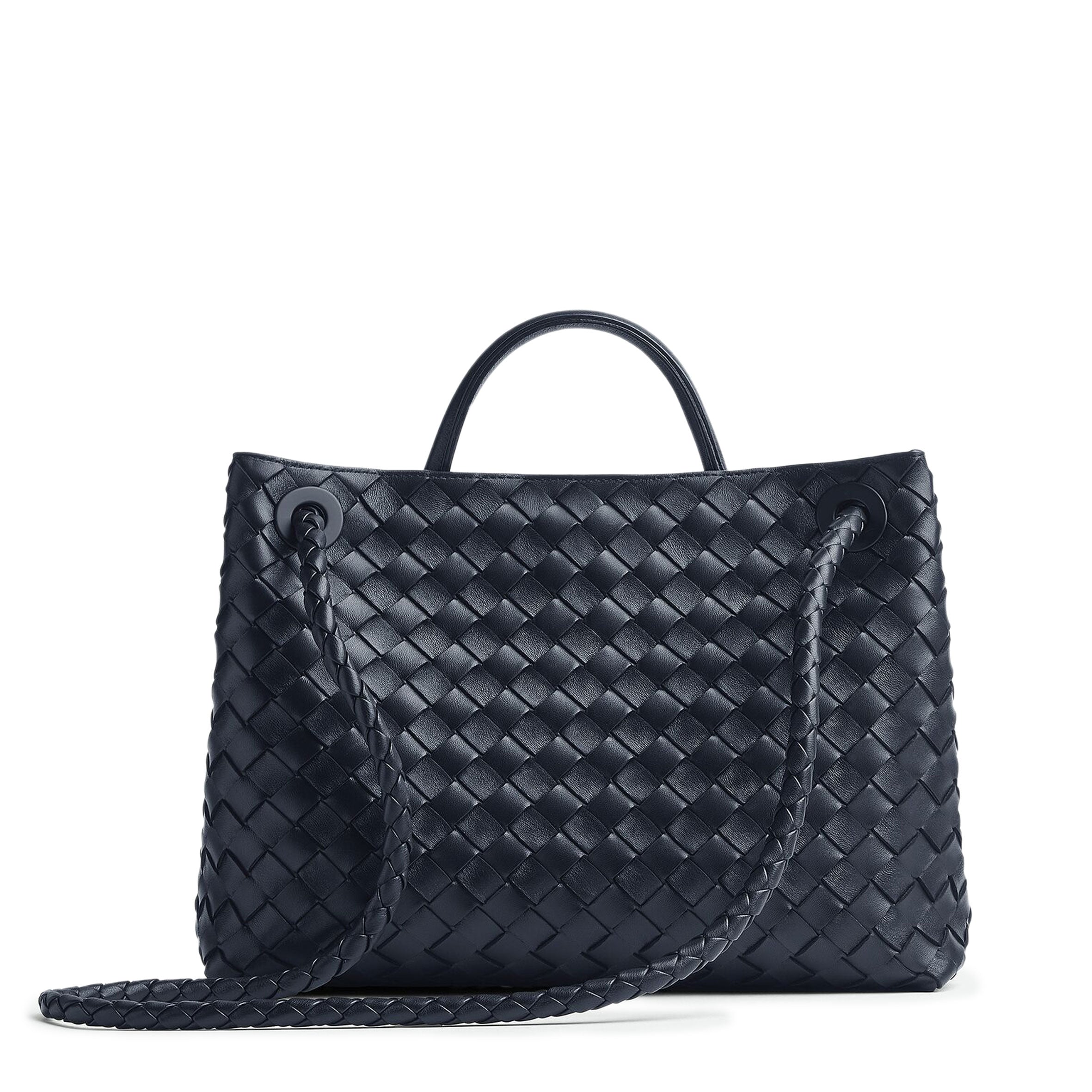 Medium Intrecciato leather top handle bag with sliding cross-body strap • Compartmented interior with one zipped pocket, two open pockets • Magnetic closure