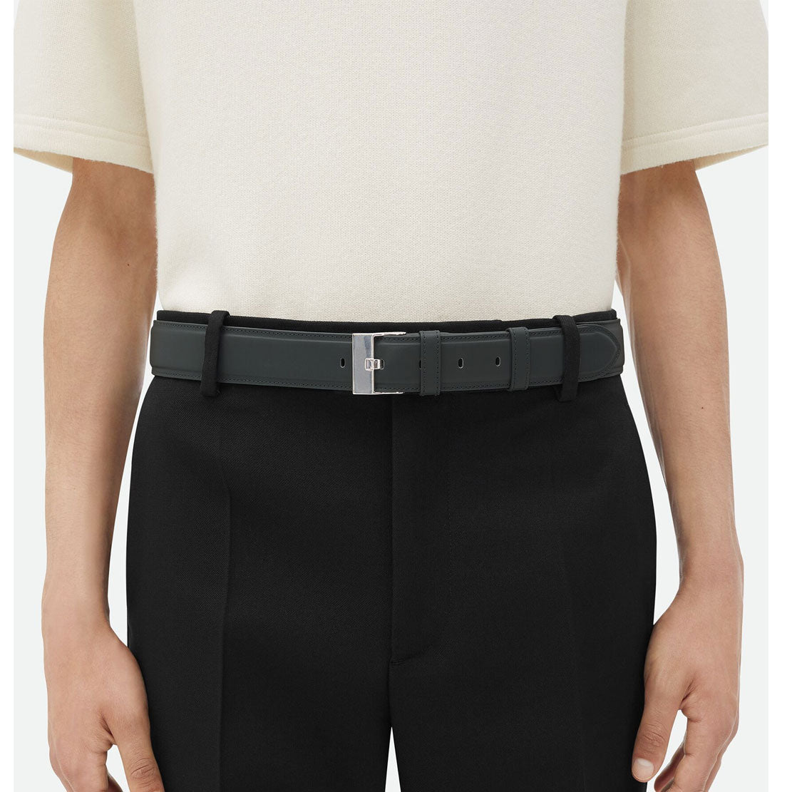 Smooth calfskin leather belt with watch buckle closure.