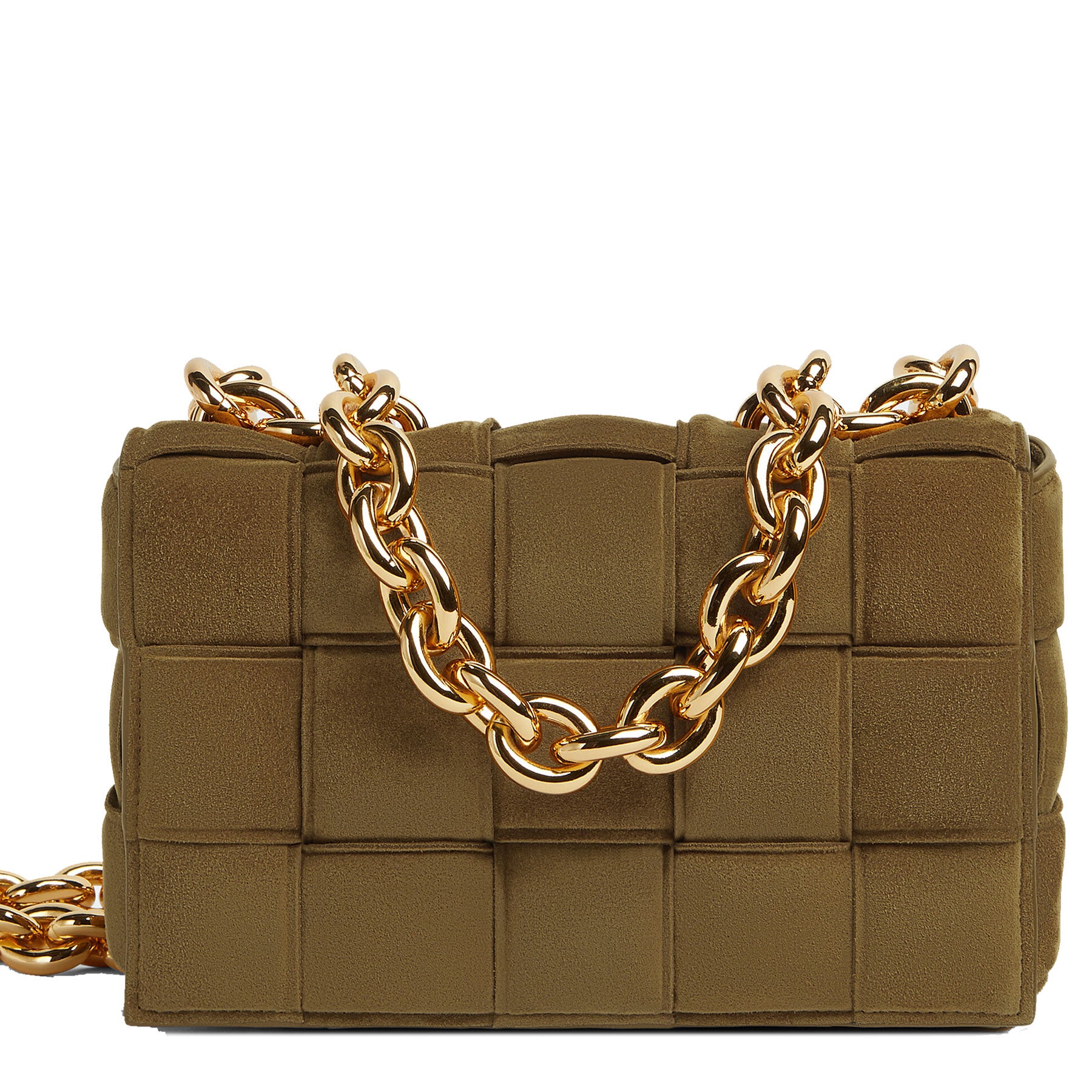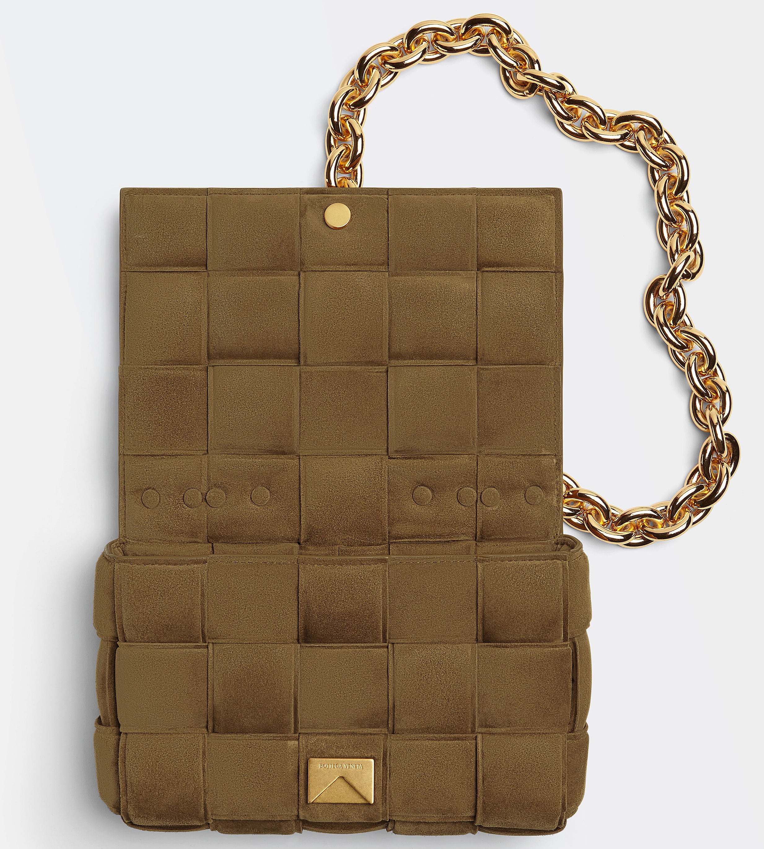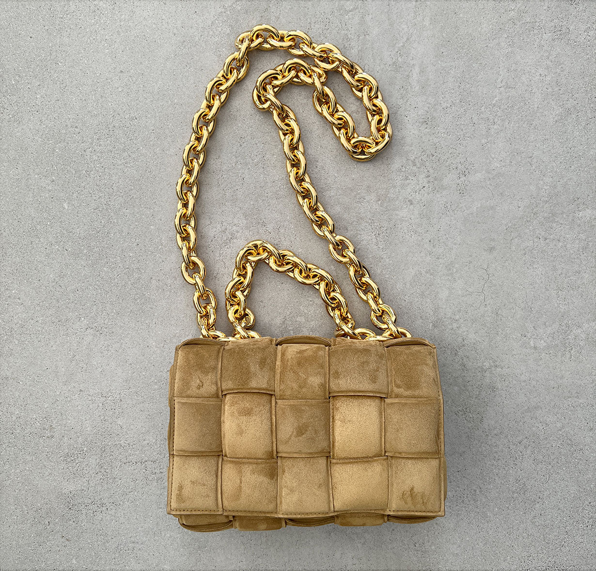 Crossbody bag in a double-face maxi weave. Made with wide double-face Nappa strips in an orthogonal weave. Interior is identical to exterior; fitted with a zipped pocket and magnetic closure. Adjustable shoulder strap folds inside the bag to carry as a clutch.