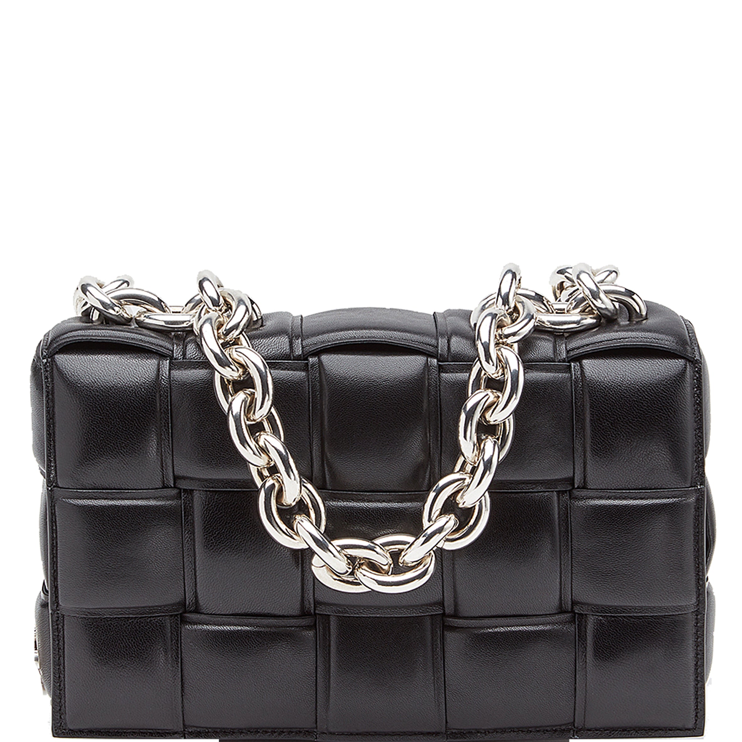 Crossbody bag in a double-face maxi weave. Made with wide double-face Nappa strips in an orthogonal weave. Interior is identical to exterior; fitted with a zipped pocket and magnetic closure. Adjustable shoulder strap folds inside the bag to carry as a clutch.