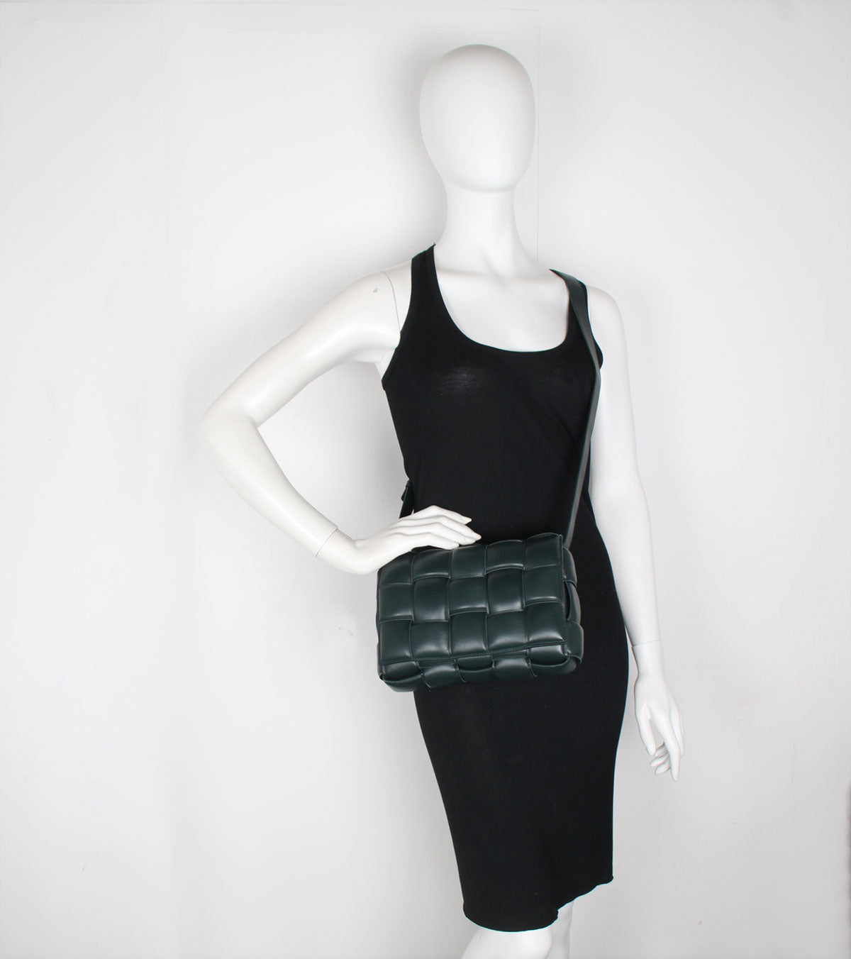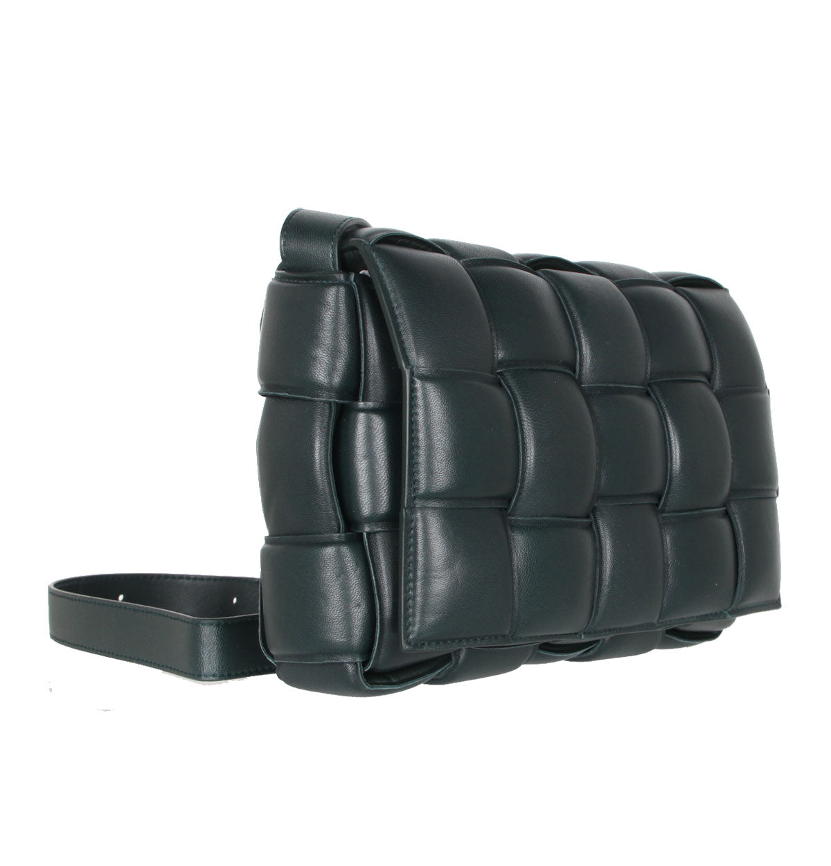 Crossbody bag in a double-face maxi weave. Made with wide double-face Nappa strips in an orthogonal weave. Interior is identical to exterior; fitted with a zipped pocket and magnetic closure. Adjustable shoulder strap folds inside the bag to carry as a clutch.