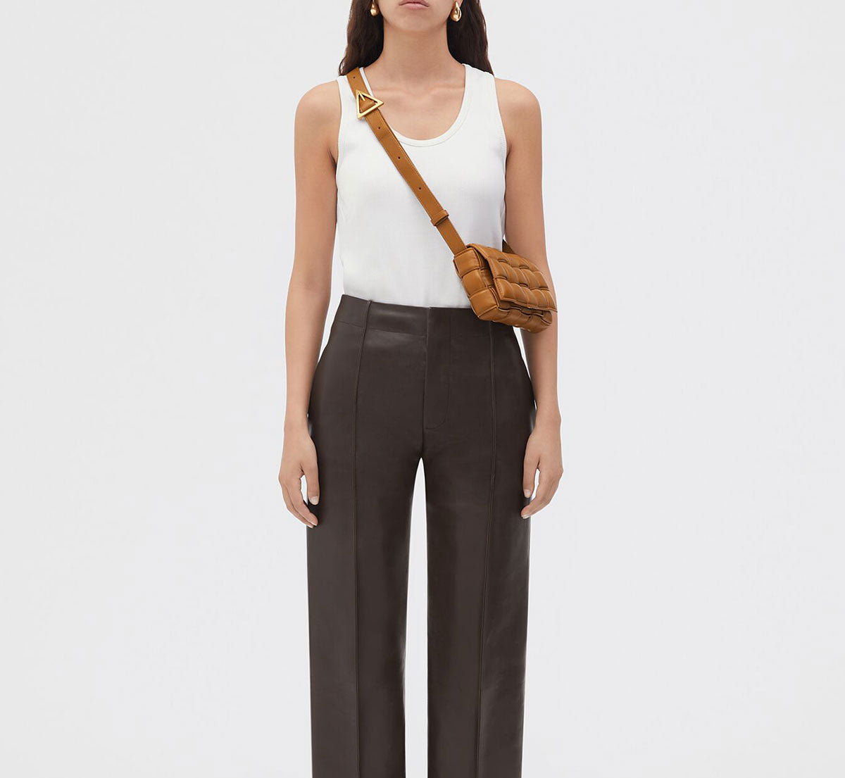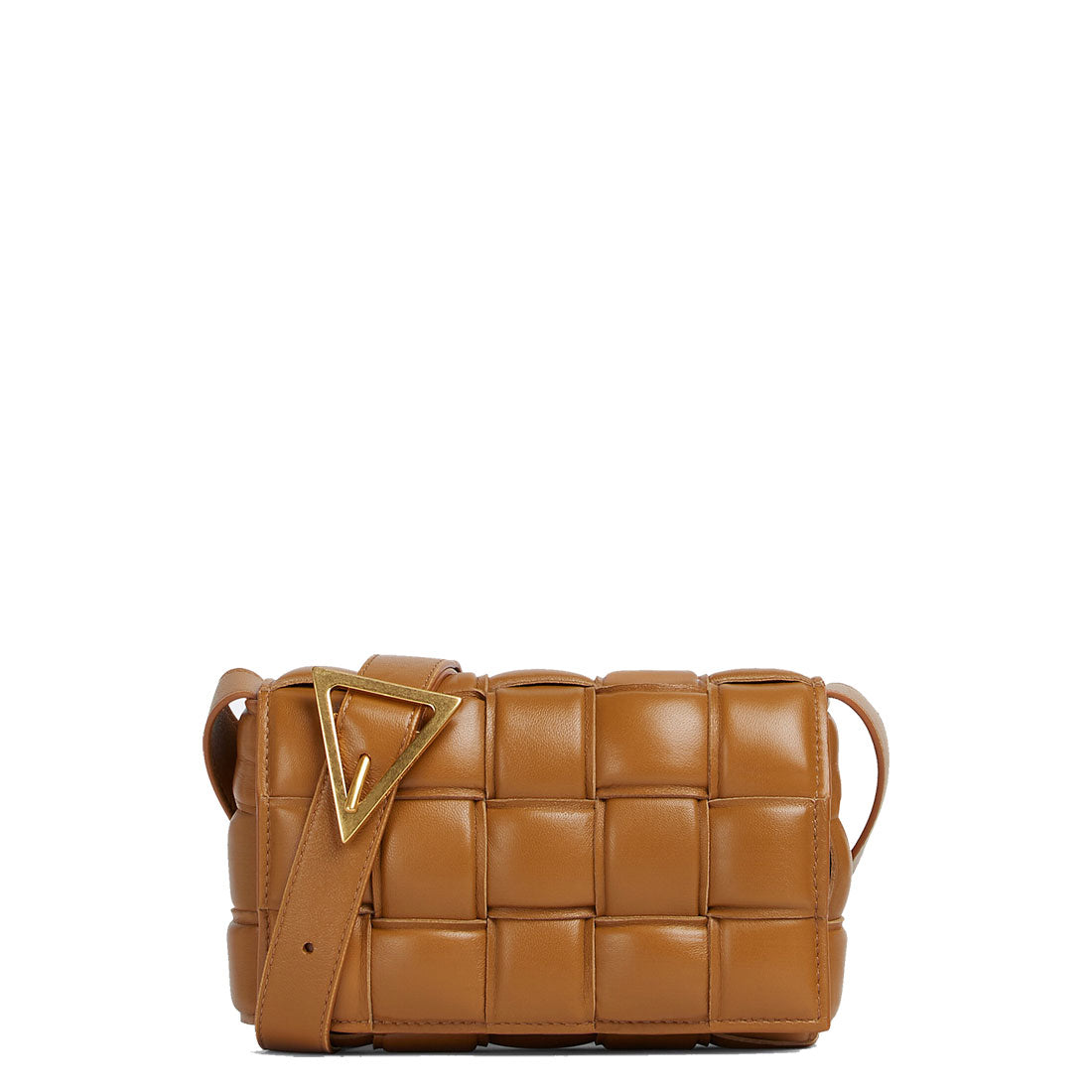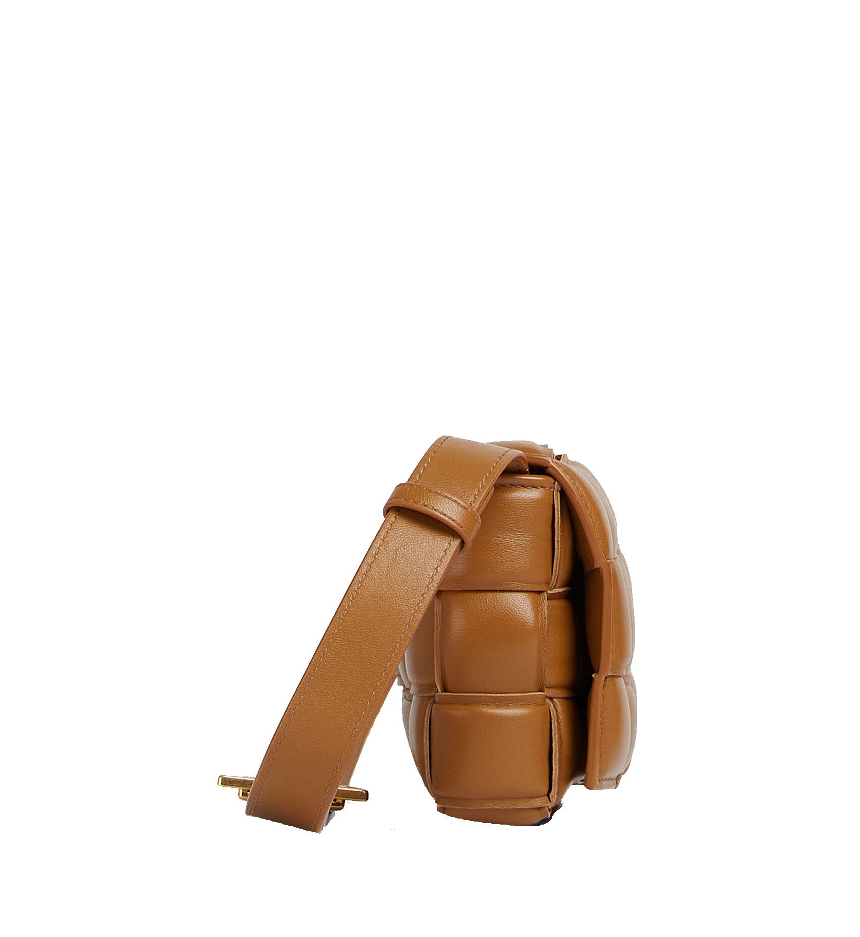 Crossbody bag in a double-face maxi weave. Made with wide double-face Nappa strips in an orthogonal weave. Interior is identical to exterior; fitted with a zipped pocket and magnetic closure. Adjustable shoulder strap folds inside the bag to carry as a clutch.