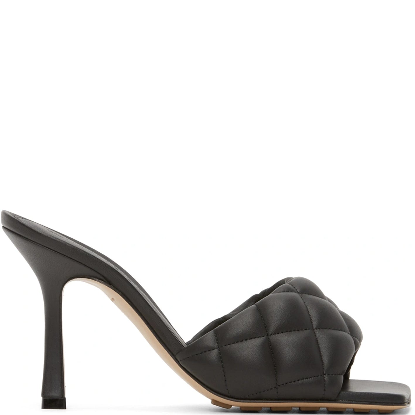 Quilted mules with exceptionally soft nappa leather. Squared sole designed to extend beyond the foot. Leather covered stiletto heel.