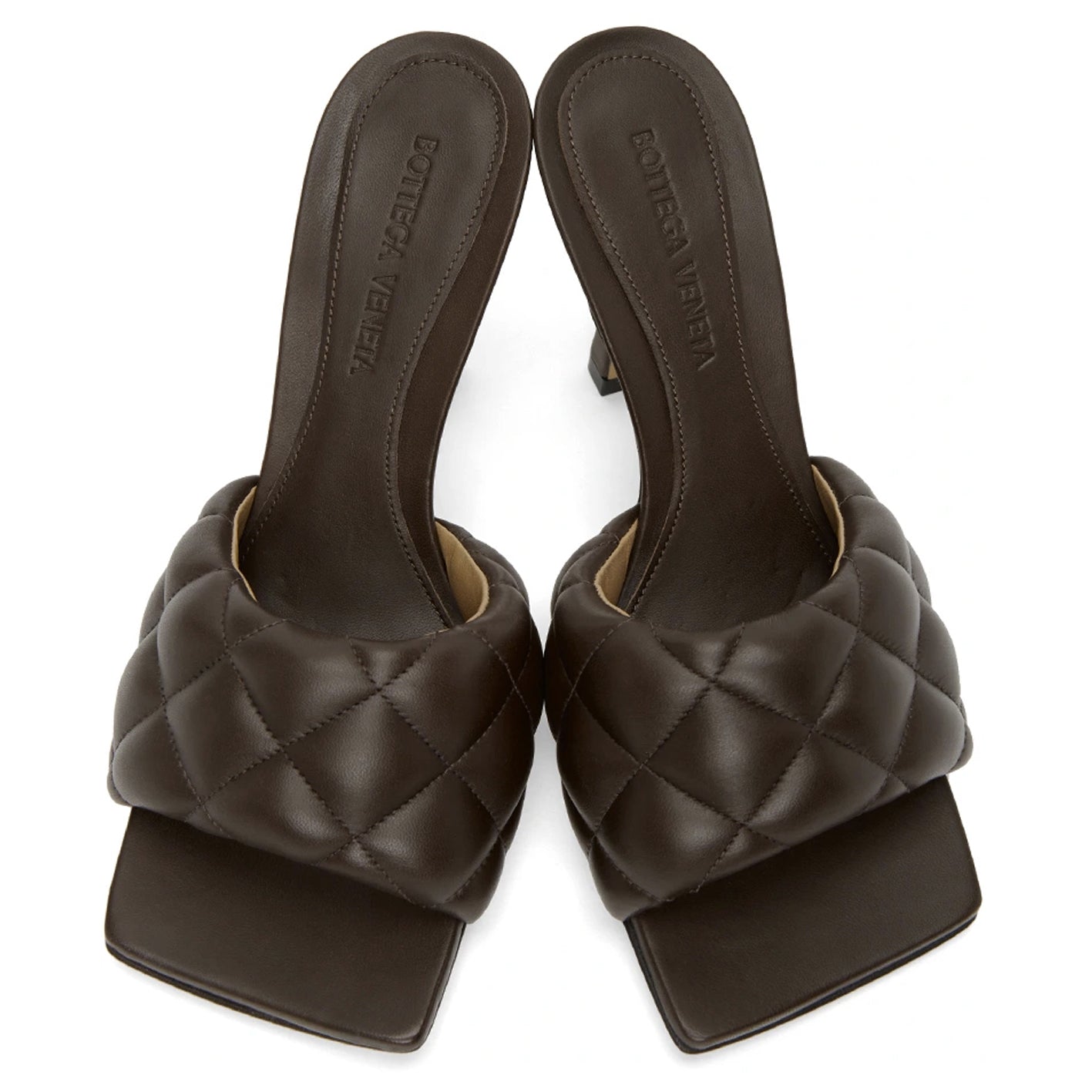 Quilted mules with exceptionally soft nappa leather. Squared sole designed to extend beyond the foot. Leather covered stiletto heel.