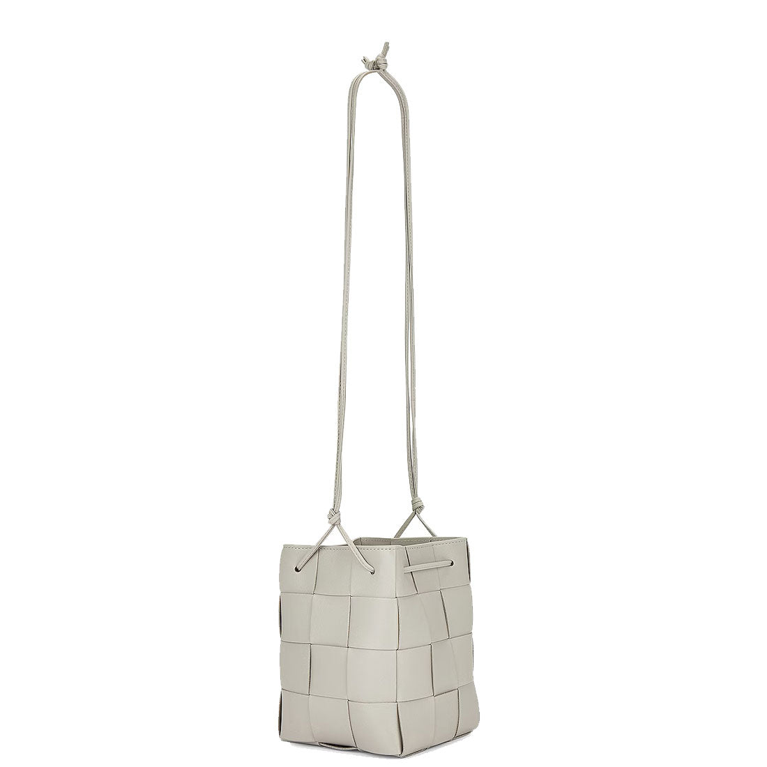 Bottega Veneta's signature Loop Mini bag is now available in their cassette weave. This crossbody bag has a soft edge bucket shape crafted from lamb leather and bonded lambskin lining.