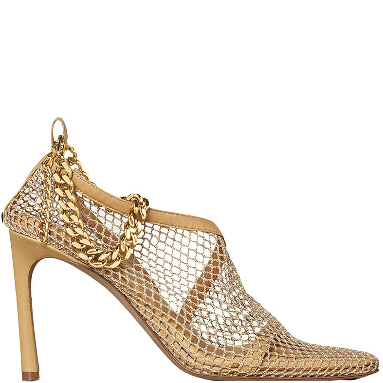 Single strap over the foot with a leather trimmed mesh D'Orsay layer. Chunky gold-finish chain threaded through back loop, pointed toe and stiletto heel. Rubber-injected leather sole for comfort and stability