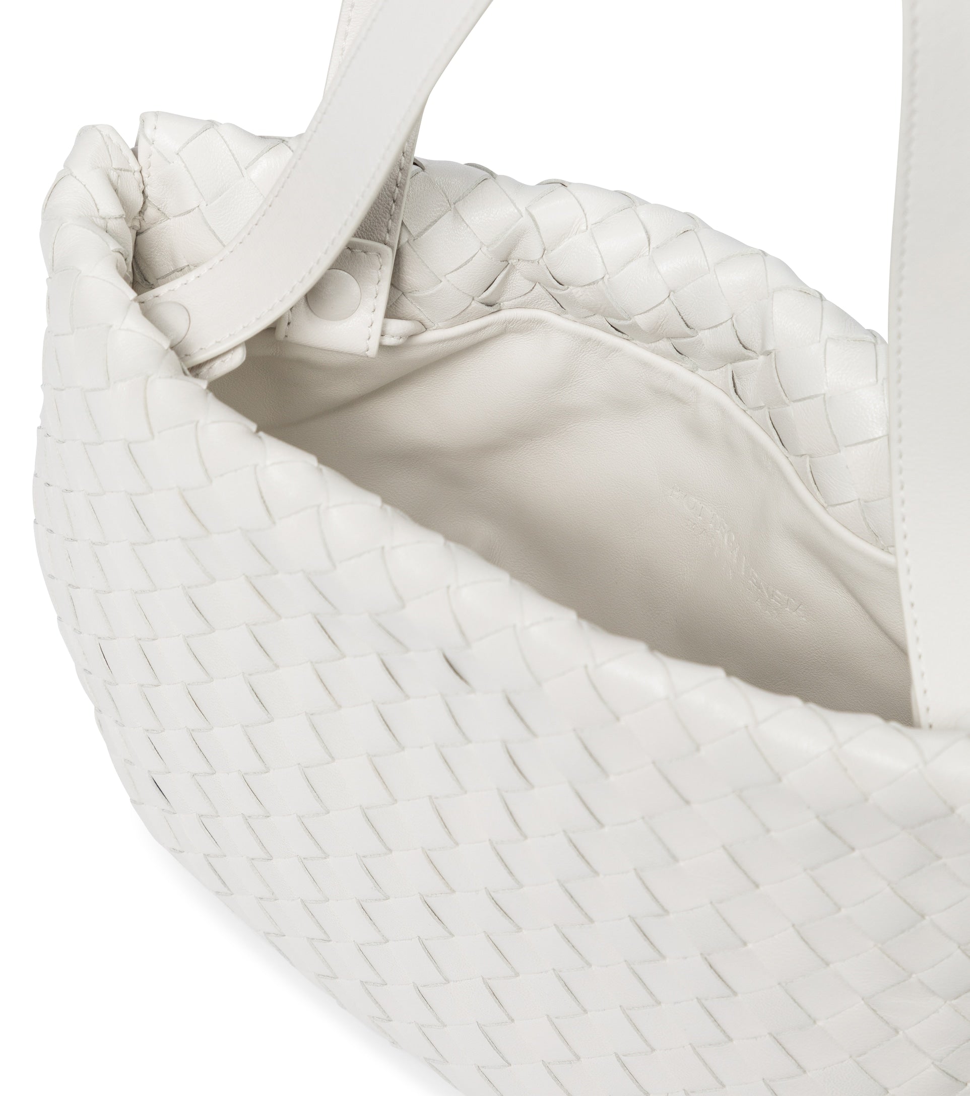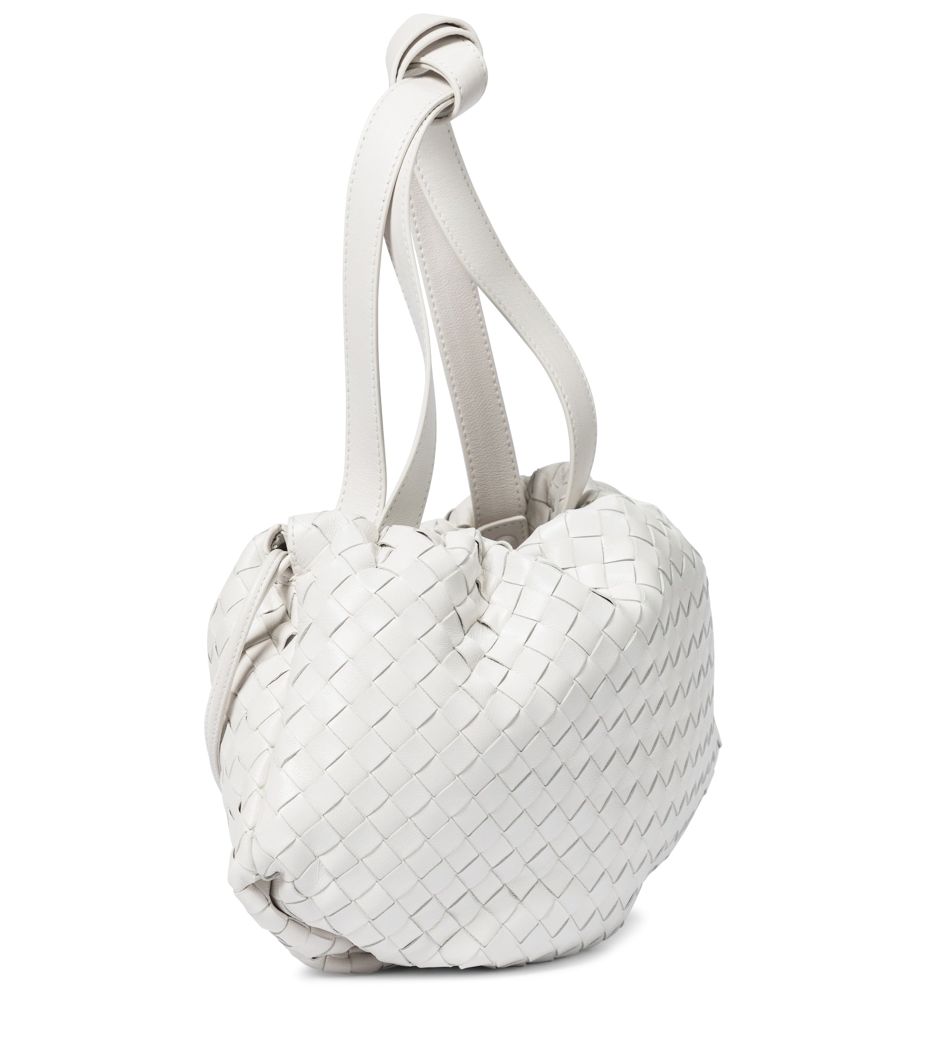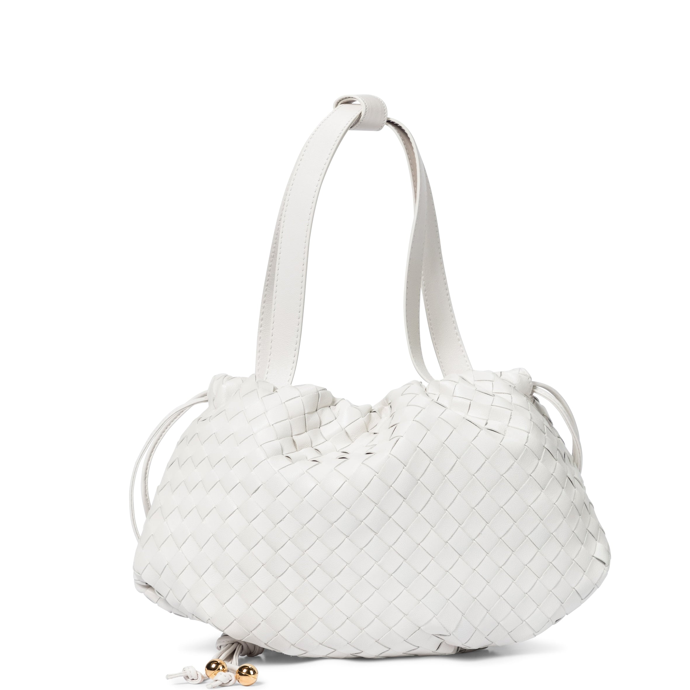 Drawstring bag in Intrecciato Nappa. Features an adjustable shoulder strap, removable handles attached with concealed buttons, and leather drawstring fastening embellished with metal globes.