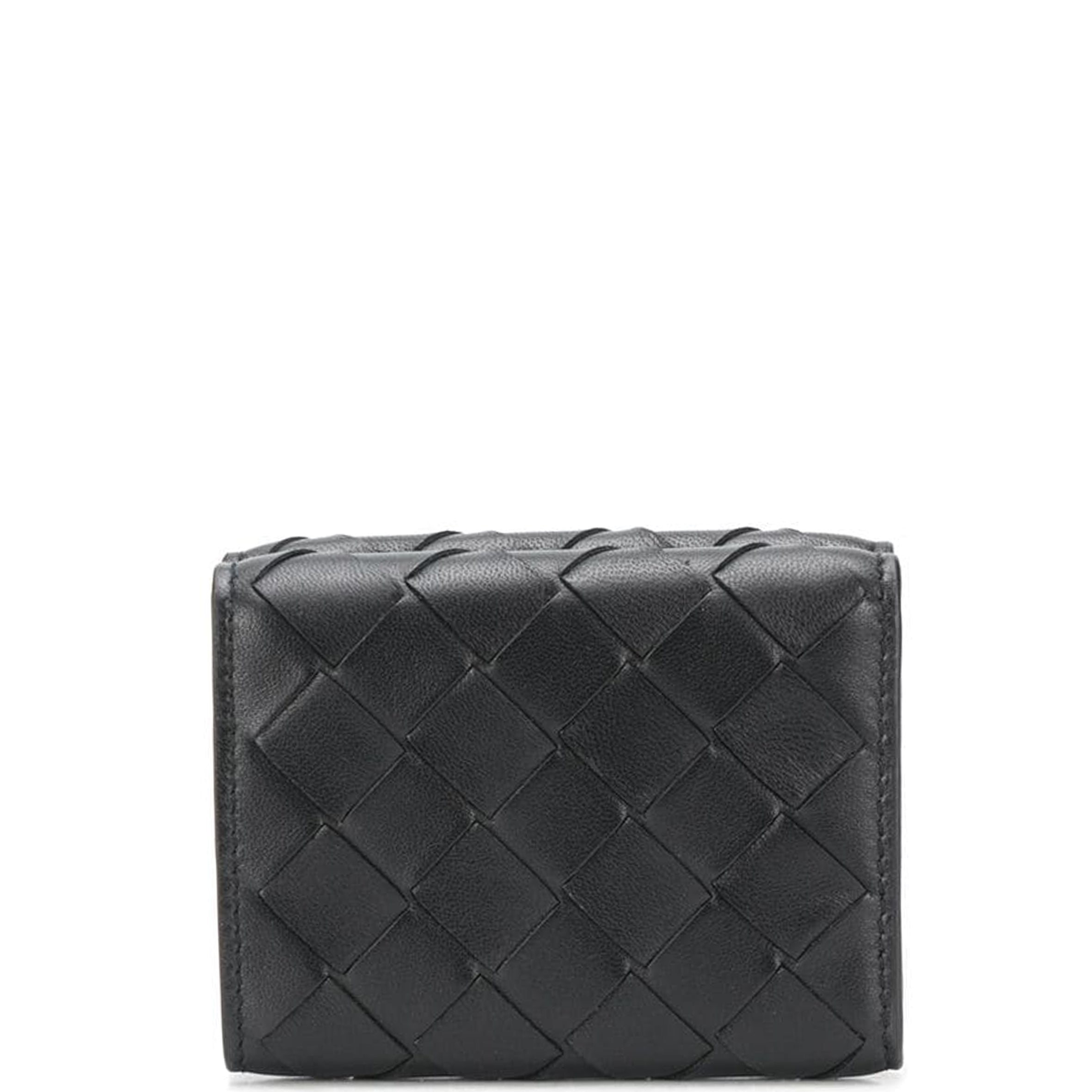 A mini tri-fold wallet in intrecciato leather with six card slots, one bill compartment and exterior coin pocket. Press-stud fastening.