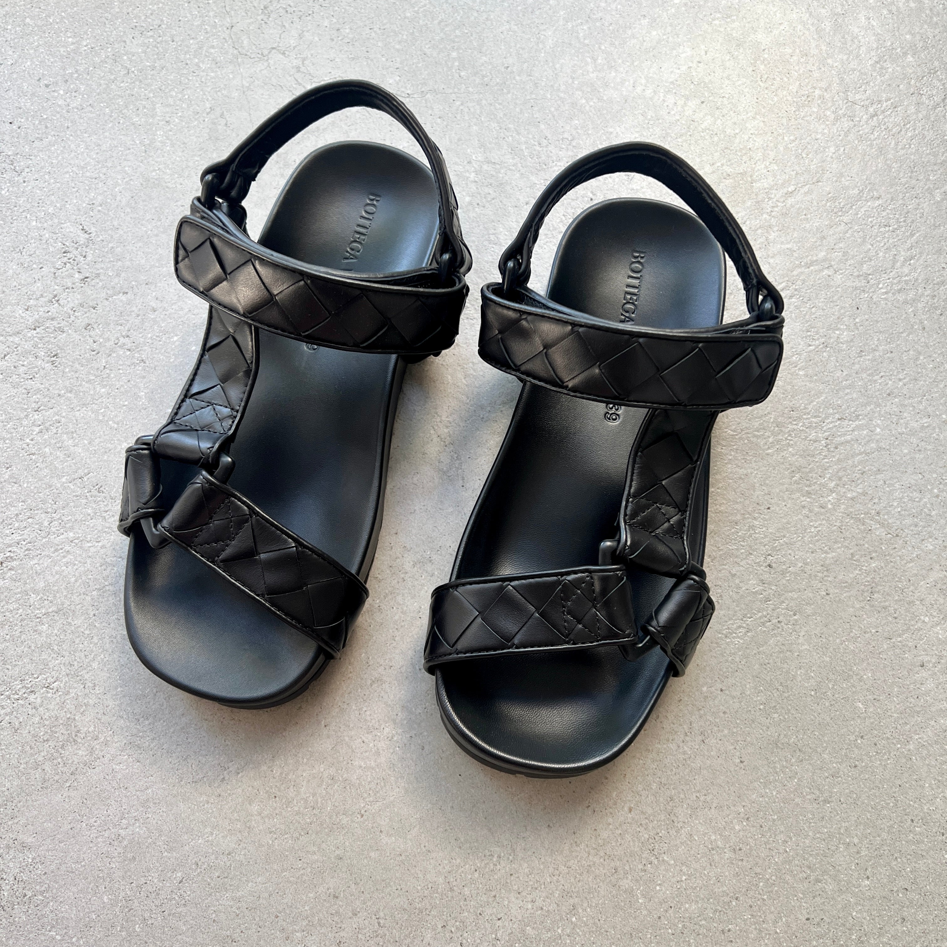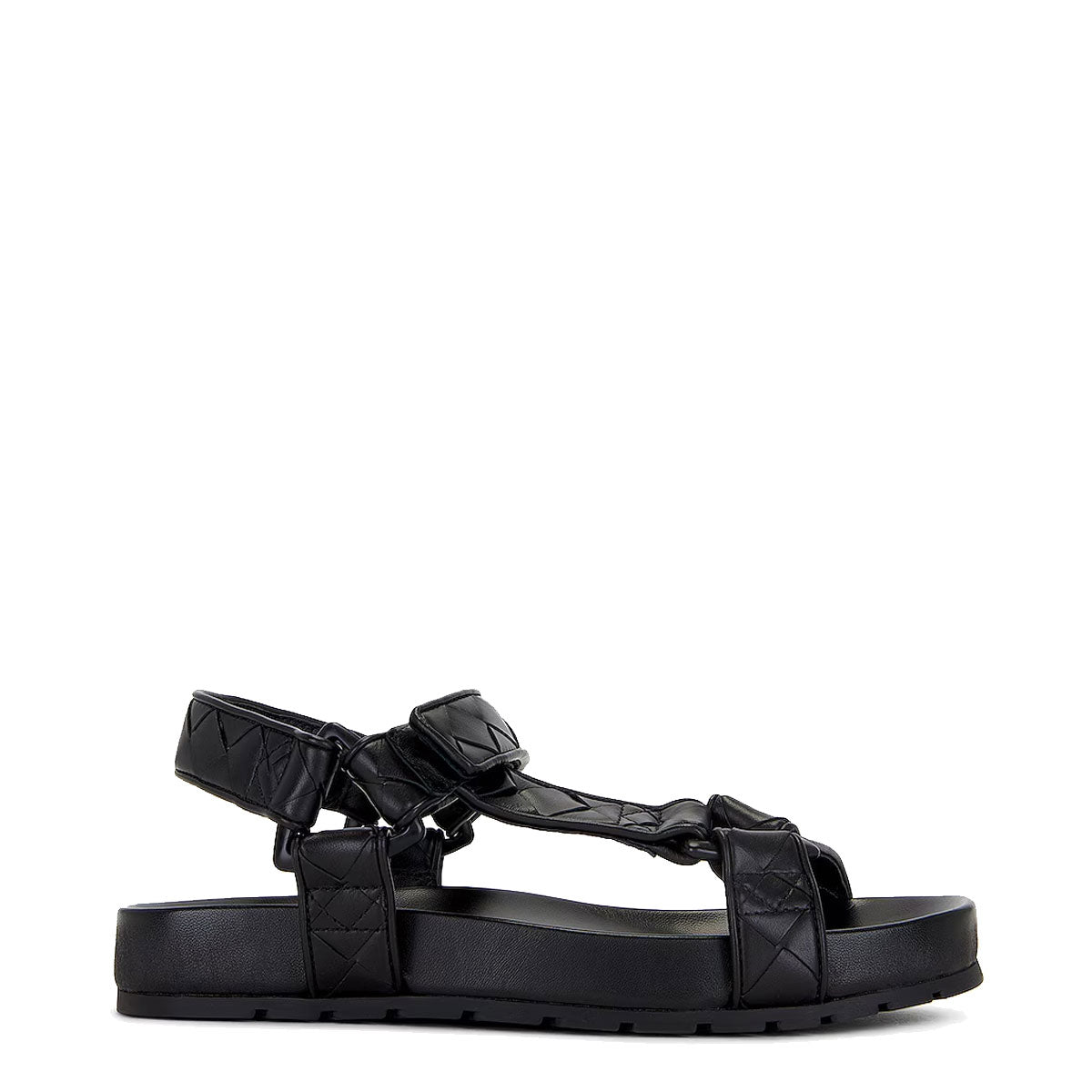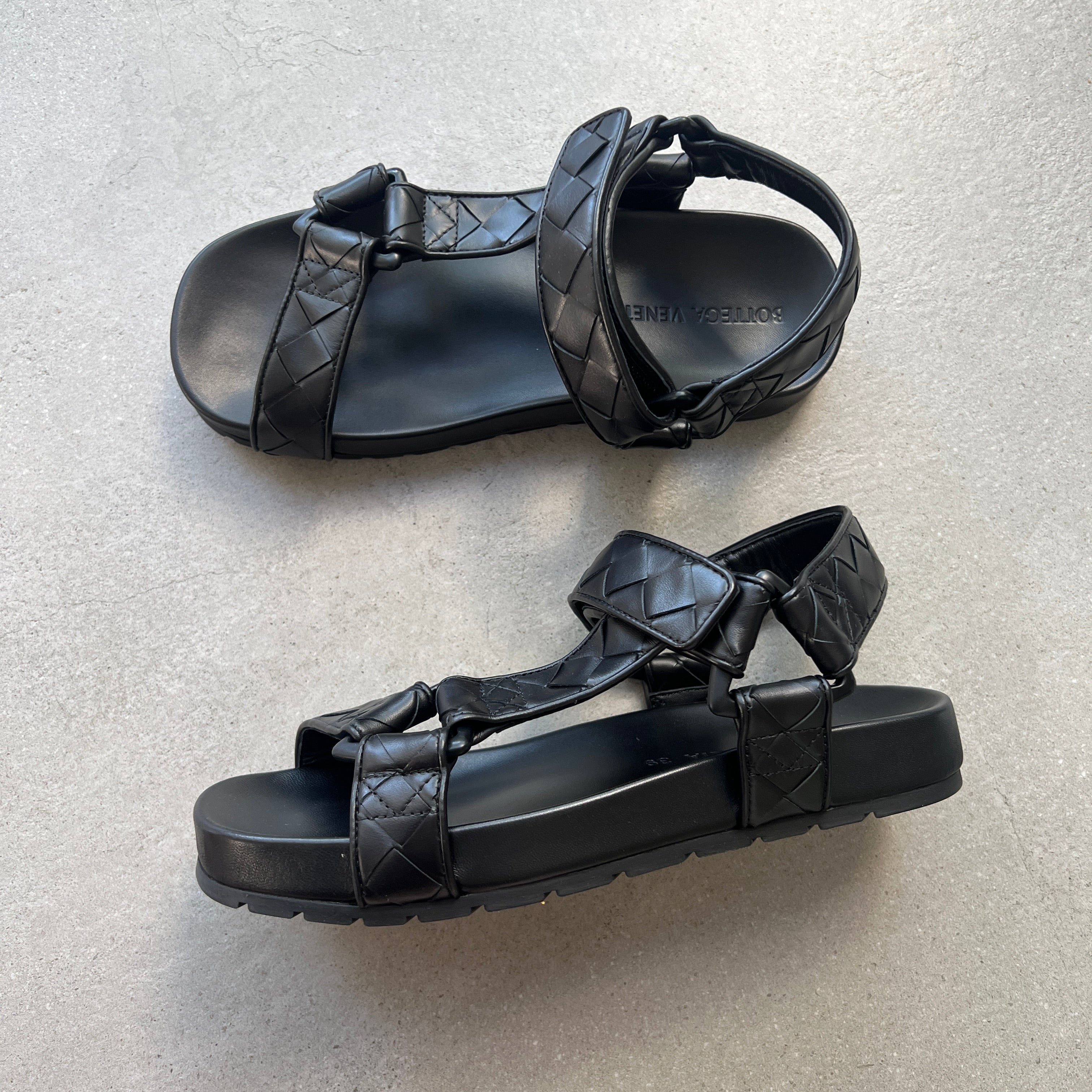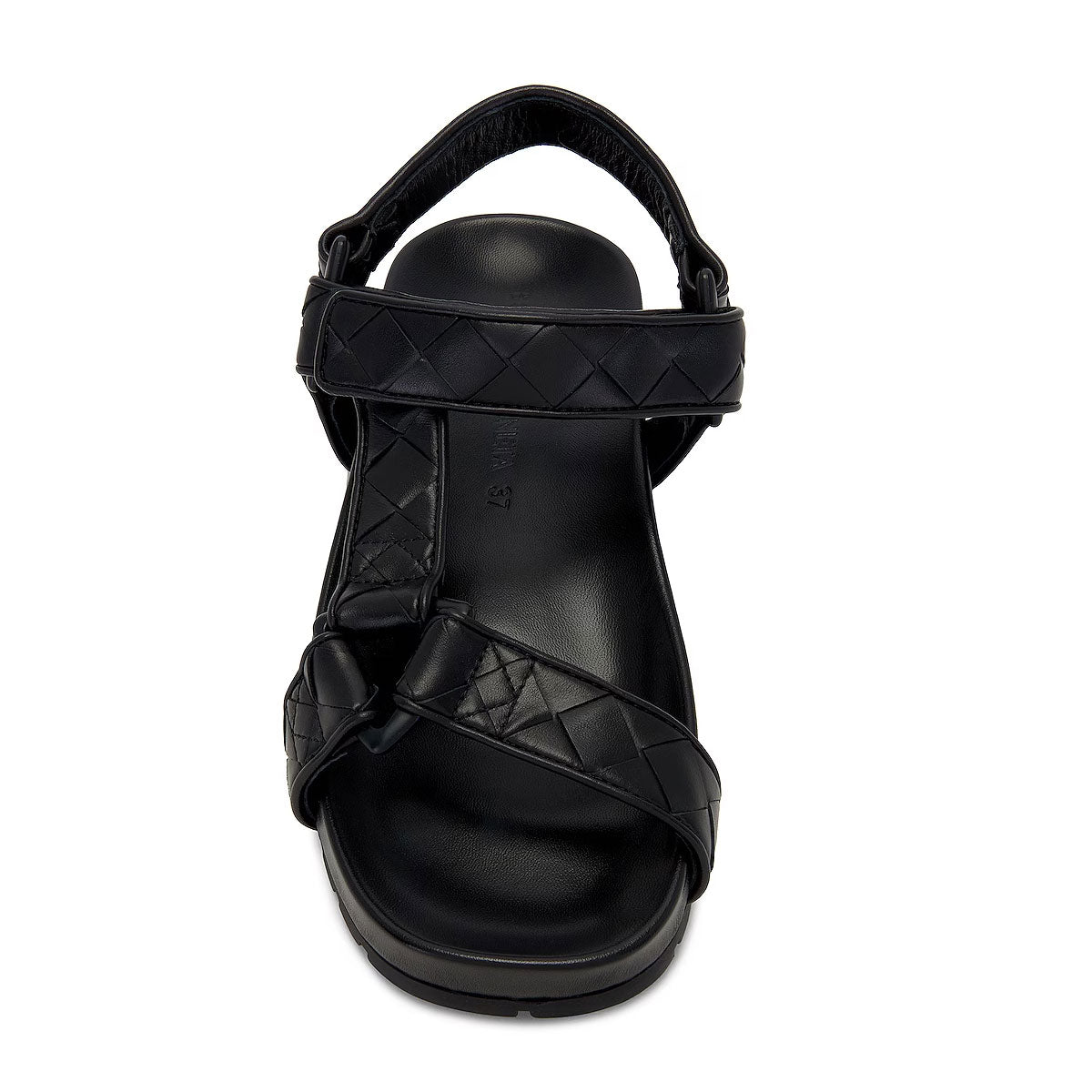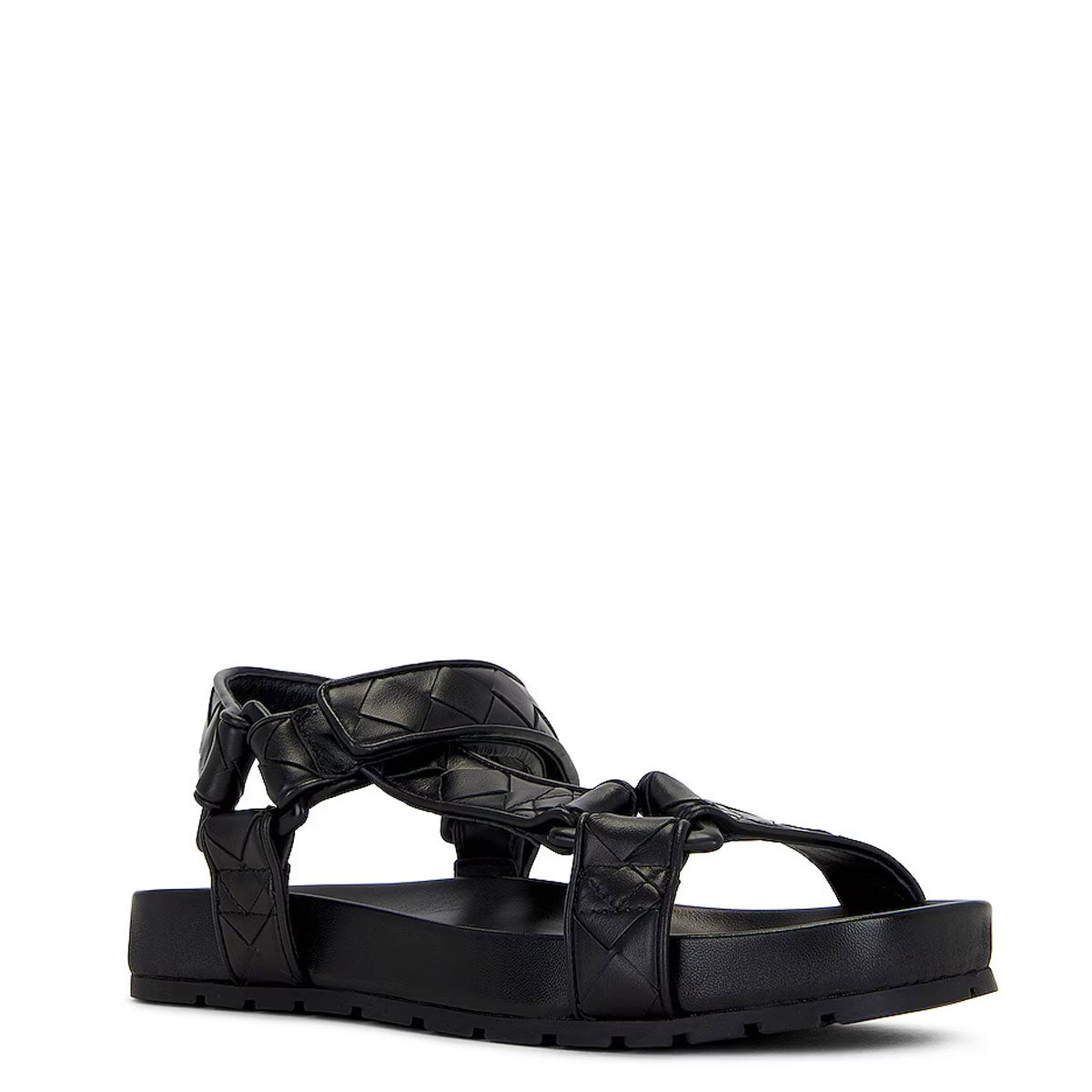 Bottega Veneta's iconic Intrecciato leather and triangular logo form the straps and interlinking metalwork of these sporty black sandals. Unisex Sandal.