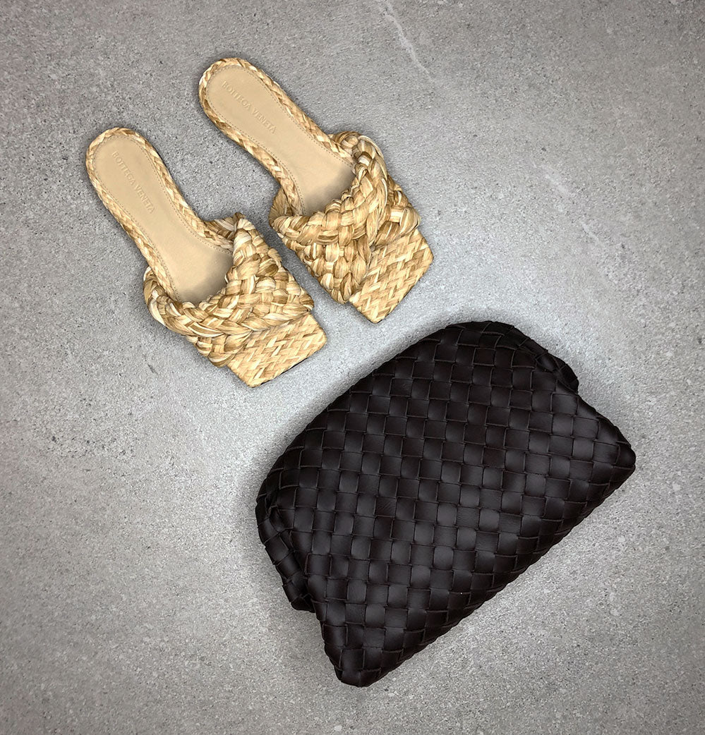 Bottega Veneta Flat sandals with twisted Intrecciato raffia strap. Featuring a squared toe, stacked leather heel and rubber-injected leather sole.