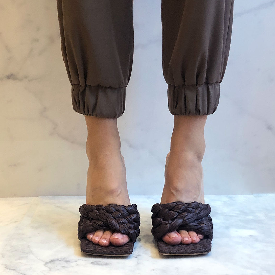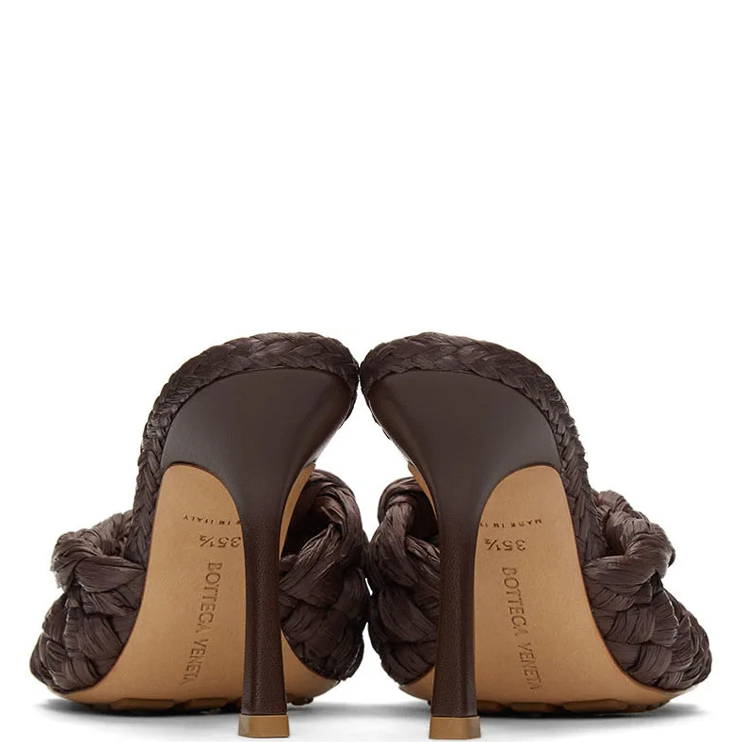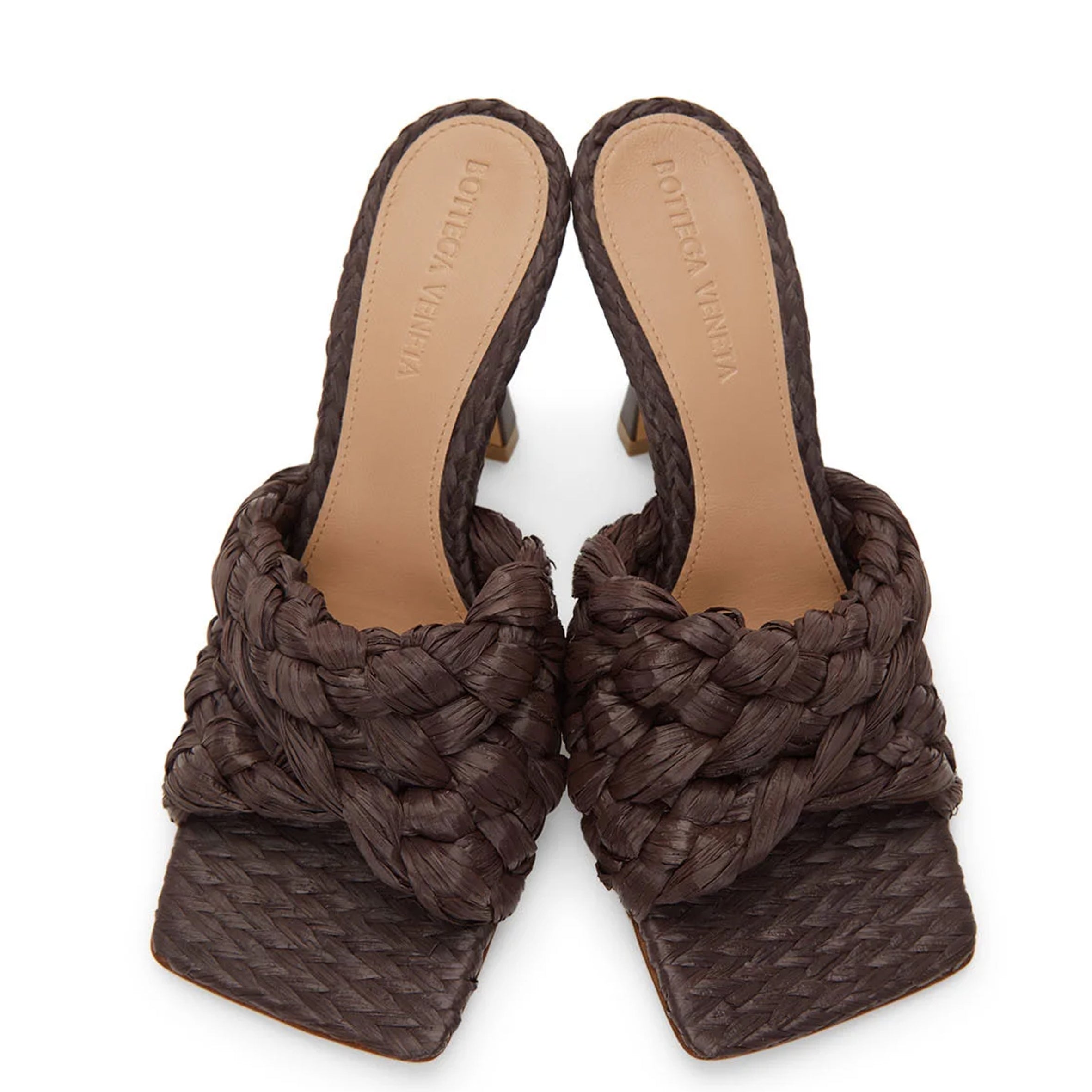 Signature Intrecciato-woven raffia slip-on heeled sandals in Bitter Choc. Open square toe. Logo embossed at beige buffed leather footbed. Covered stiletto heel. Leather sole in tan with pebbled rubber injections.