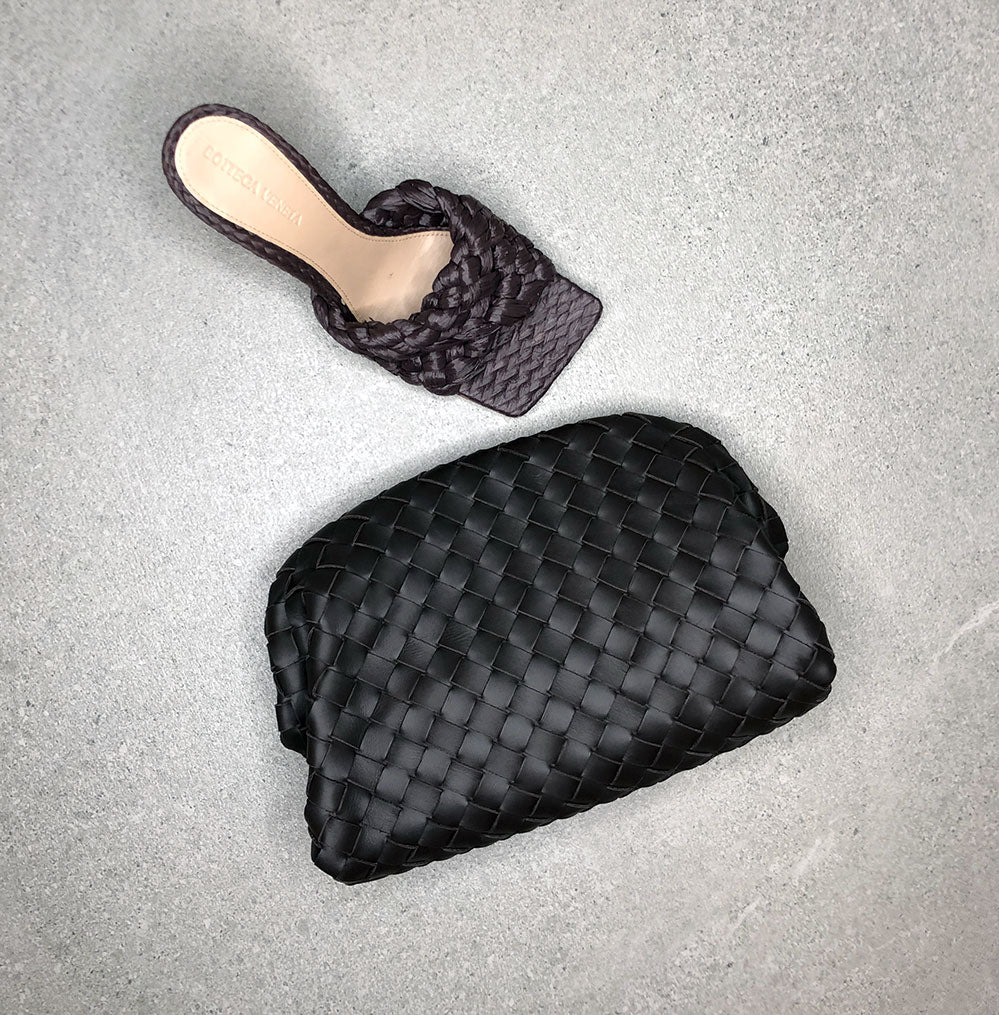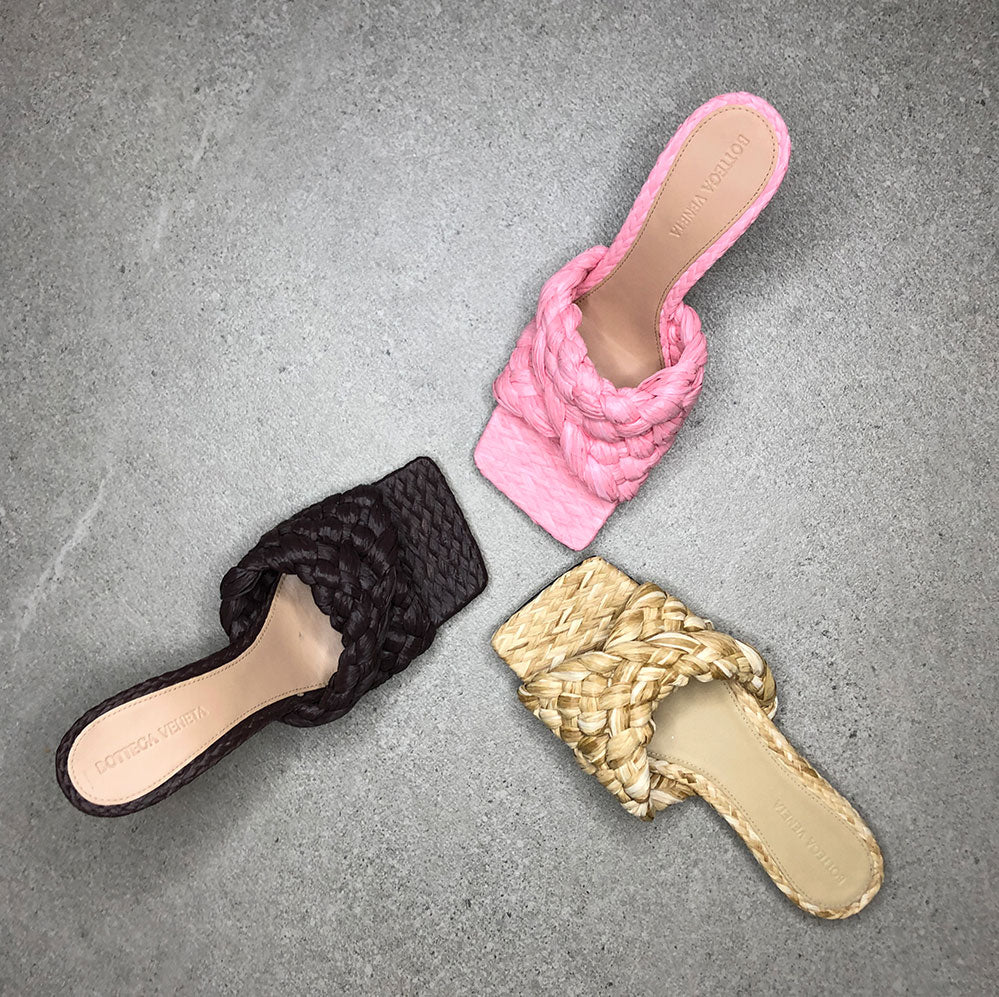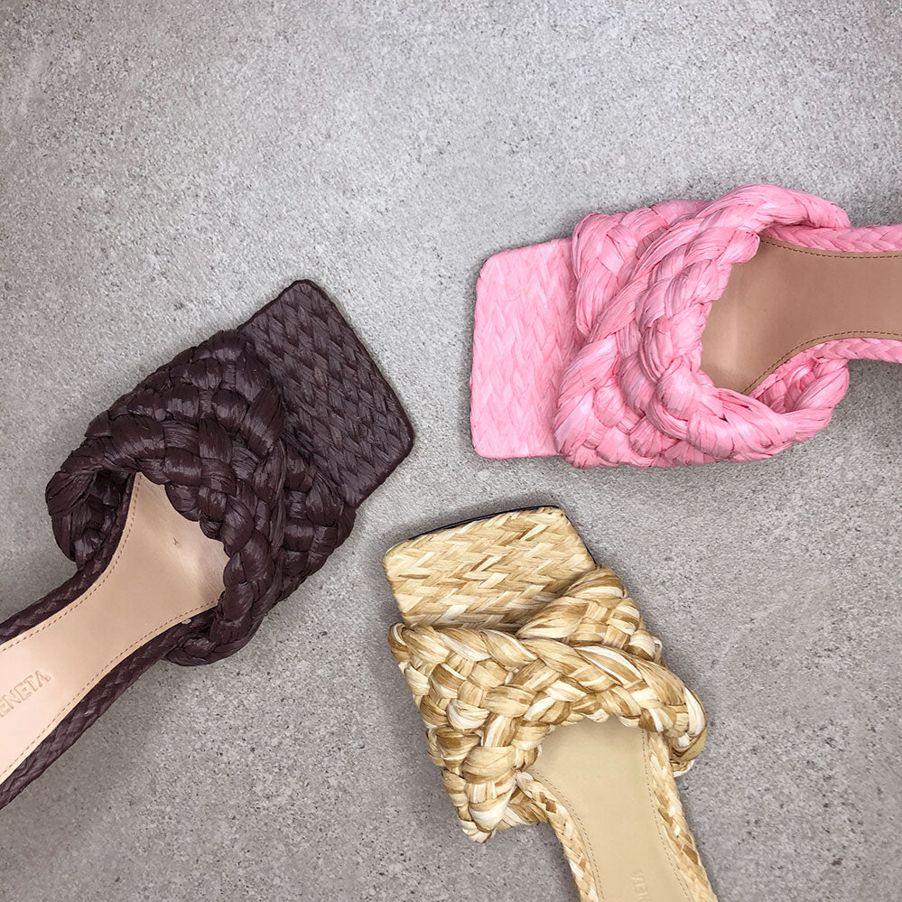 Signature Intrecciato-woven raffia slip-on heeled sandals in Bitter Choc. Open square toe. Logo embossed at beige buffed leather footbed. Covered stiletto heel. Leather sole in tan with pebbled rubber injections.