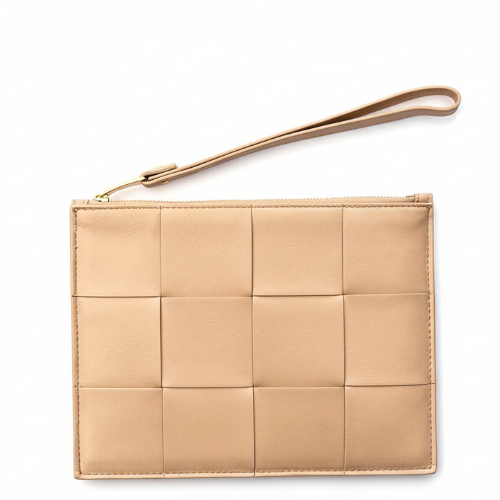 Medium Intreccio leather pouch with zip closure and detachable wristlet. Single interior open pocket, calfskin lining and silver hardware finish.