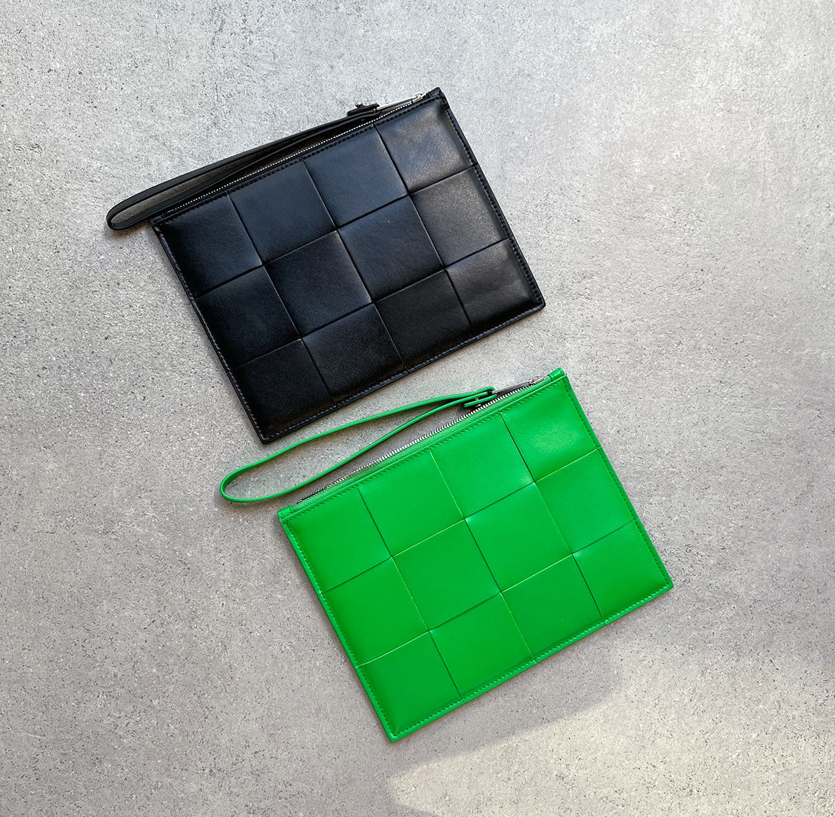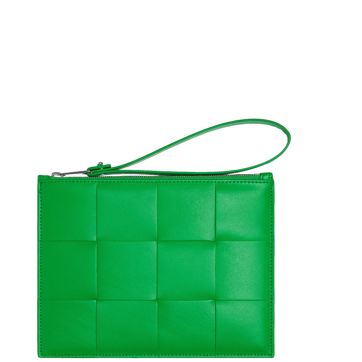 Medium Intreccio leather pouch with zip closure and detachable wristlet. Single interior open pocket, calfskin lining and silver hardware finish.