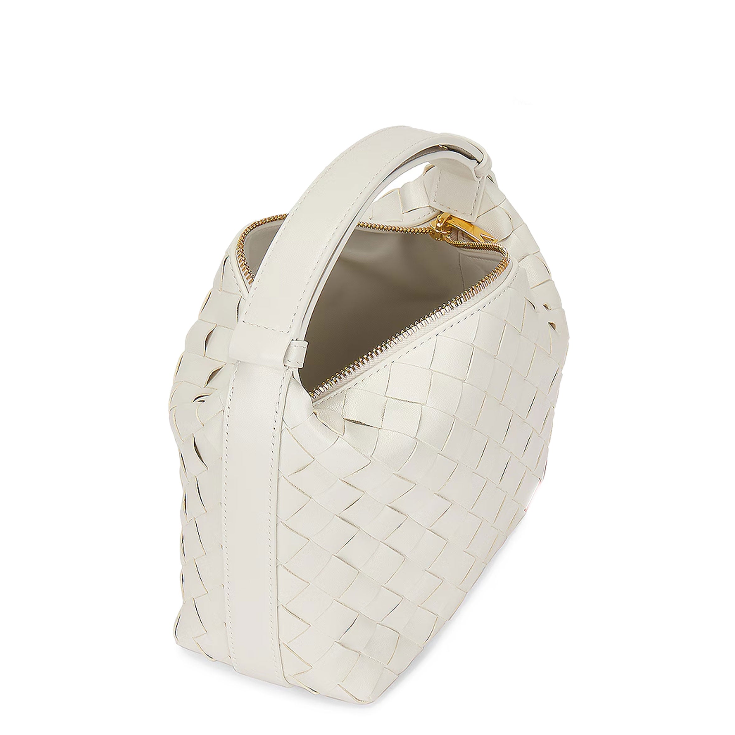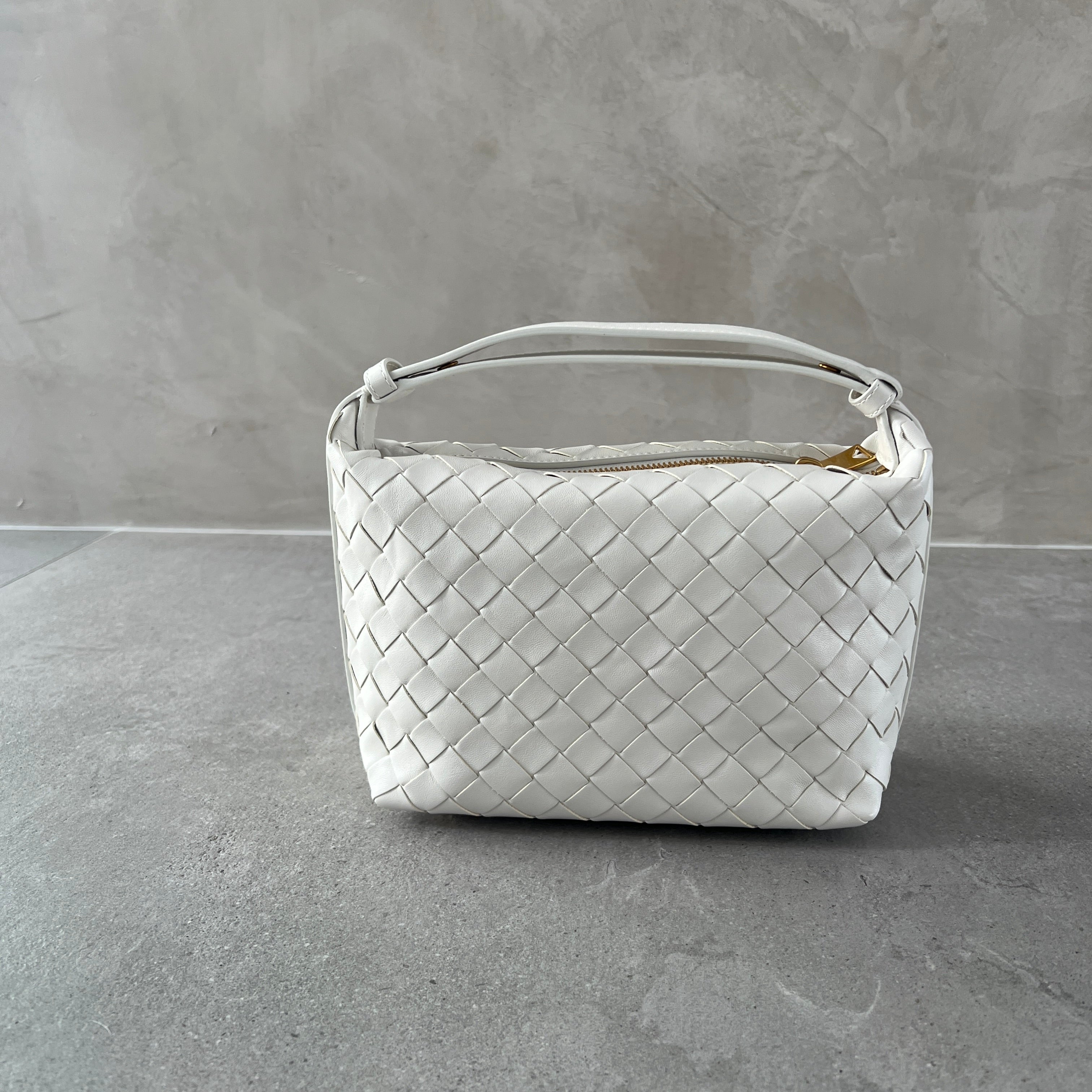 Shoulder bag realised with Intrecciato craftsmanship in soft calfskin leather. Leather shoulder strap features an adjustable press stud.