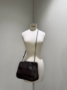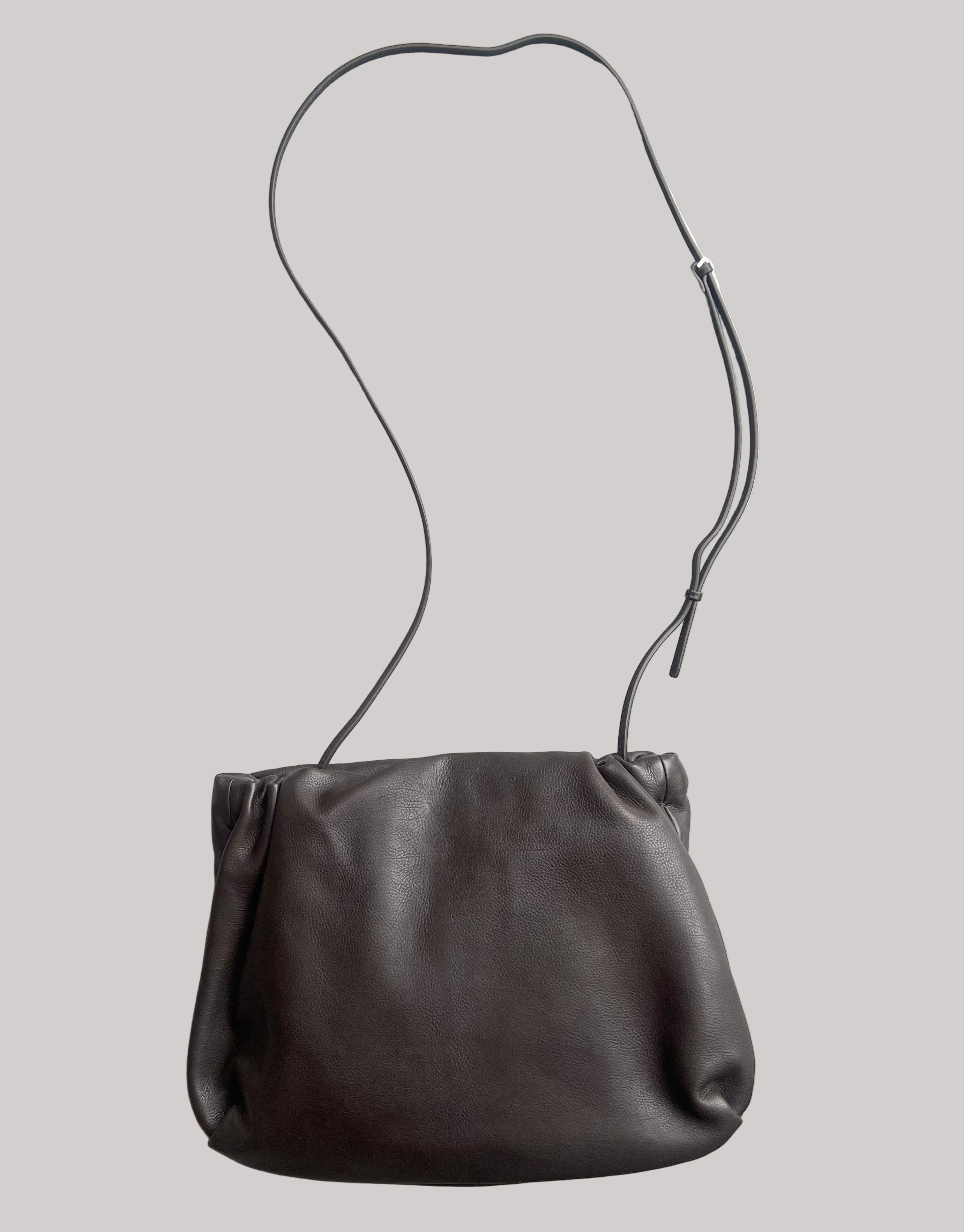 Ruched clutch in finely grained calfskin leather with hidden adjustable shoulder strap and hinged frame closure. Characterized by a buttery-soft hand and subtle sheen, the leather offers a supple texture and refined finish. The is the large size, shown in photo next the smaller classic bourse , both which feature a long adjustable leather strap.