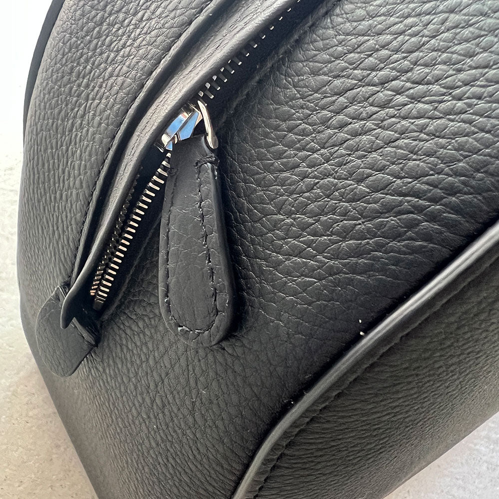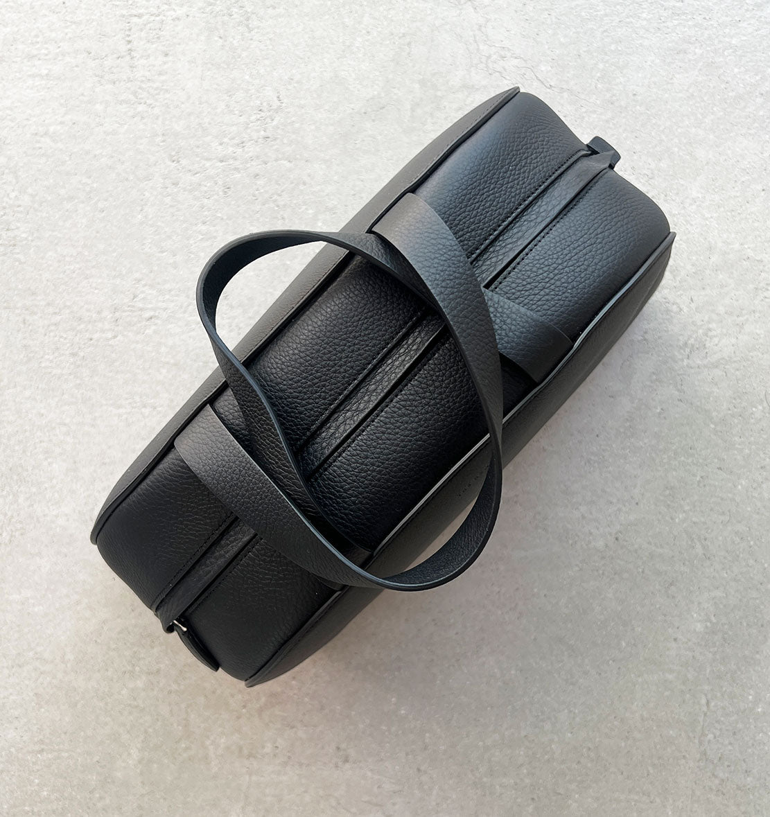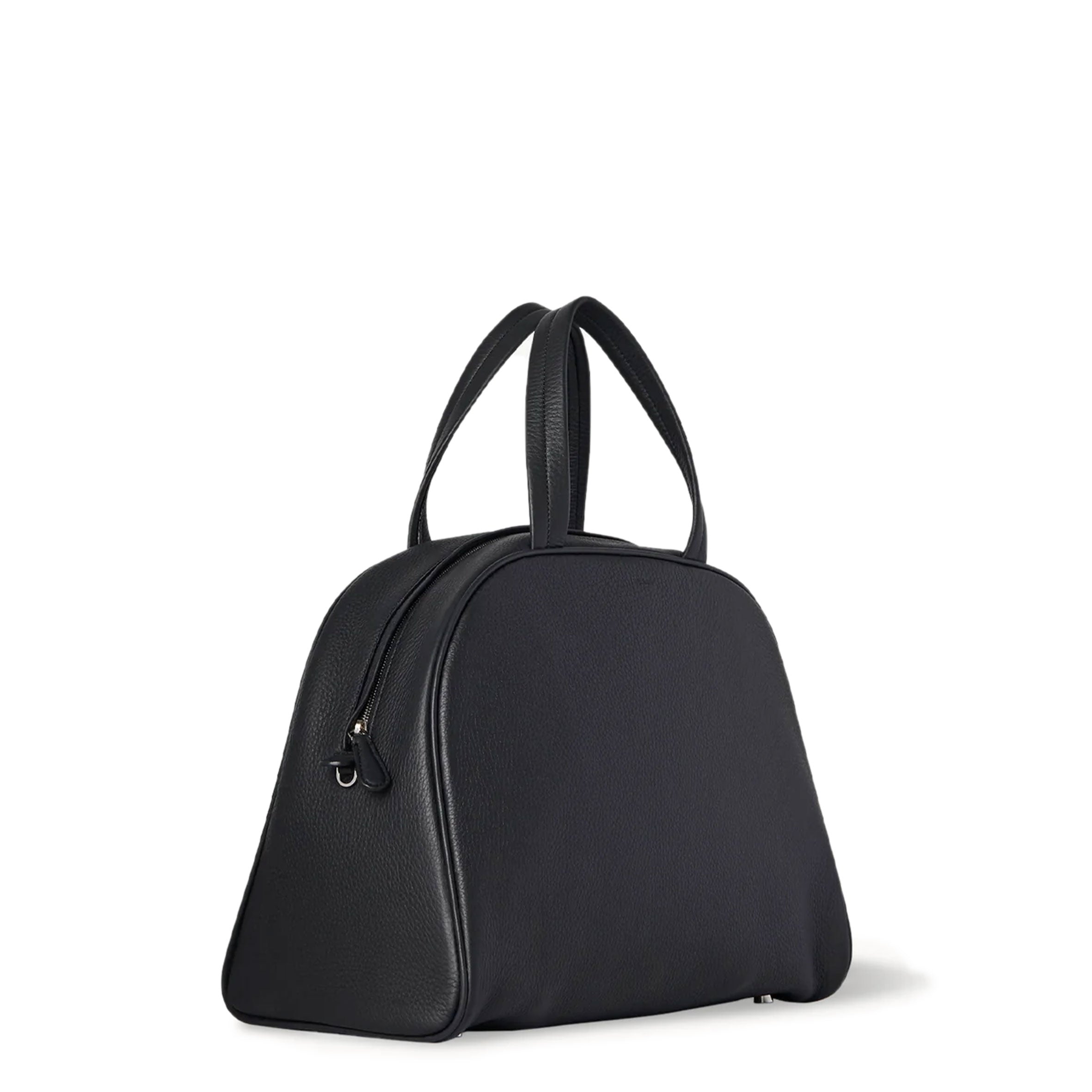 Bowling bag in finely grained calfskin leather with softly rounded shape, zipper closure, and removable shoulder strap.