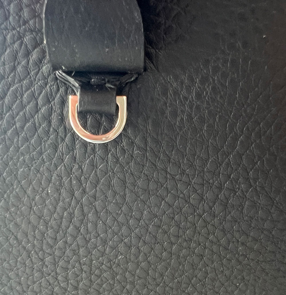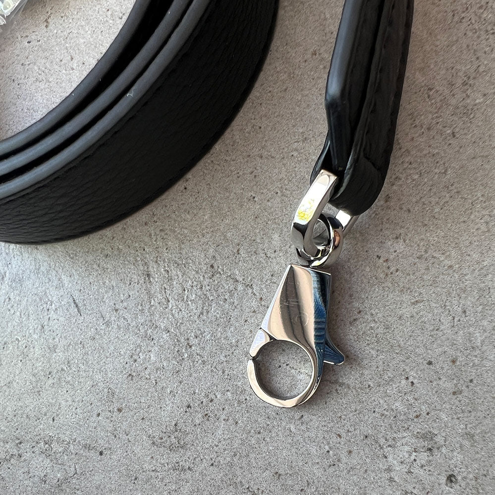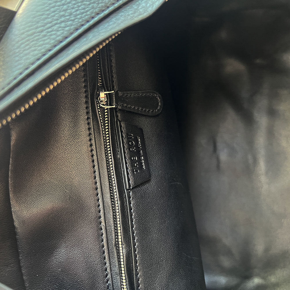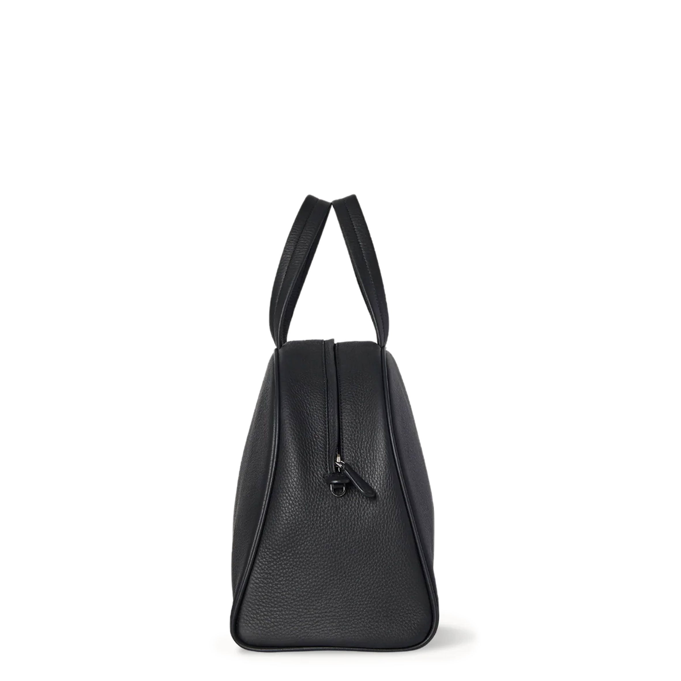Bowling bag in finely grained calfskin leather with softly rounded shape, zipper closure, and removable shoulder strap.