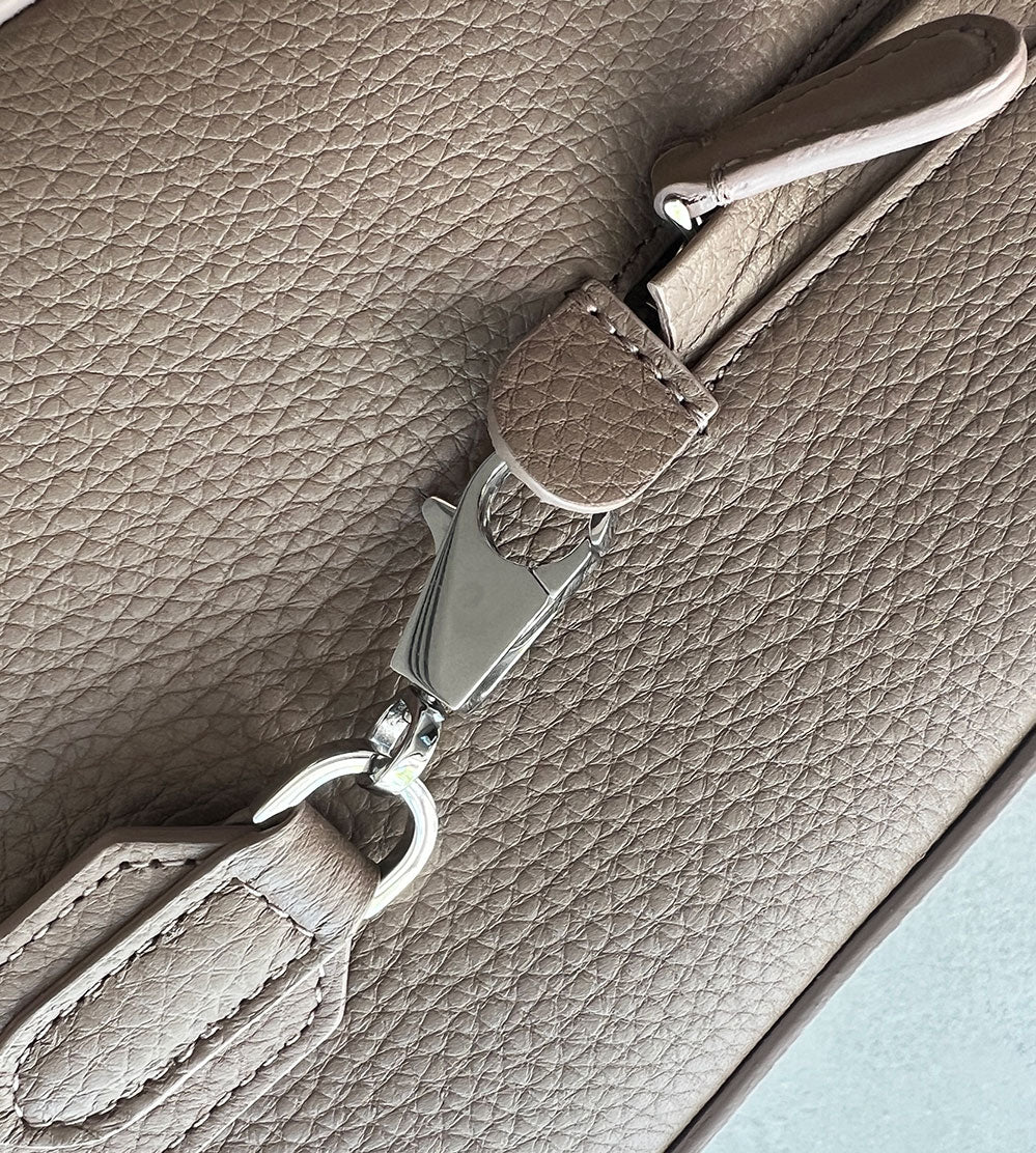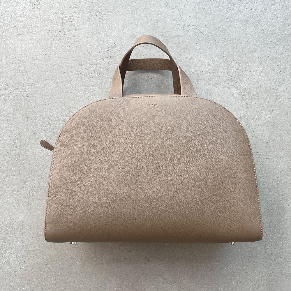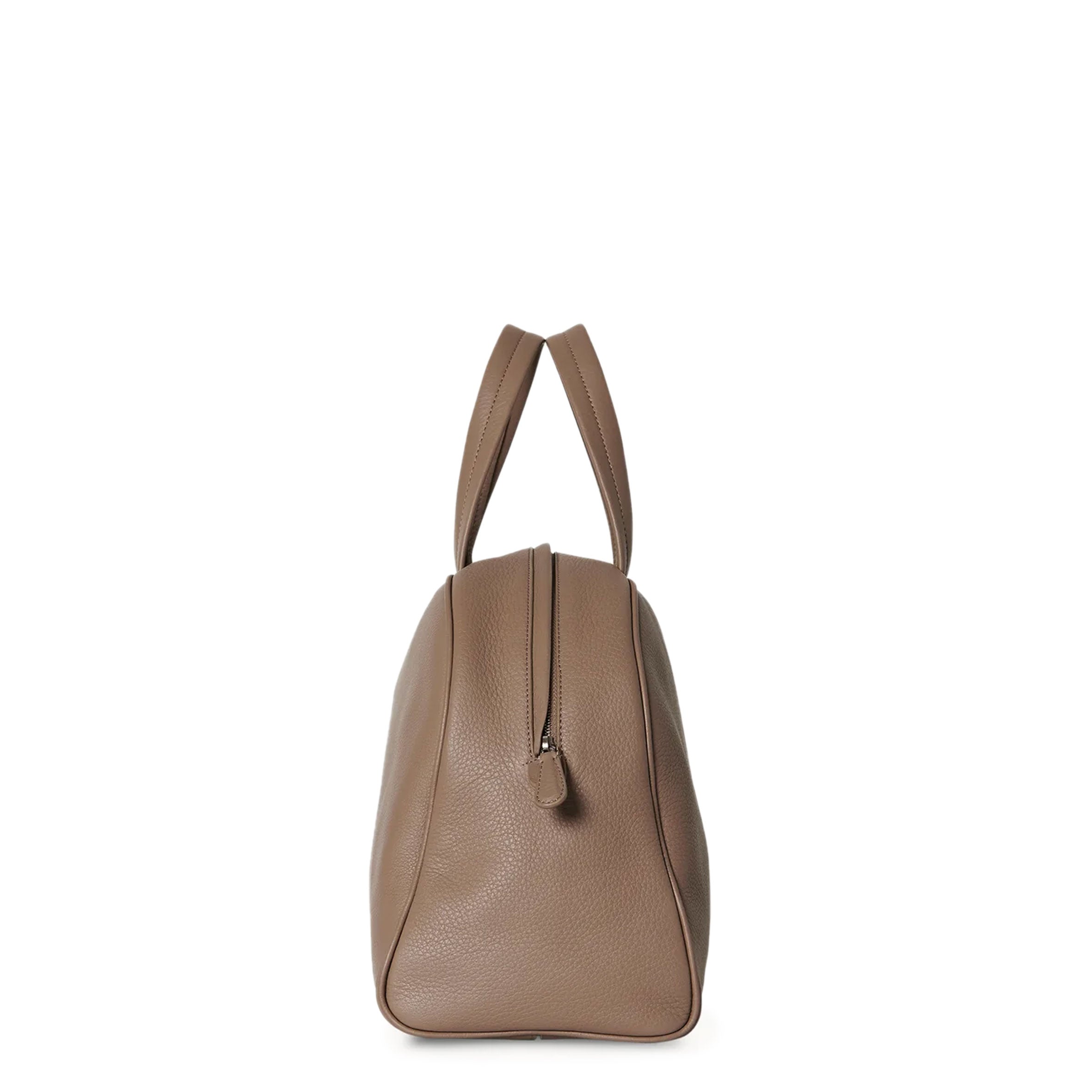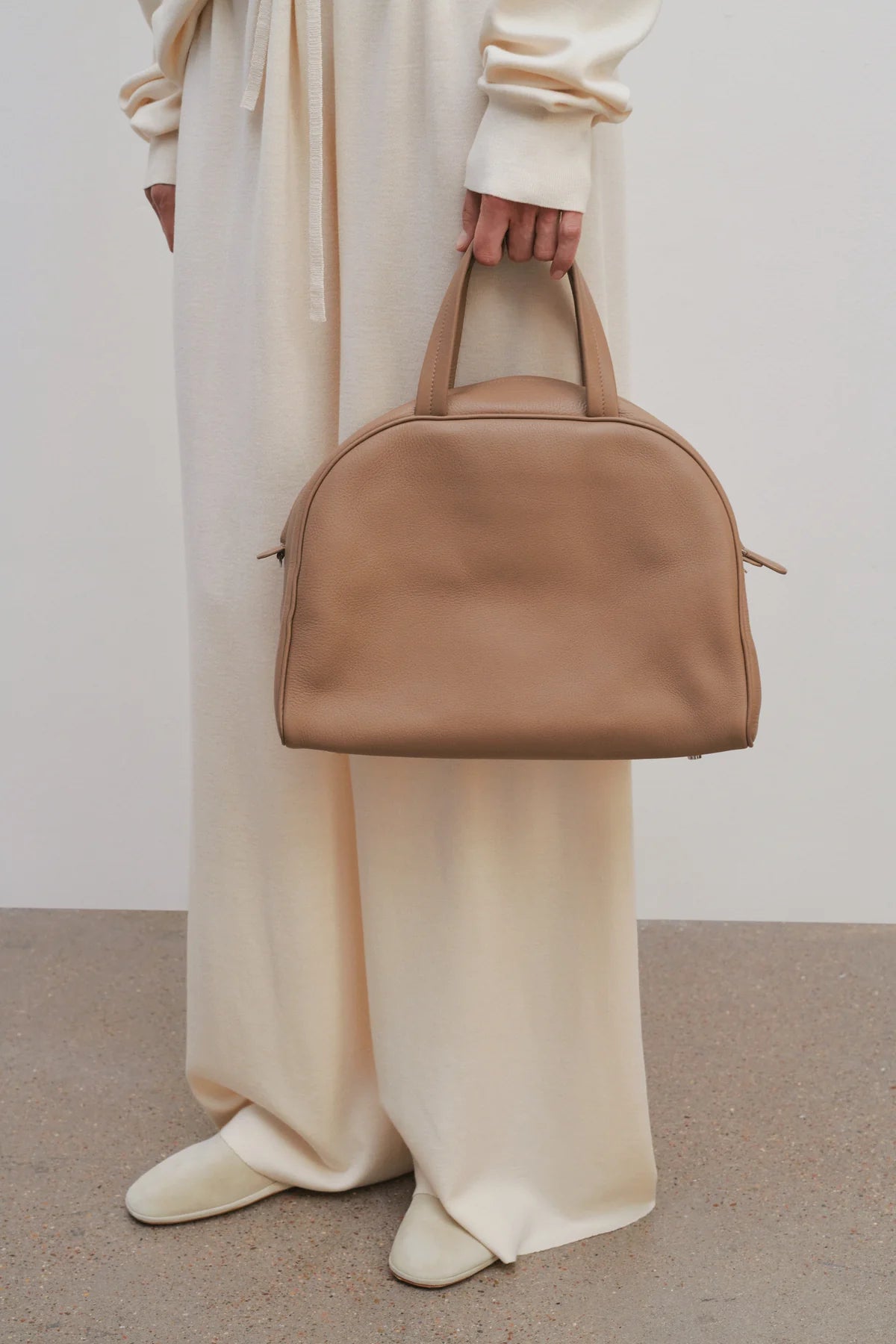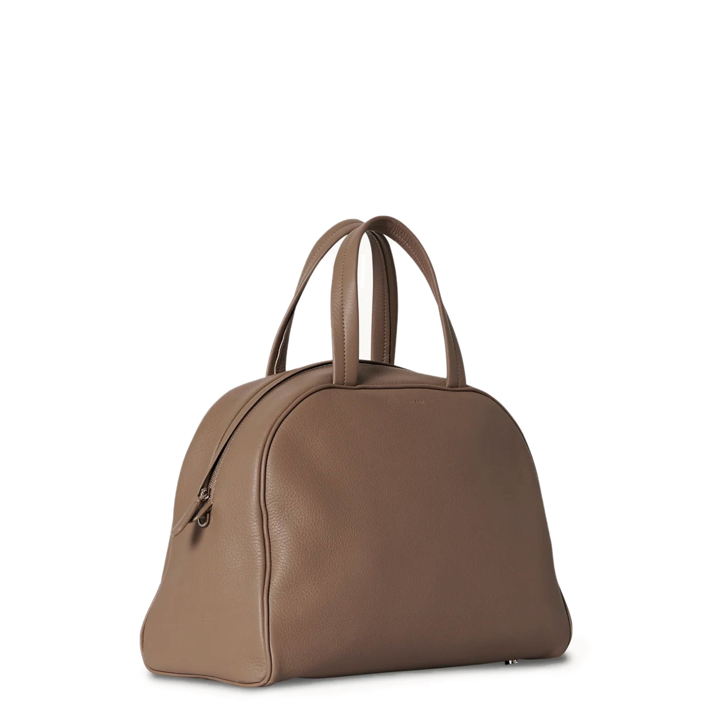 Bowling bag in finely grained calfskin leather with softly rounded shape, zipper closure, and removable shoulder strap.