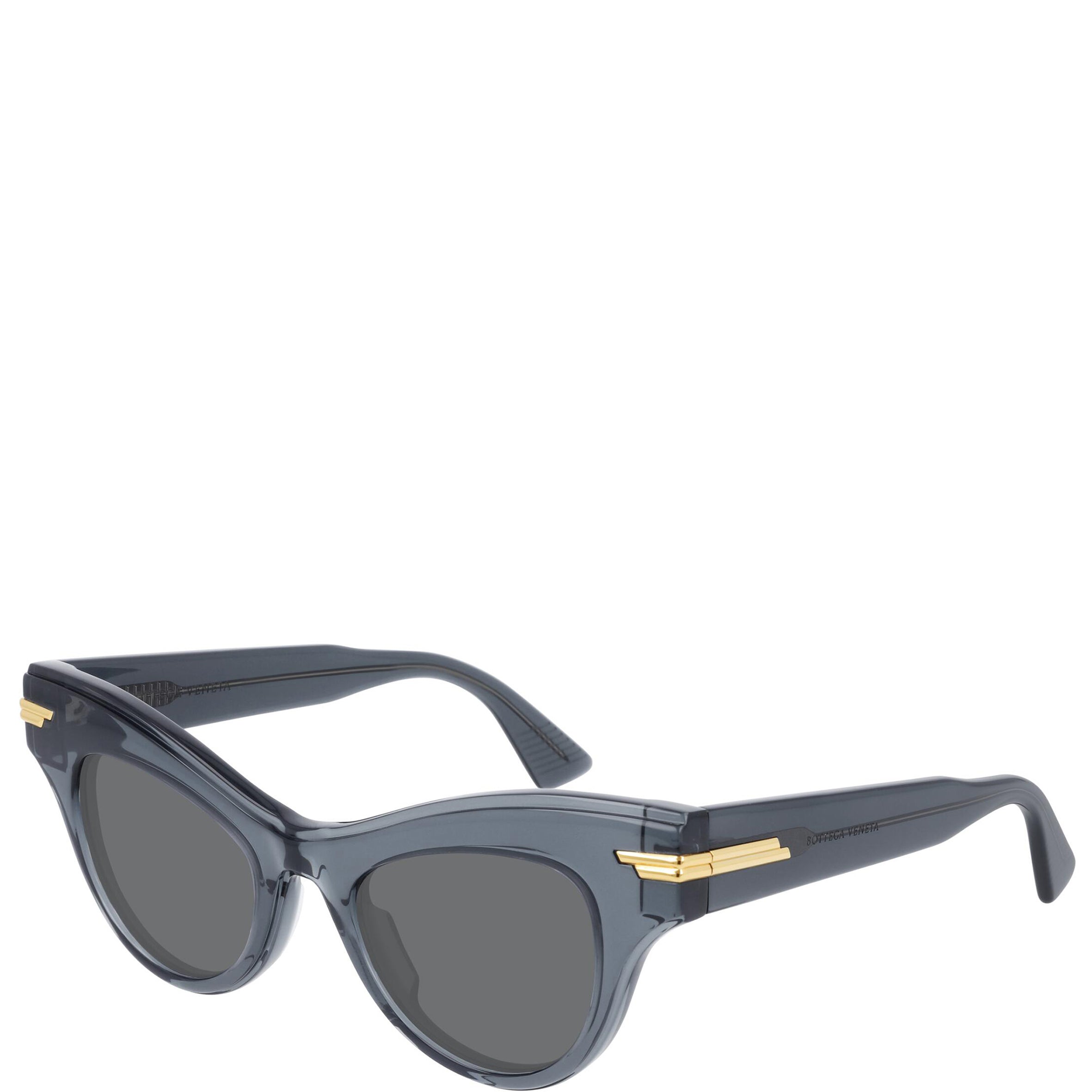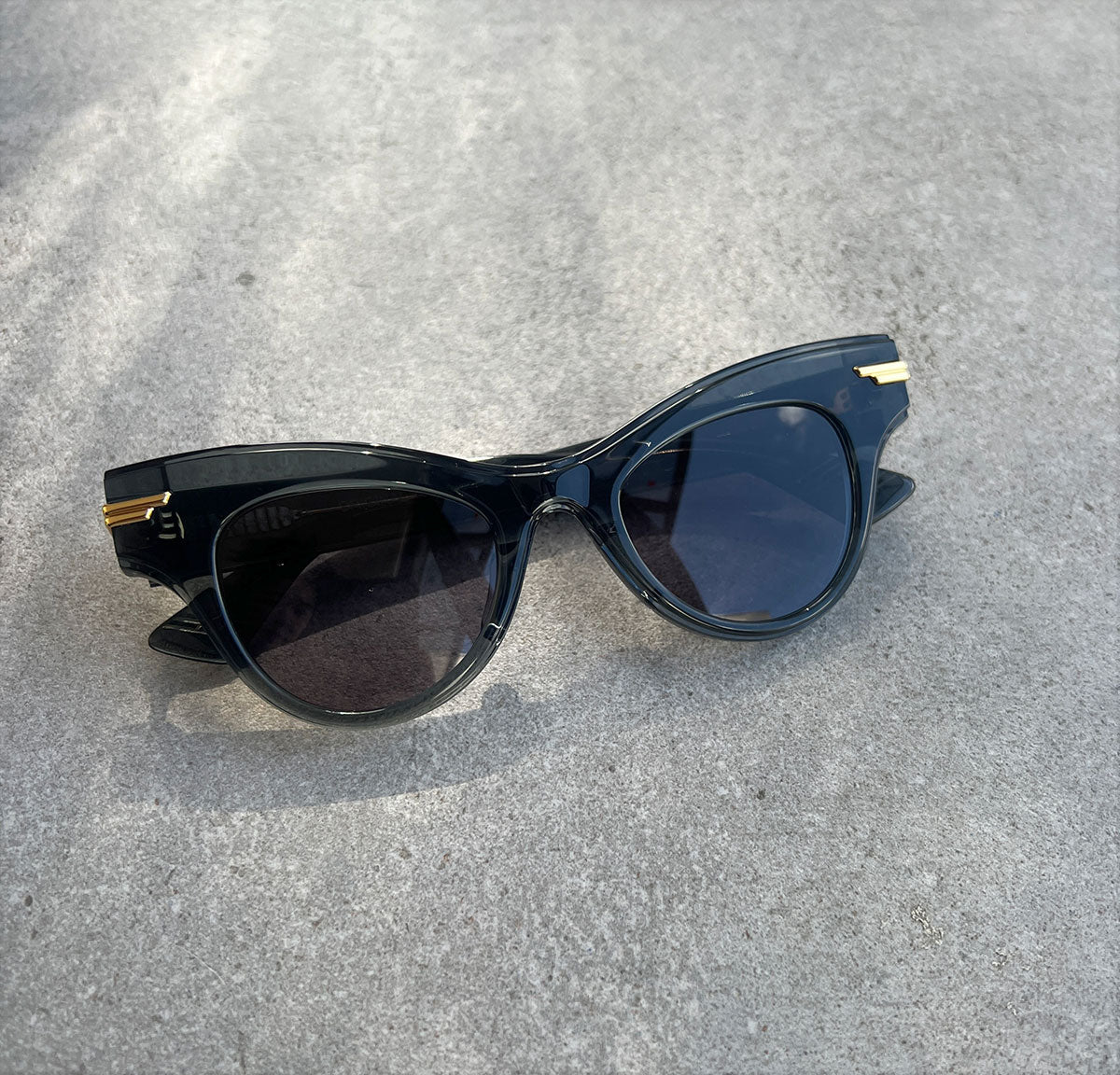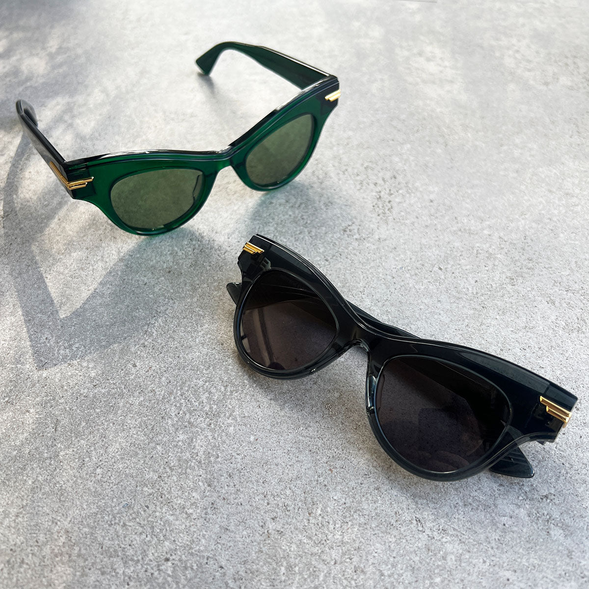 Cat-eye sunglasses in an acetate frame with gold signature ribbon detail on temples.