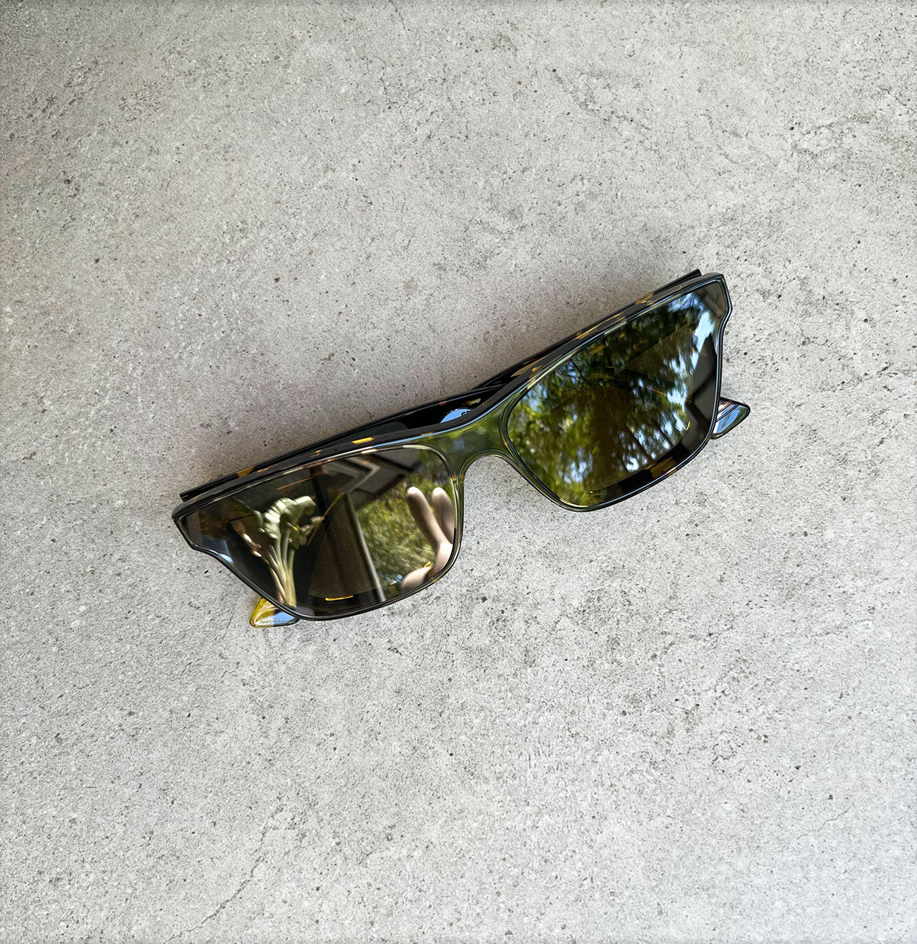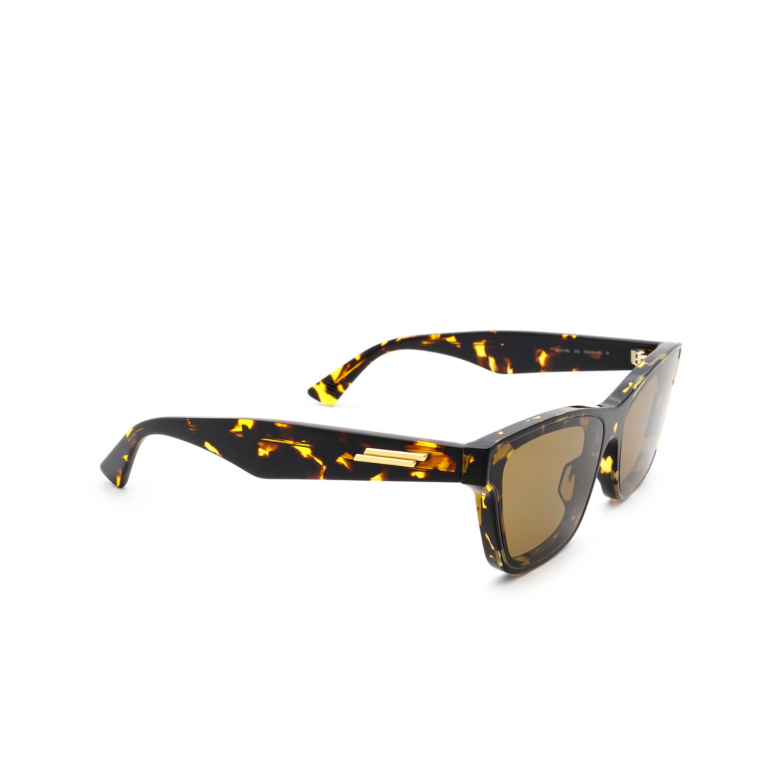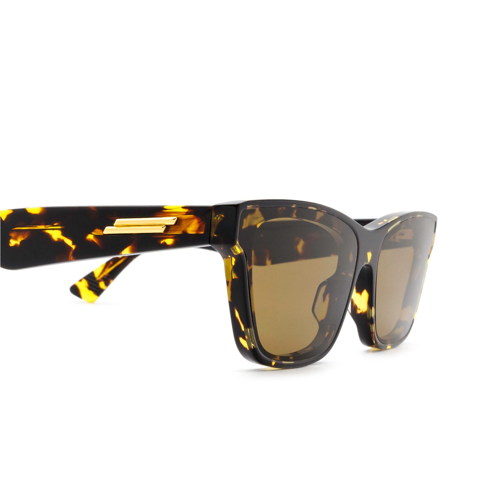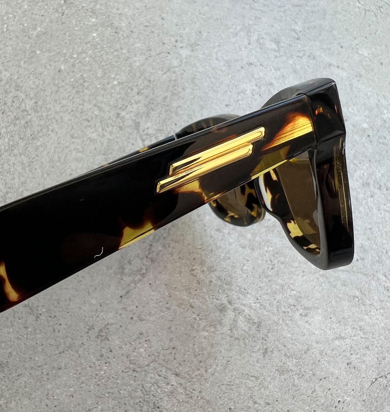 Bottega Veneta BV1119S sunglasses blend a timeless cat-eye shape with the house’s contemporary spirit. Crafted in a luminous Havana acetate, this frame a flattering curved construction, with extended and flush styled warm brown lenses. Wide arms accentuate a luxury feel while a modernized logo, reimagined as two gold bars on the temples, renders a statement finish.